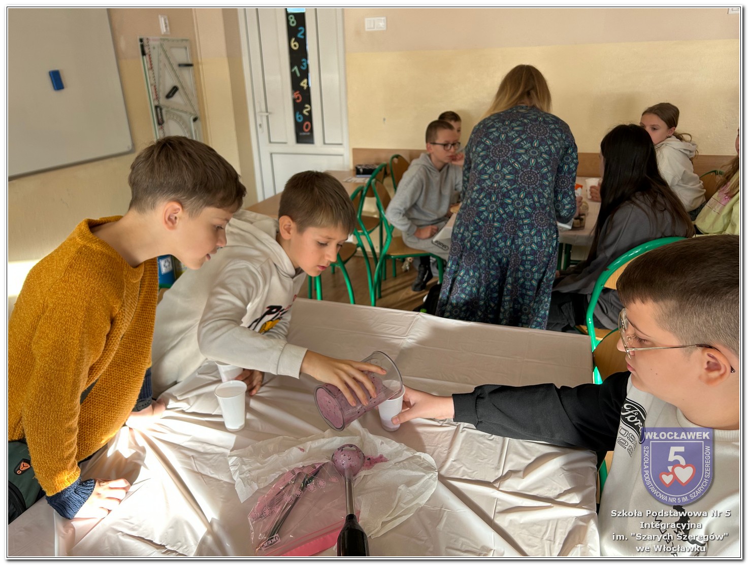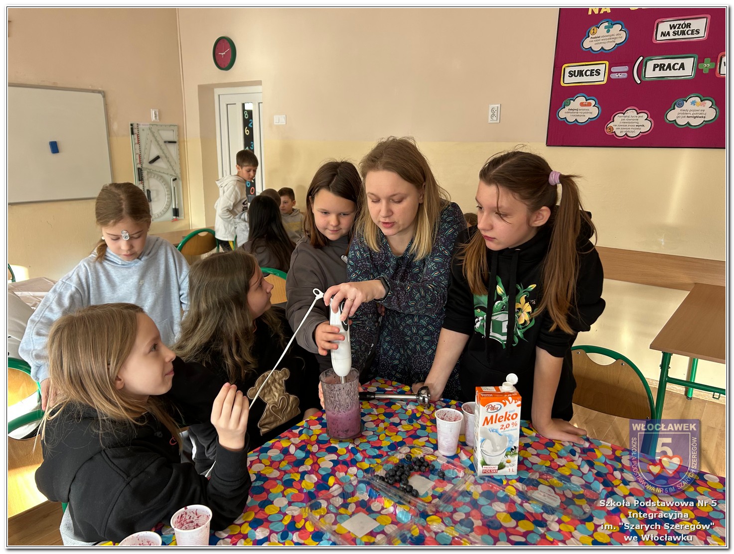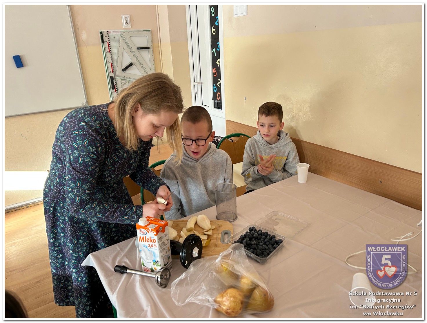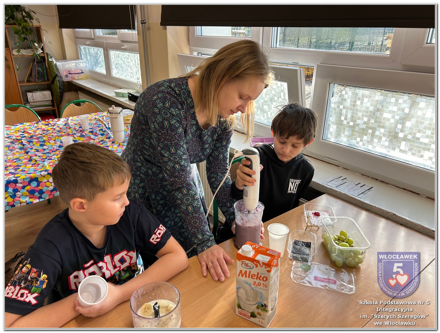 6 listopada zostały przeprowadzone warsztaty pt. „Analiza etykiet produktów spożywczych i obliczanie kalorii składników, ilości białek, tłuszczy. Cukier w diecie”, w ramach projektu „Mierzymy świat – matematyka w naturze”, sfinansowane przez Fundację mBanku w programie mSilnia. Zajęcia zostały przygotowane dla dwóch grup wiekowych – uczniów klas IV–V oraz klas VII–VIII. Podczas warsztatów uczniowie zapoznali się z zasadami zdrowego odżywiania. Poznali dzienne zapotrzebowanie kaloryczne dzieci, młodzieży, osób dorosłych i starszych. Omówiono rolę białek, cukrów, tłuszczów dla organizmu. Dzieci same uznały, że w ich diecie znajduje się dużo cukrów. Wykreślały z wykreślanki nazwy bakalii, które są smaczne, zdrowe i jednocześnie zawierają w sobie cukry. Dzieci wspólnie z nauczycielami stwierdziły, że doskonałą alternatywą dla słodkich przekąsek mogą być zdrowe i pożywne koktajle. Uczniowie najpierw obliczyli zadania matematyczne, których rozwiązanie okazało się przepisem na koktajl, a następnie według własnego uznania dobierały ulubione owoce takie jak: borówki, jeżyny, banany, gruszki, winogrona, czy maliny. Warsztaty okazały się nie tylko świetną zabawą, ale też ciekawym sposobem na naukę matematyki w praktyce oraz zrozumienie, że nasza dieta ma ogromny wpływ na funkcjonowanie organizmu.