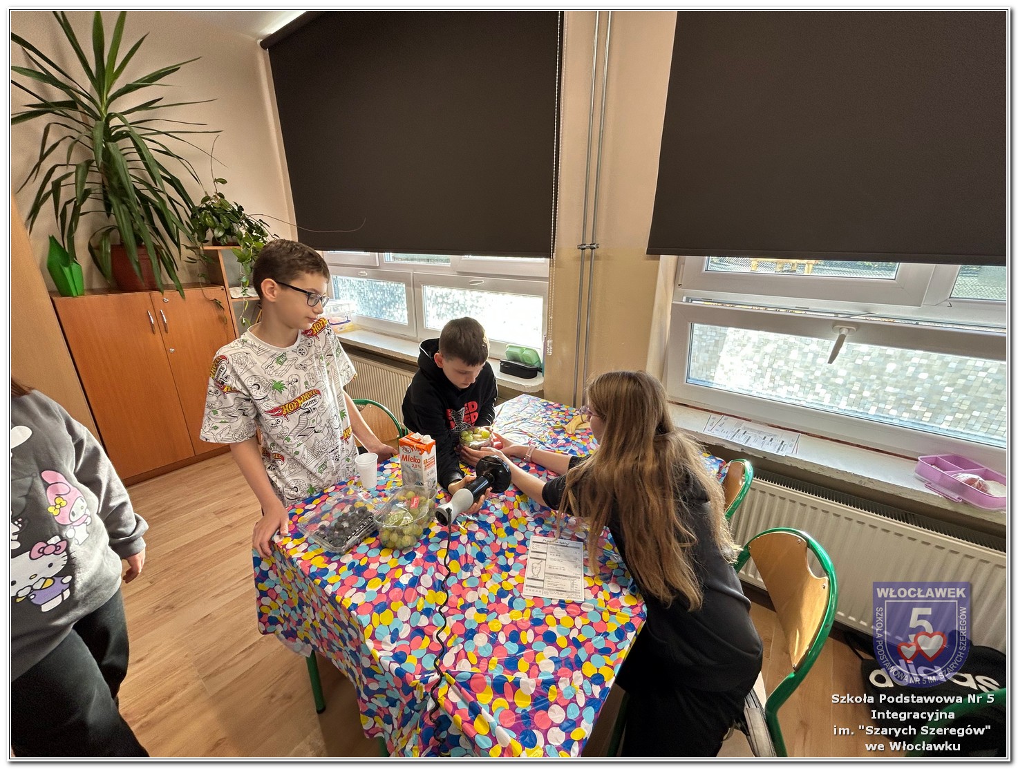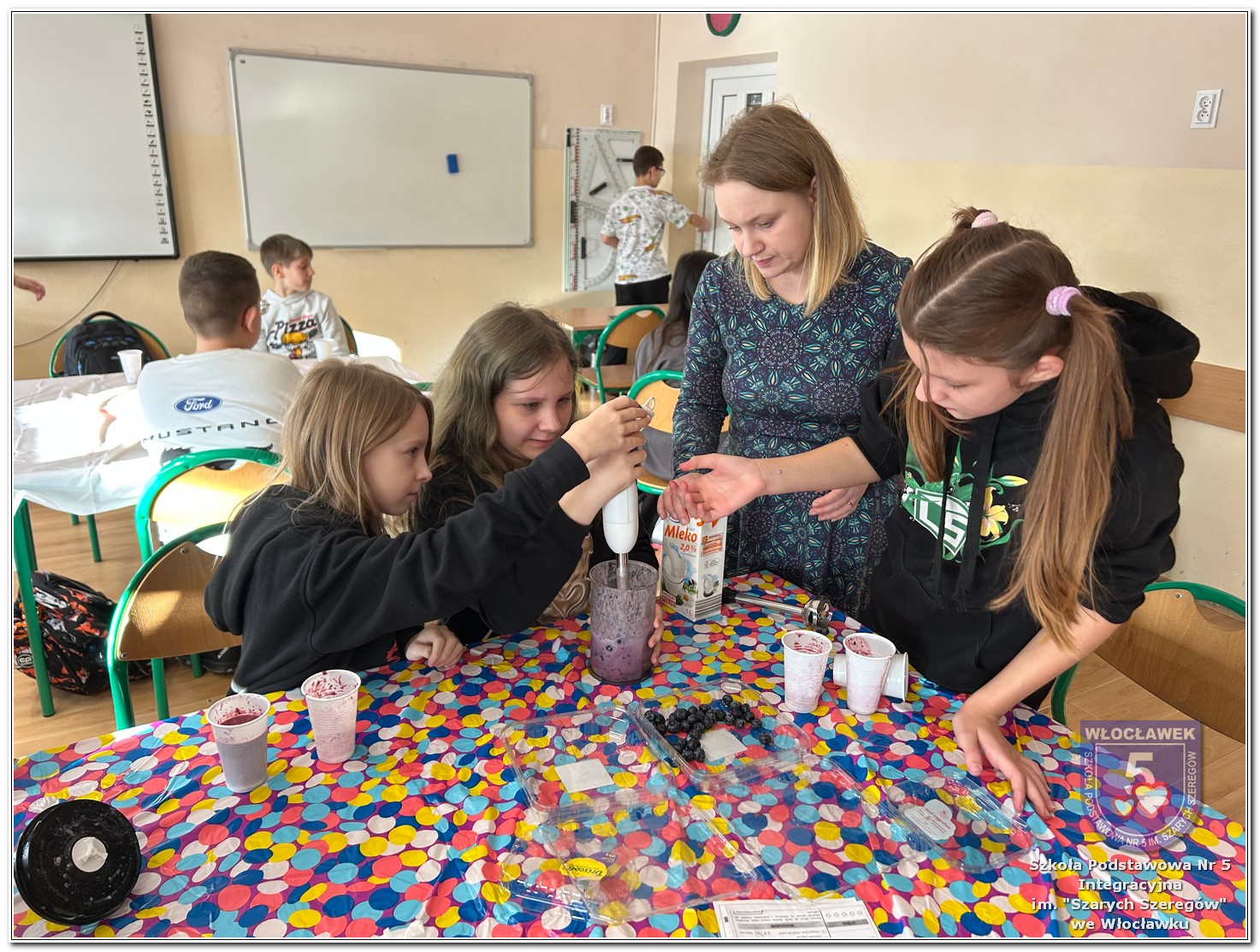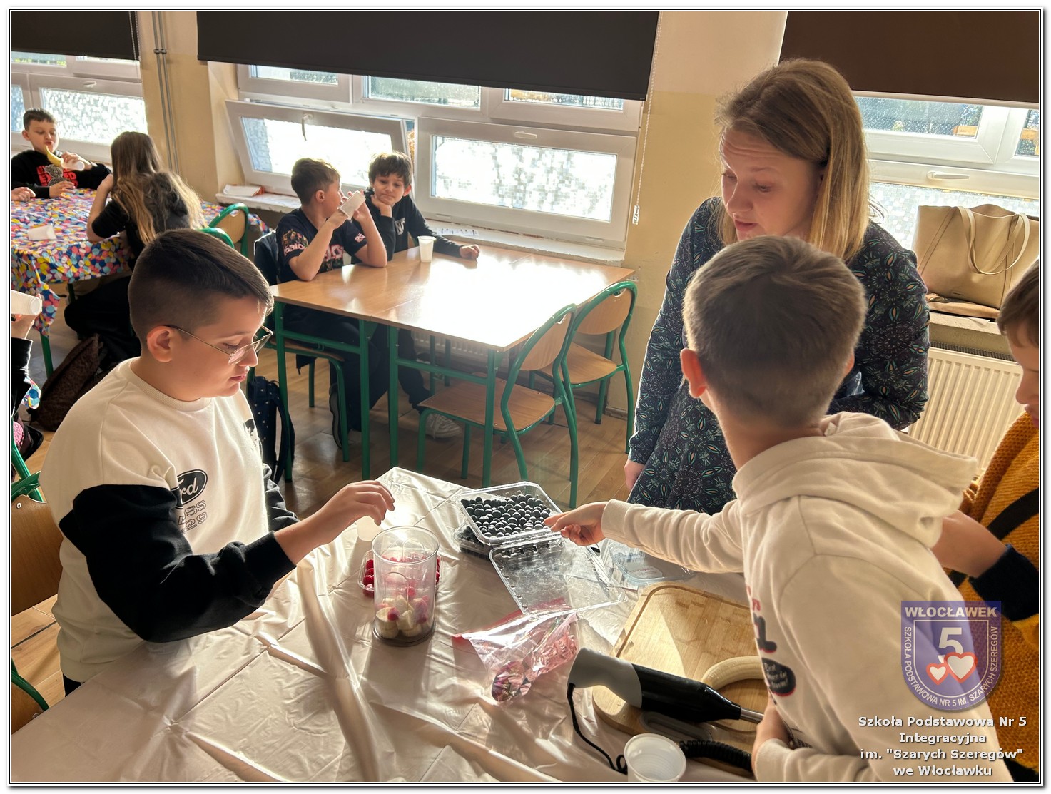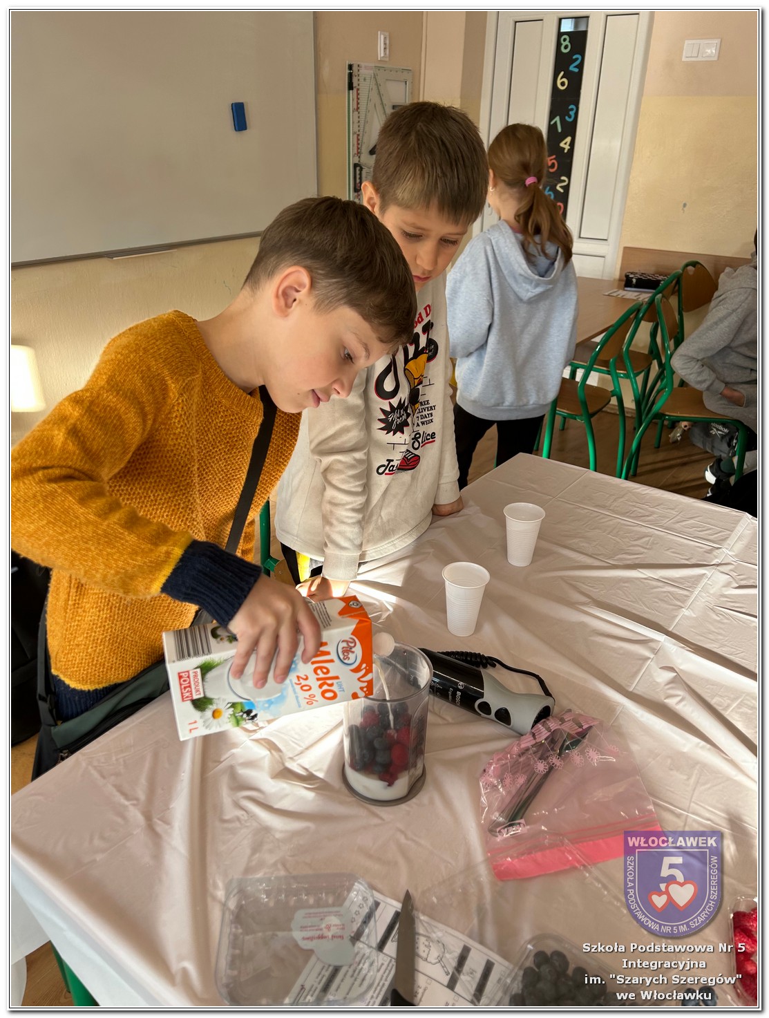 6 listopada zostały przeprowadzone warsztaty pt. „Analiza etykiet produktów spożywczych i obliczanie kalorii składników, ilości białek, tłuszczy. Cukier w diecie”, w ramach projektu „Mierzymy świat – matematyka w naturze”, sfinansowane przez Fundację mBanku w programie mSilnia. Zajęcia zostały przygotowane dla dwóch grup wiekowych – uczniów klas IV–V oraz klas VII–VIII. Podczas warsztatów uczniowie zapoznali się z zasadami zdrowego odżywiania. Poznali dzienne zapotrzebowanie kaloryczne dzieci, młodzieży, osób dorosłych i starszych. Omówiono rolę białek, cukrów, tłuszczów dla organizmu. Dzieci same uznały, że w ich diecie znajduje się dużo cukrów. Wykreślały z wykreślanki nazwy bakalii, które są smaczne, zdrowe i jednocześnie zawierają w sobie cukry. Dzieci wspólnie z nauczycielami stwierdziły, że doskonałą alternatywą dla słodkich przekąsek mogą być zdrowe i pożywne koktajle. Uczniowie najpierw obliczyli zadania matematyczne, których rozwiązanie okazało się przepisem na koktajl, a następnie według własnego uznania dobierały ulubione owoce takie jak: borówki, jeżyny, banany, gruszki, winogrona, czy maliny. Warsztaty okazały się nie tylko świetną zabawą, ale też ciekawym sposobem na naukę matematyki w praktyce oraz zrozumienie, że nasza dieta ma ogromny wpływ na funkcjonowanie organizmu.