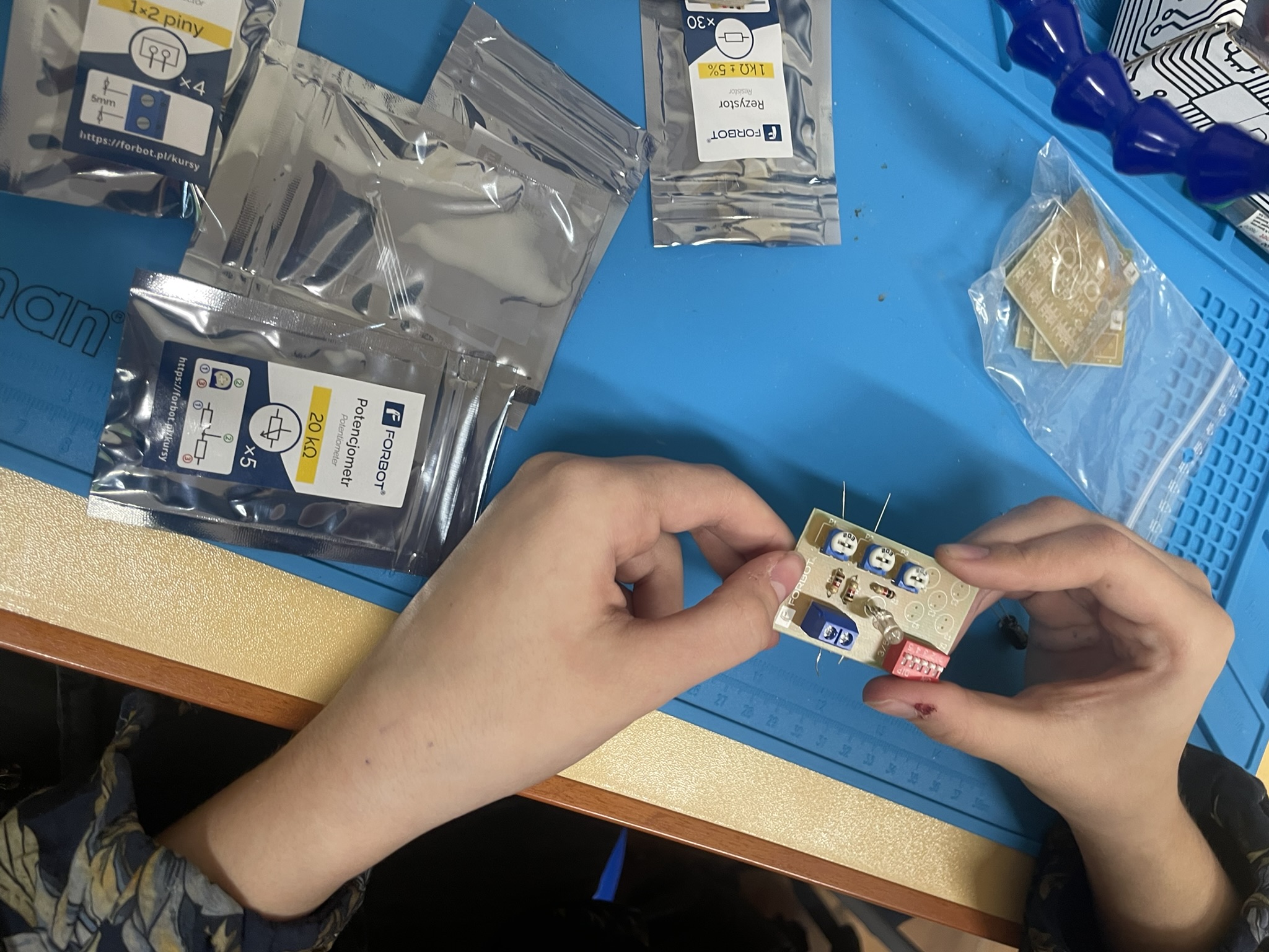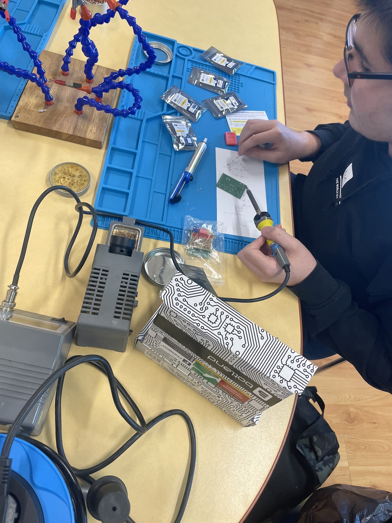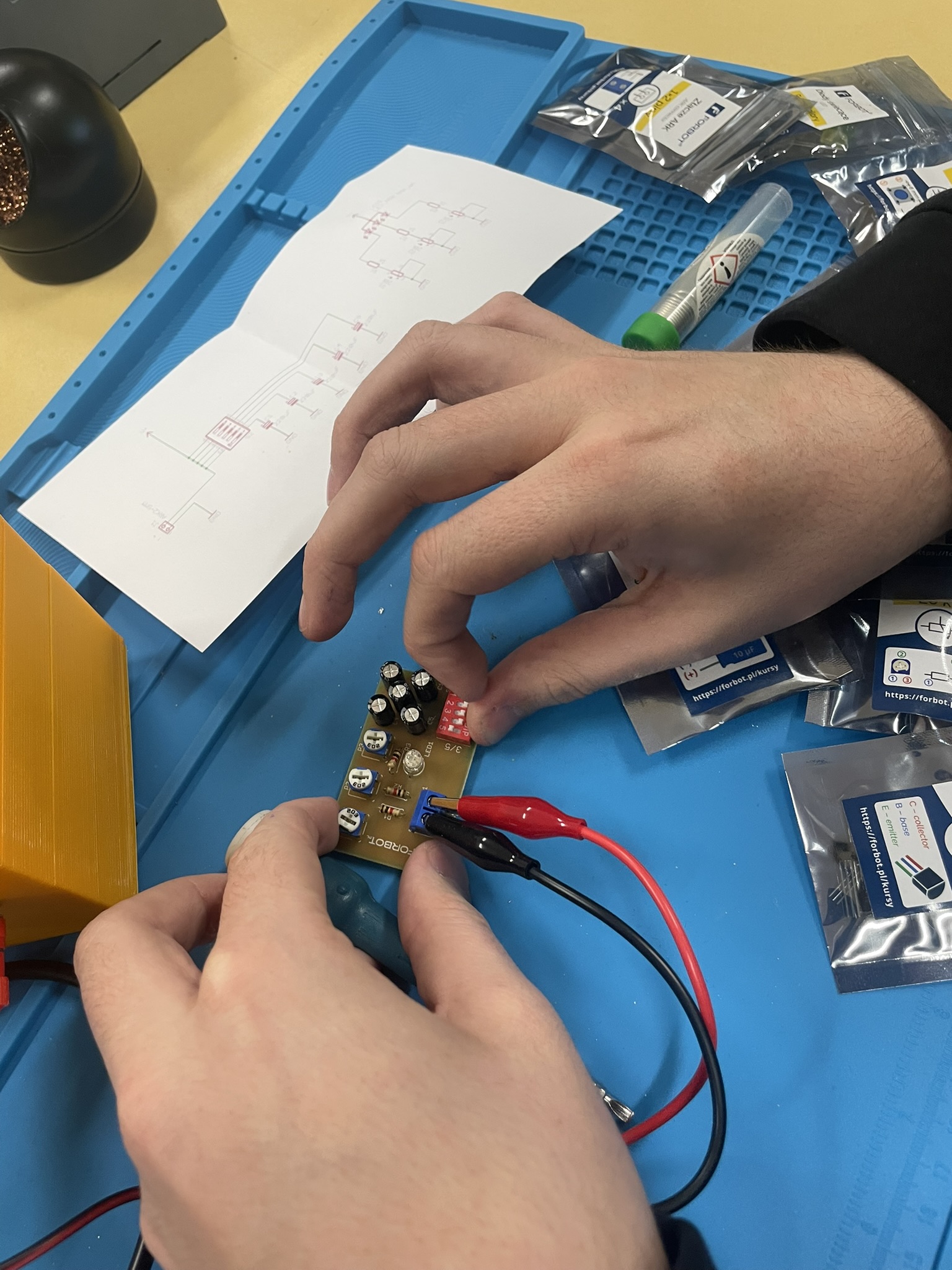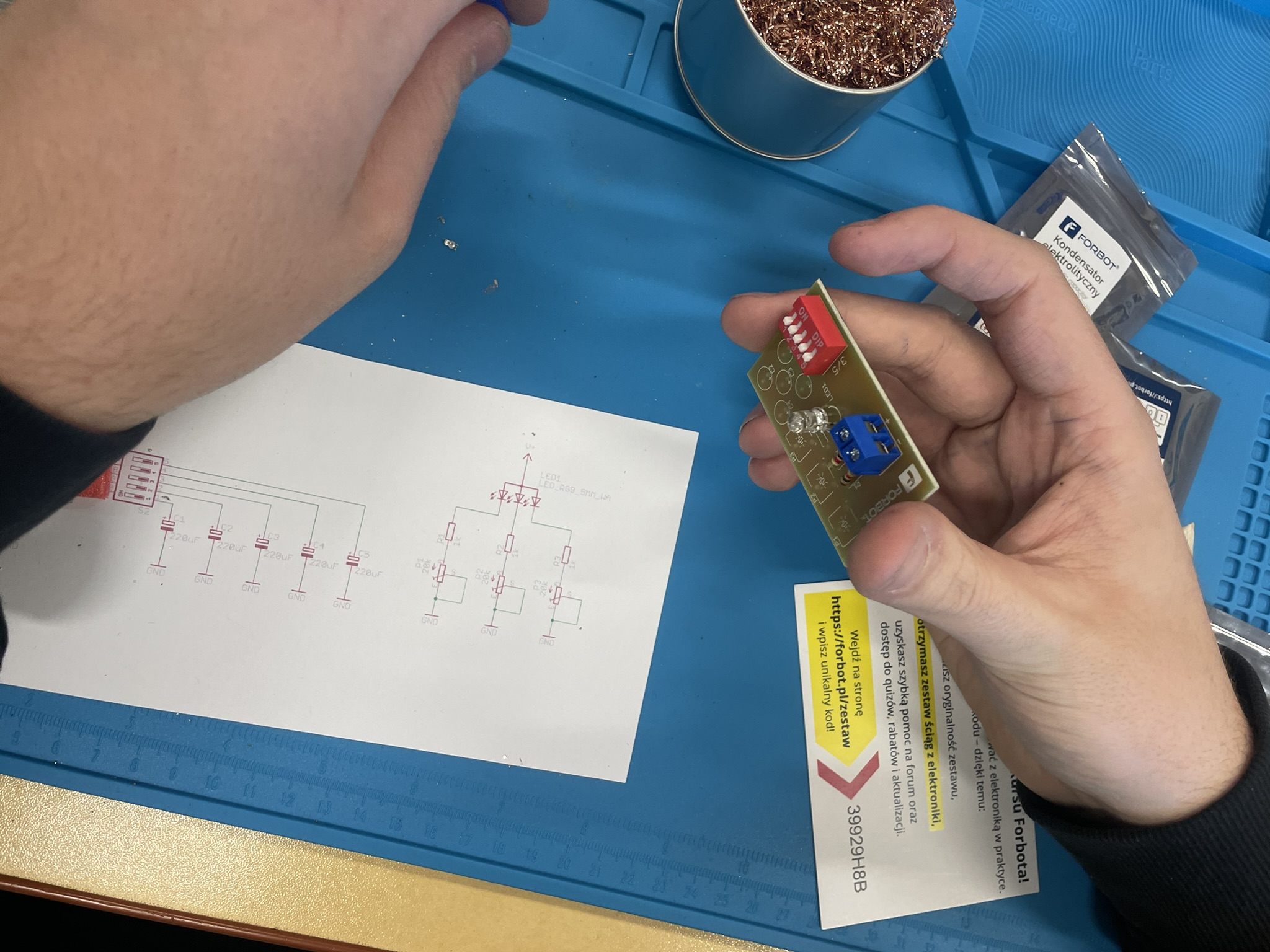 Uczniowie lutowali na płytce drukowanej różne elementy elektroniczne, m.in. rezystory, potencjometry, kondensatory elektrolityczne, przełącznik typu DIP oraz diodę RGB. Celem było zrozumienie, jak łączyć i montować elementy w praktyce oraz jak działa dioda RGB i jak można regulować jasność jej kolorów za pomocą potencjometrów. Uczniowie praktycznie przećwiczyli lutowanie i zrozumieli zasady działania diody RGB oraz kondensatorów jako elementów magazynujących energię.