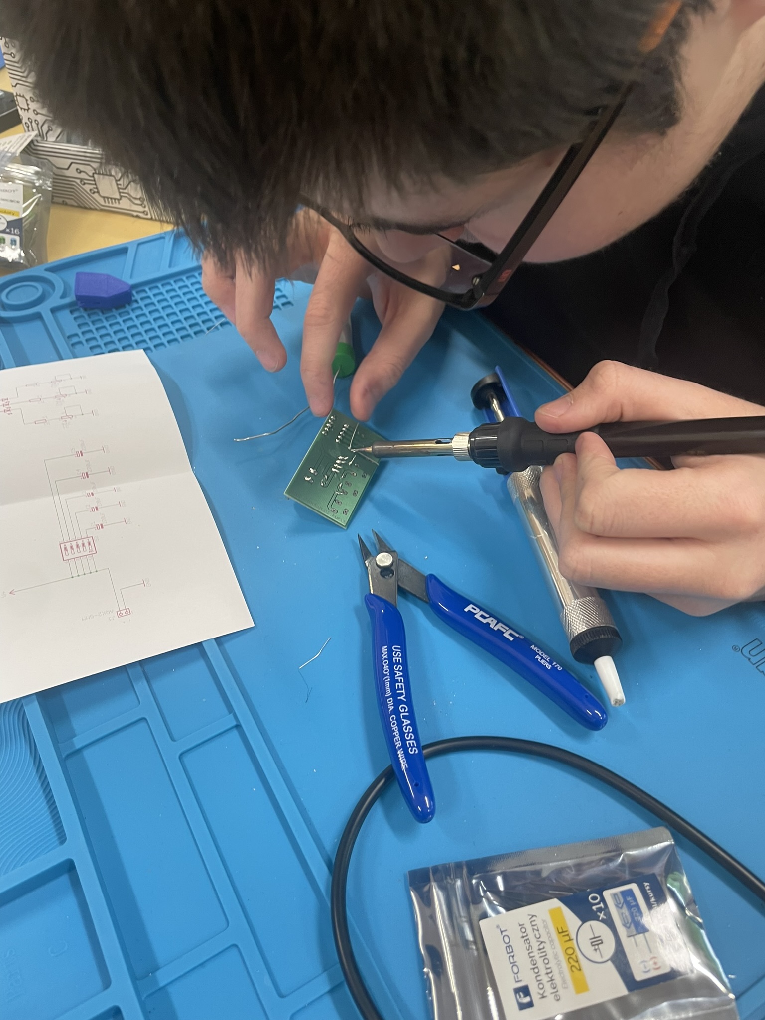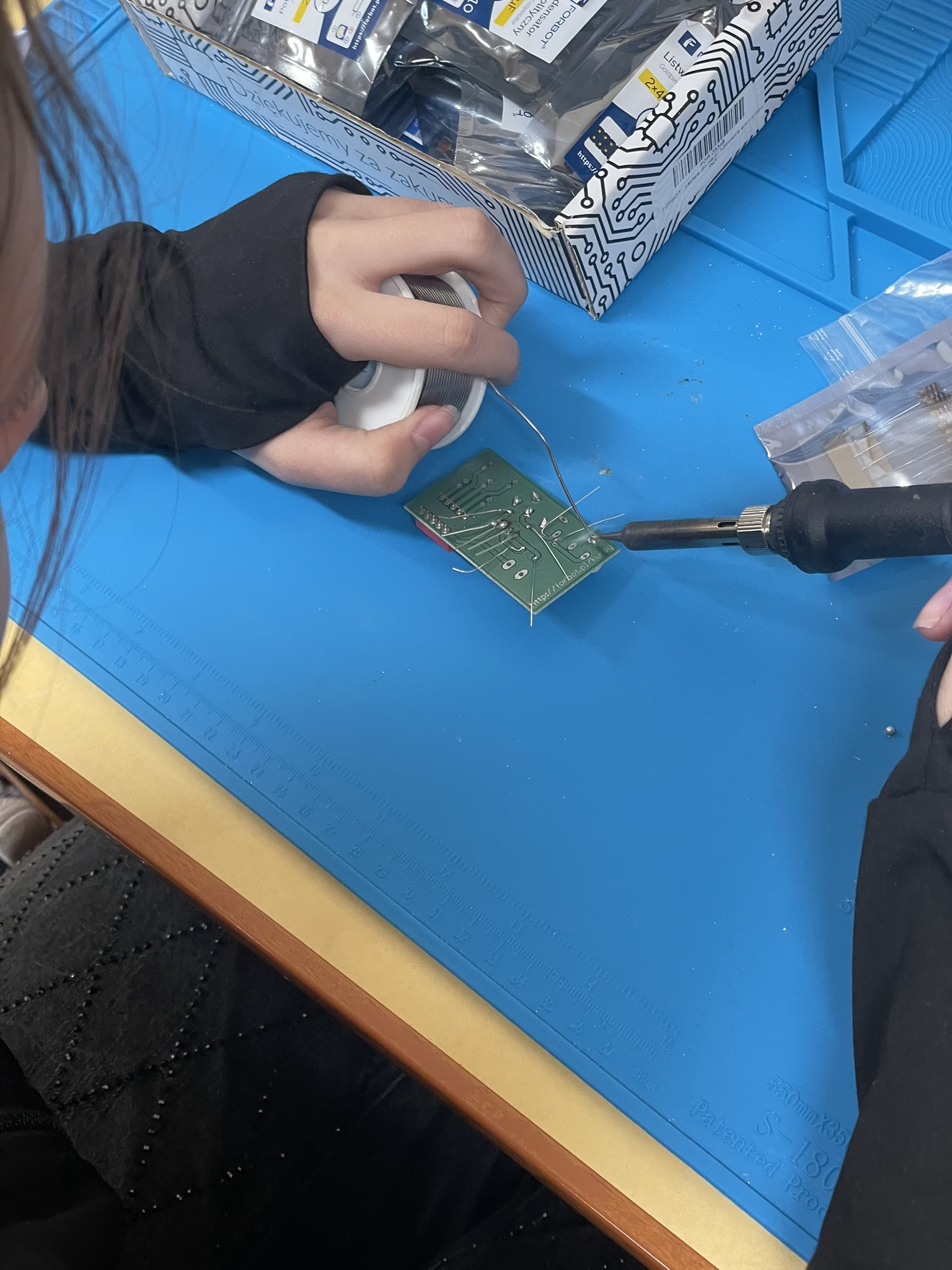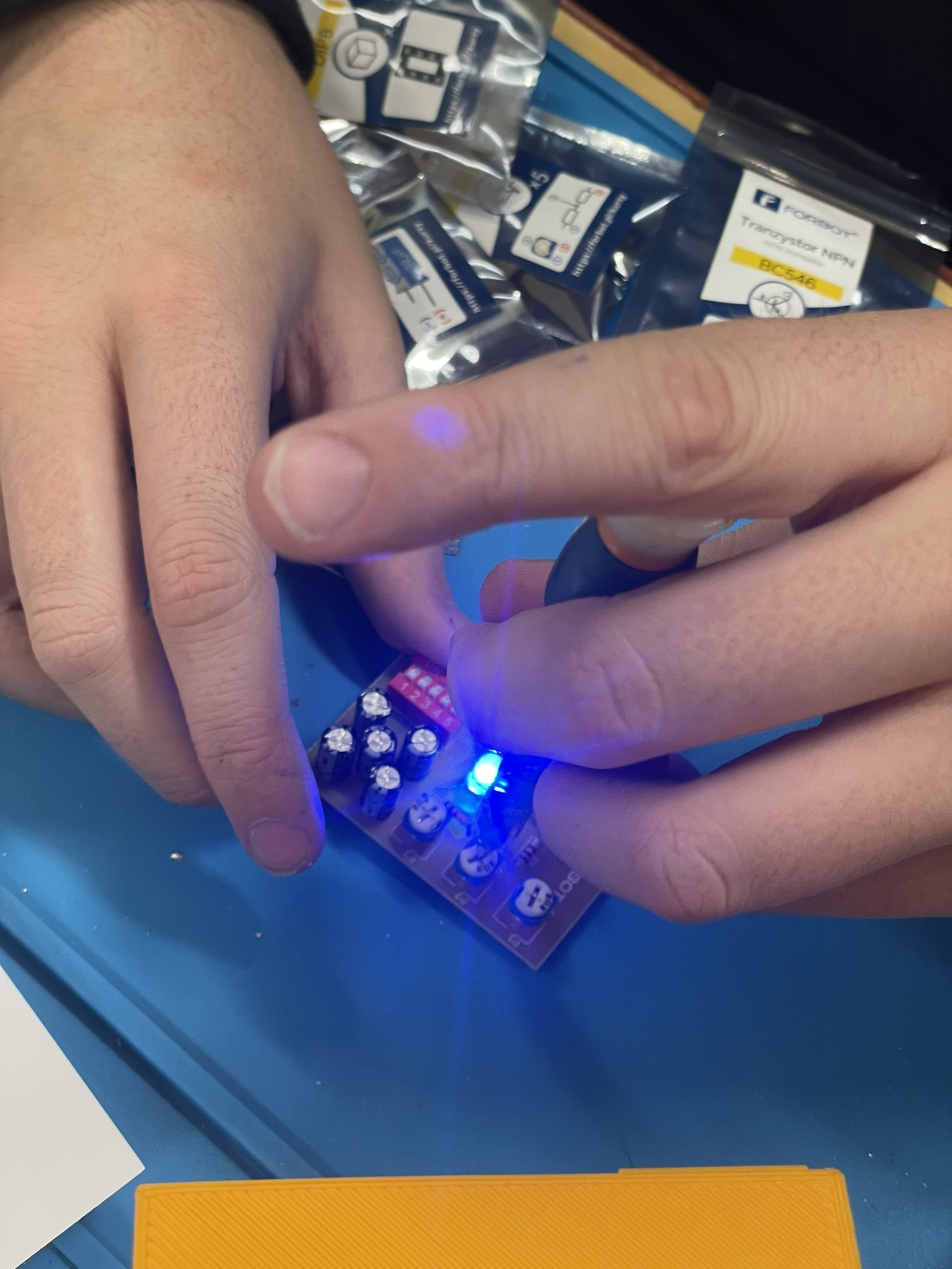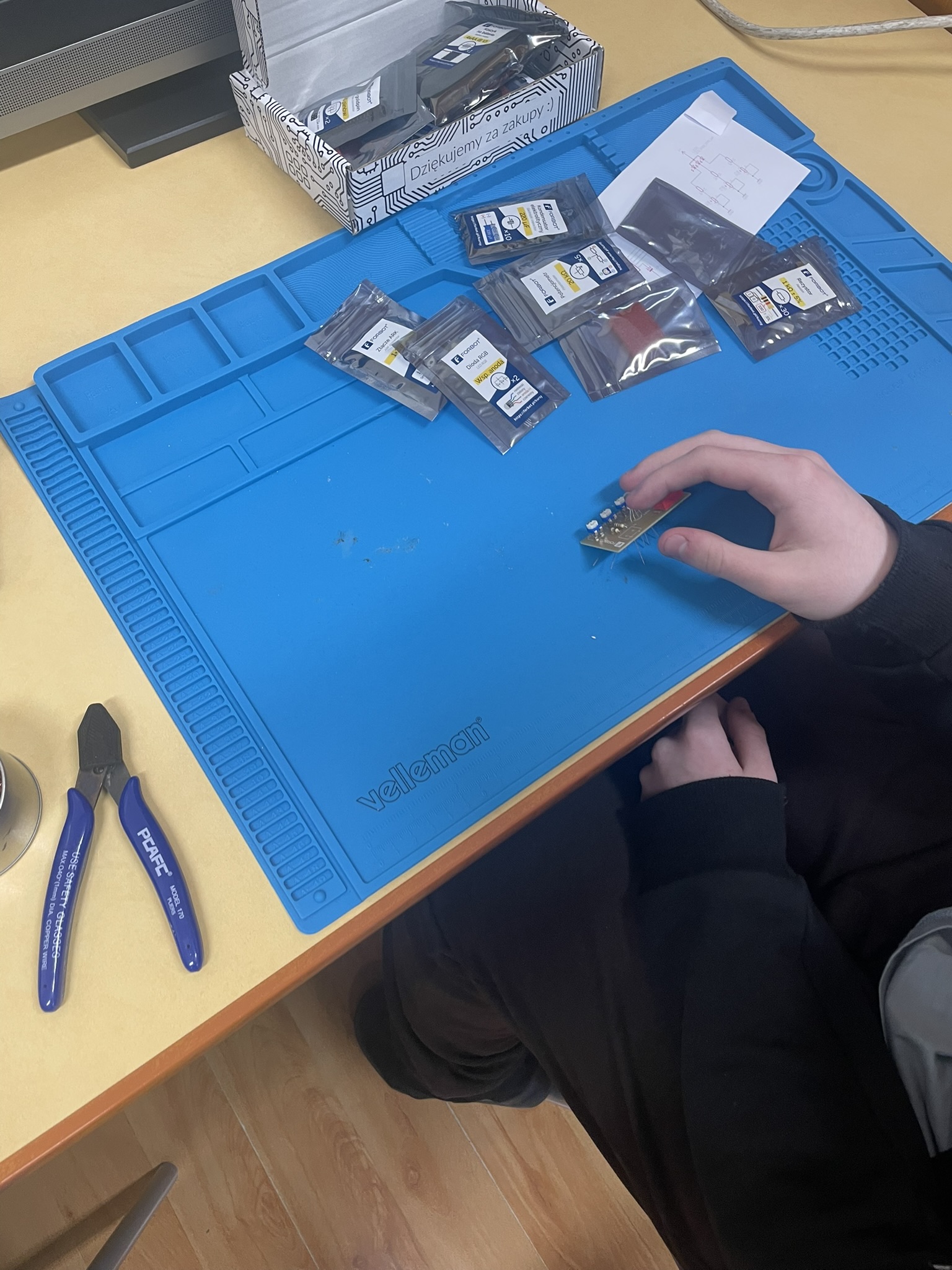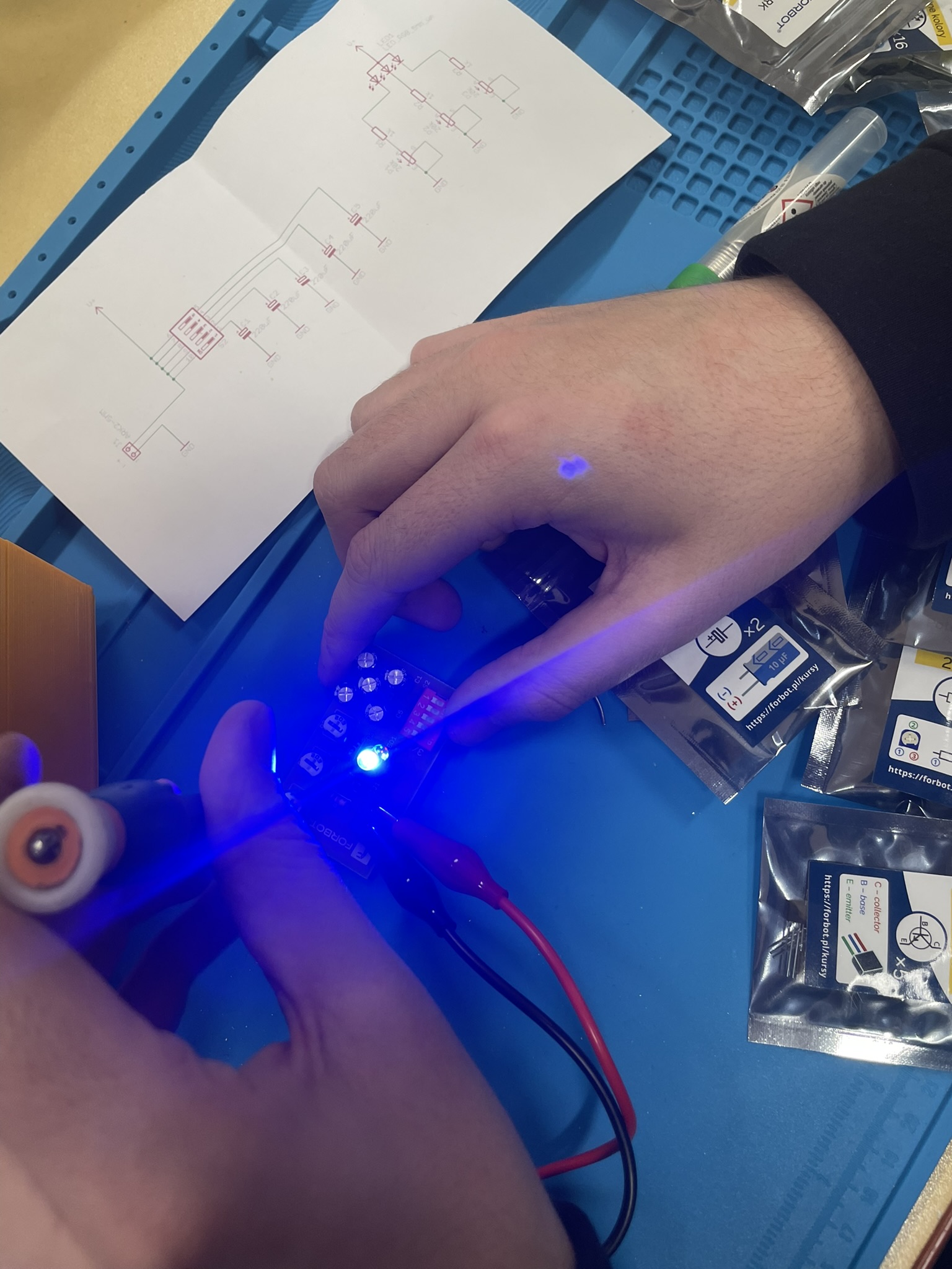 Uczniowie lutowali na płytce drukowanej różne elementy elektroniczne, m.in. rezystory, potencjometry, kondensatory elektrolityczne, przełącznik typu DIP oraz diodę RGB. Celem było zrozumienie, jak łączyć i montować elementy w praktyce oraz jak działa dioda RGB i jak można regulować jasność jej kolorów za pomocą potencjometrów. Uczniowie praktycznie przećwiczyli lutowanie i zrozumieli zasady działania diody RGB oraz kondensatorów jako elementów magazynujących energię.
