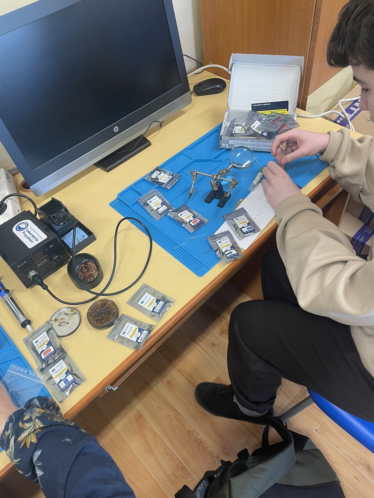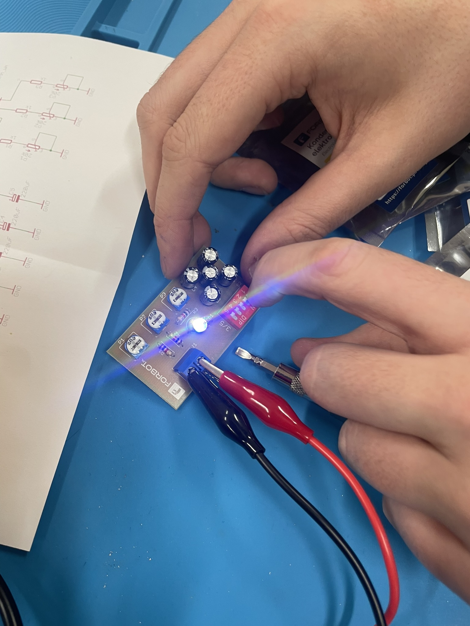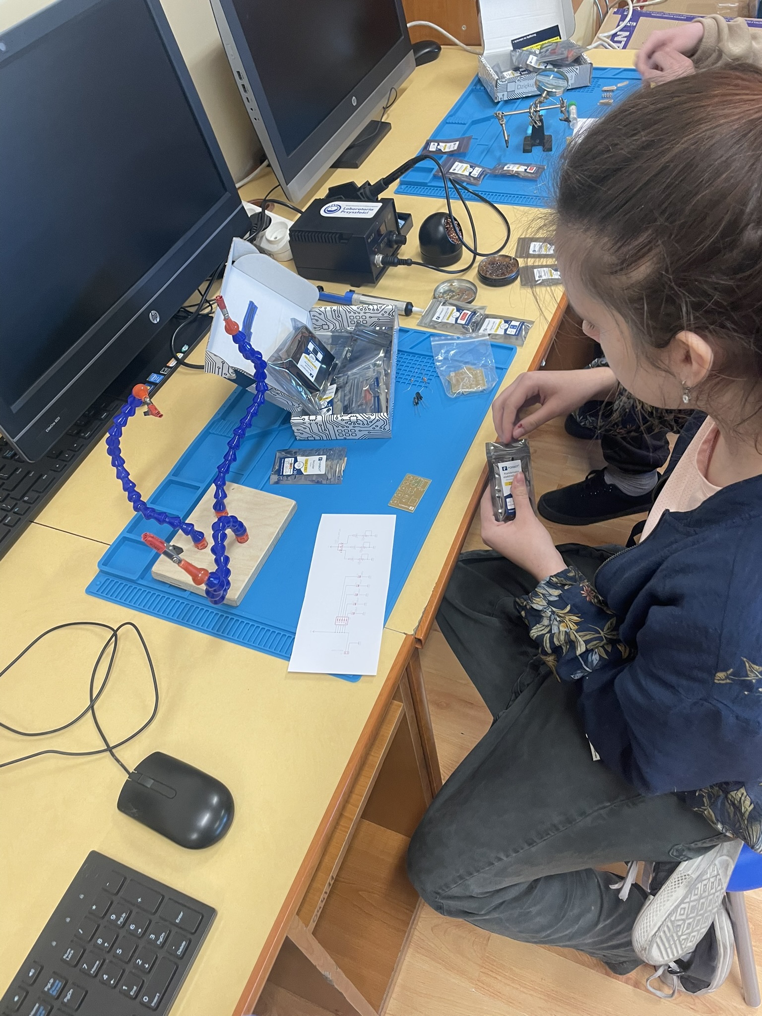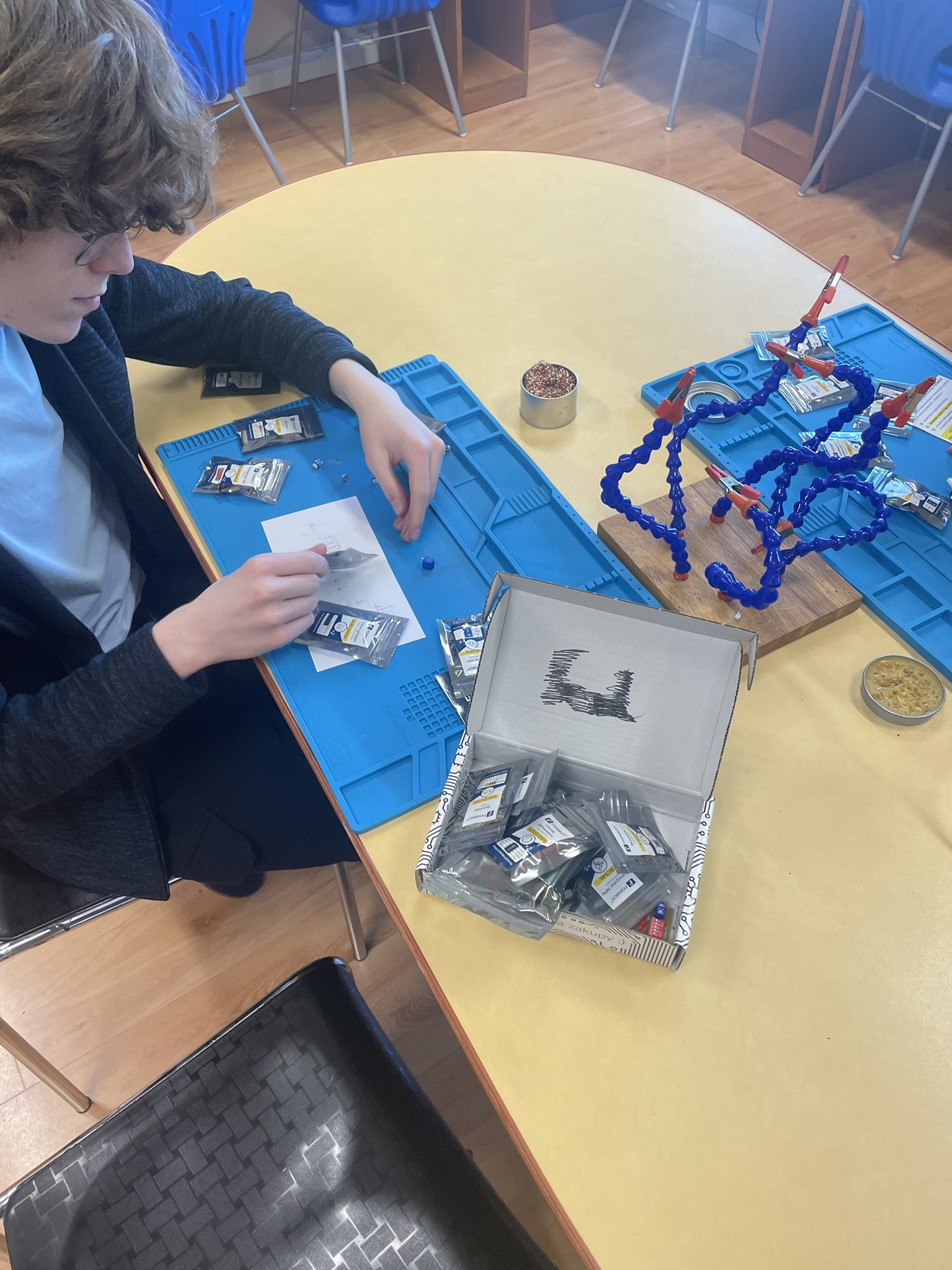 Uczniowie lutowali na płytce drukowanej różne elementy elektroniczne, m.in. rezystory, potencjometry, kondensatory elektrolityczne, przełącznik typu DIP oraz diodę RGB. Celem było zrozumienie, jak łączyć i montować elementy w praktyce oraz jak działa dioda RGB i jak można regulować jasność jej kolorów za pomocą potencjometrów. Uczniowie praktycznie przećwiczyli lutowanie i zrozumieli zasady działania diody RGB oraz kondensatorów jako elementów magazynujących energię.