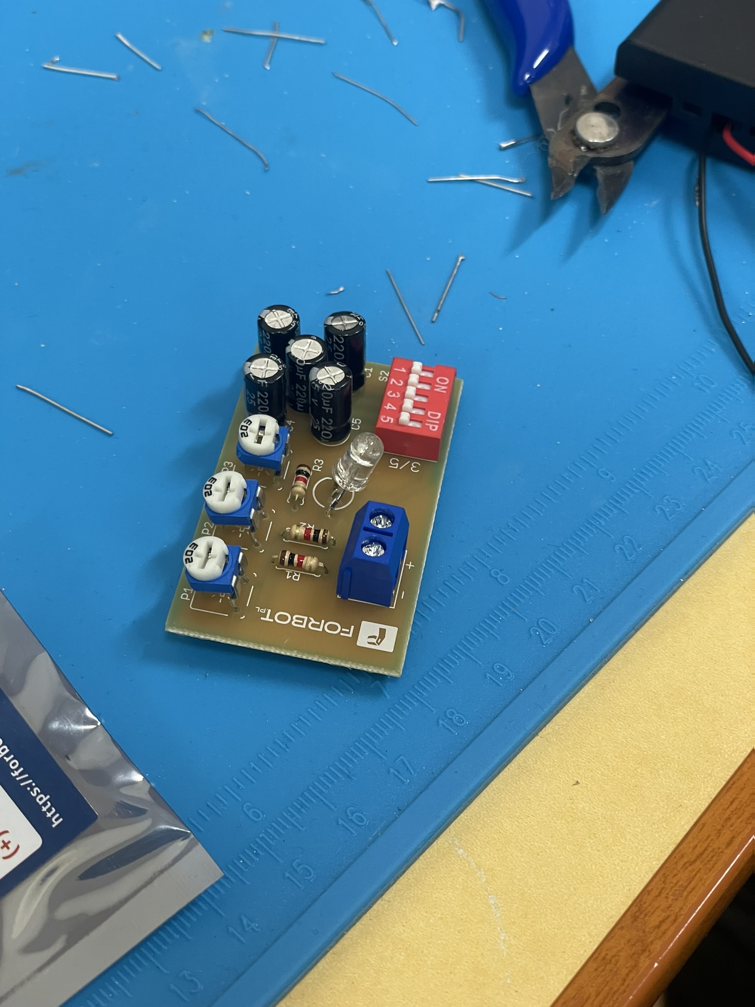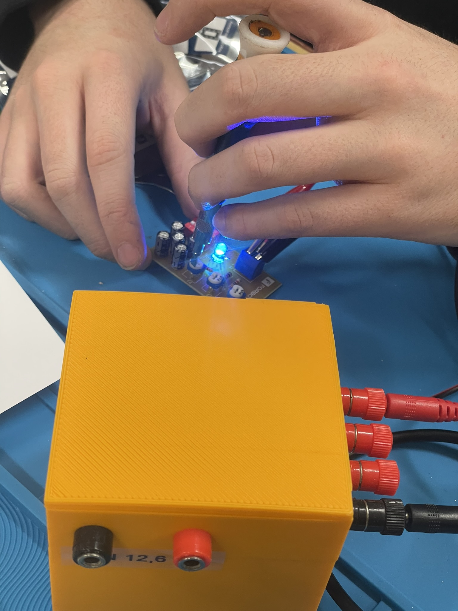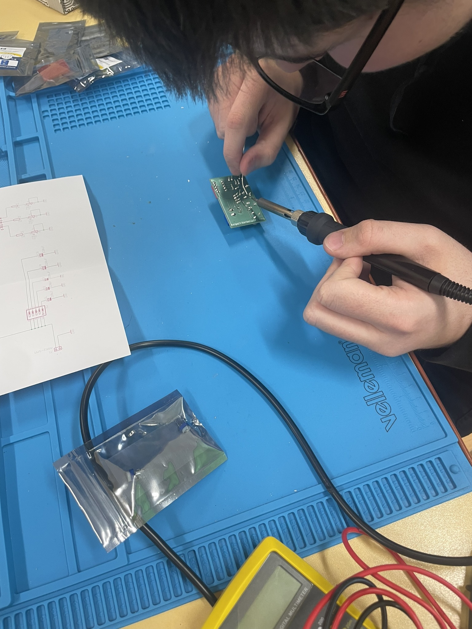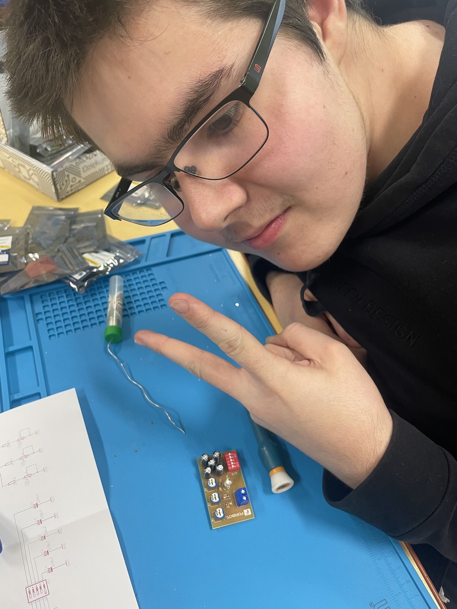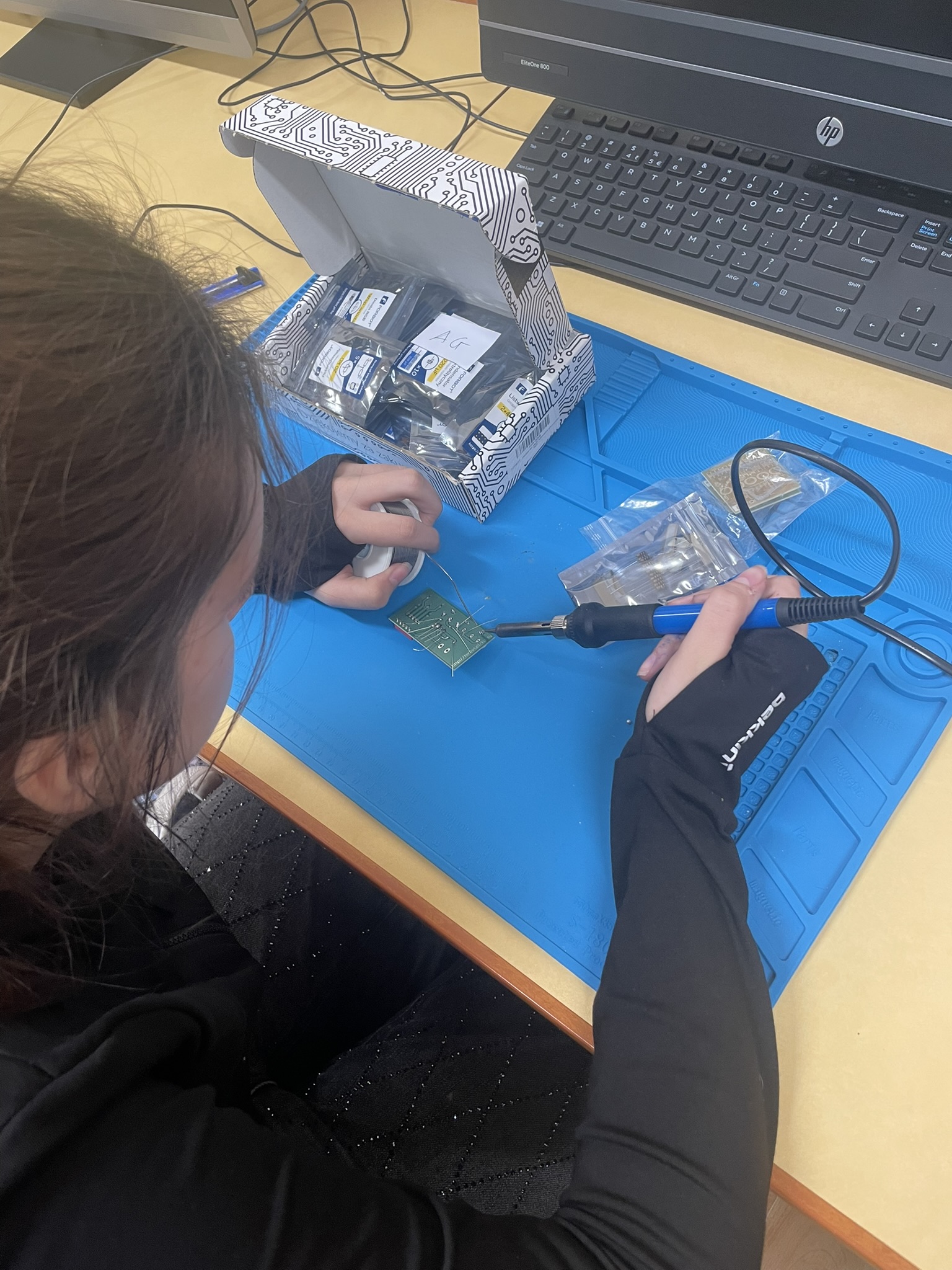 Uczniowie lutowali na płytce drukowanej różne elementy elektroniczne, m.in. rezystory, potencjometry, kondensatory elektrolityczne, przełącznik typu DIP oraz diodę RGB. Celem było zrozumienie, jak łączyć i montować elementy w praktyce oraz jak działa dioda RGB i jak można regulować jasność jej kolorów za pomocą potencjometrów. Uczniowie praktycznie przećwiczyli lutowanie i zrozumieli zasady działania diody RGB oraz kondensatorów jako elementów magazynujących energię.