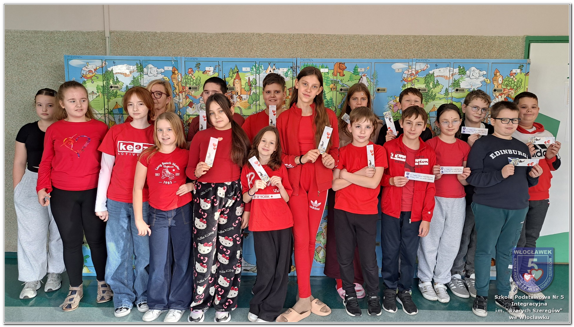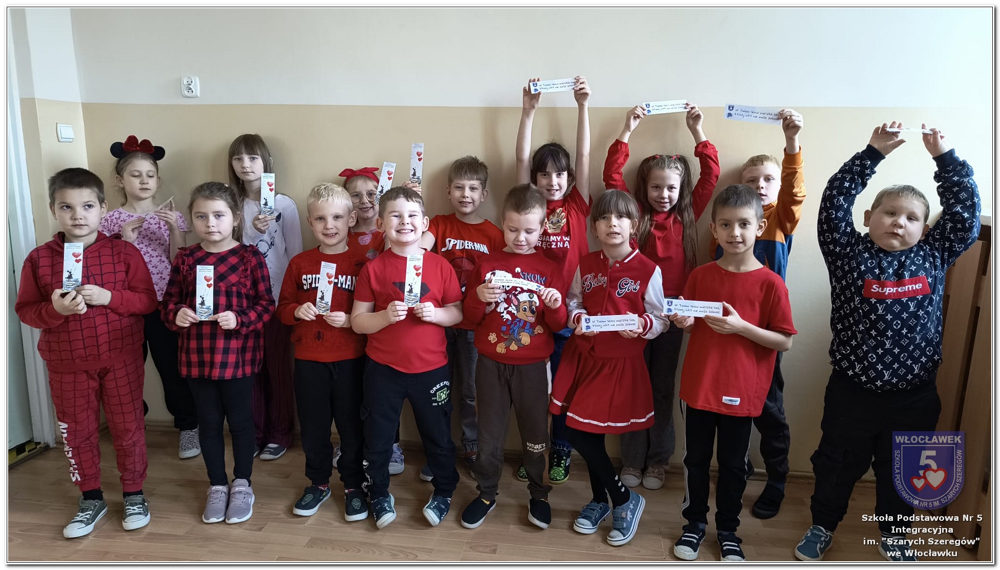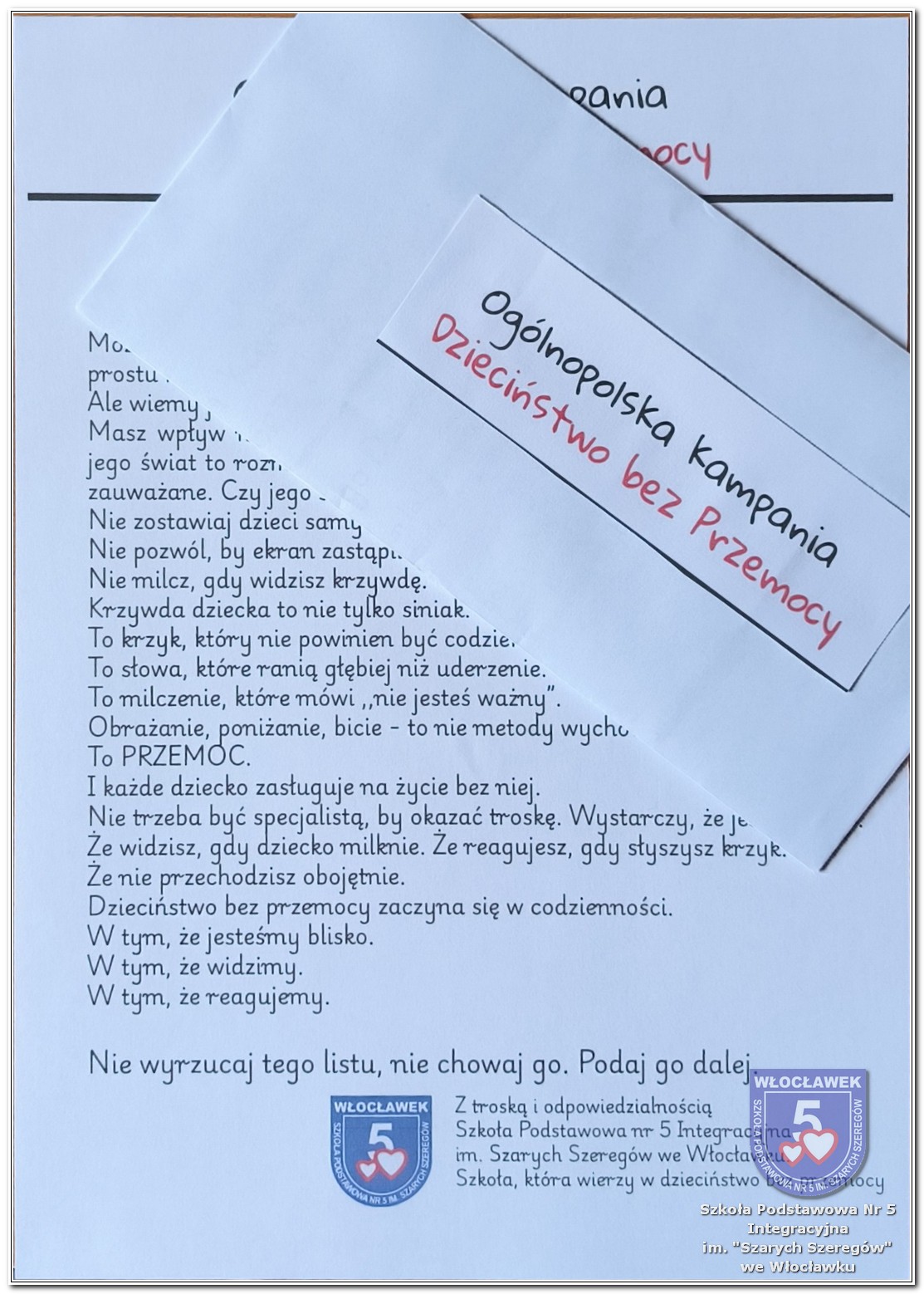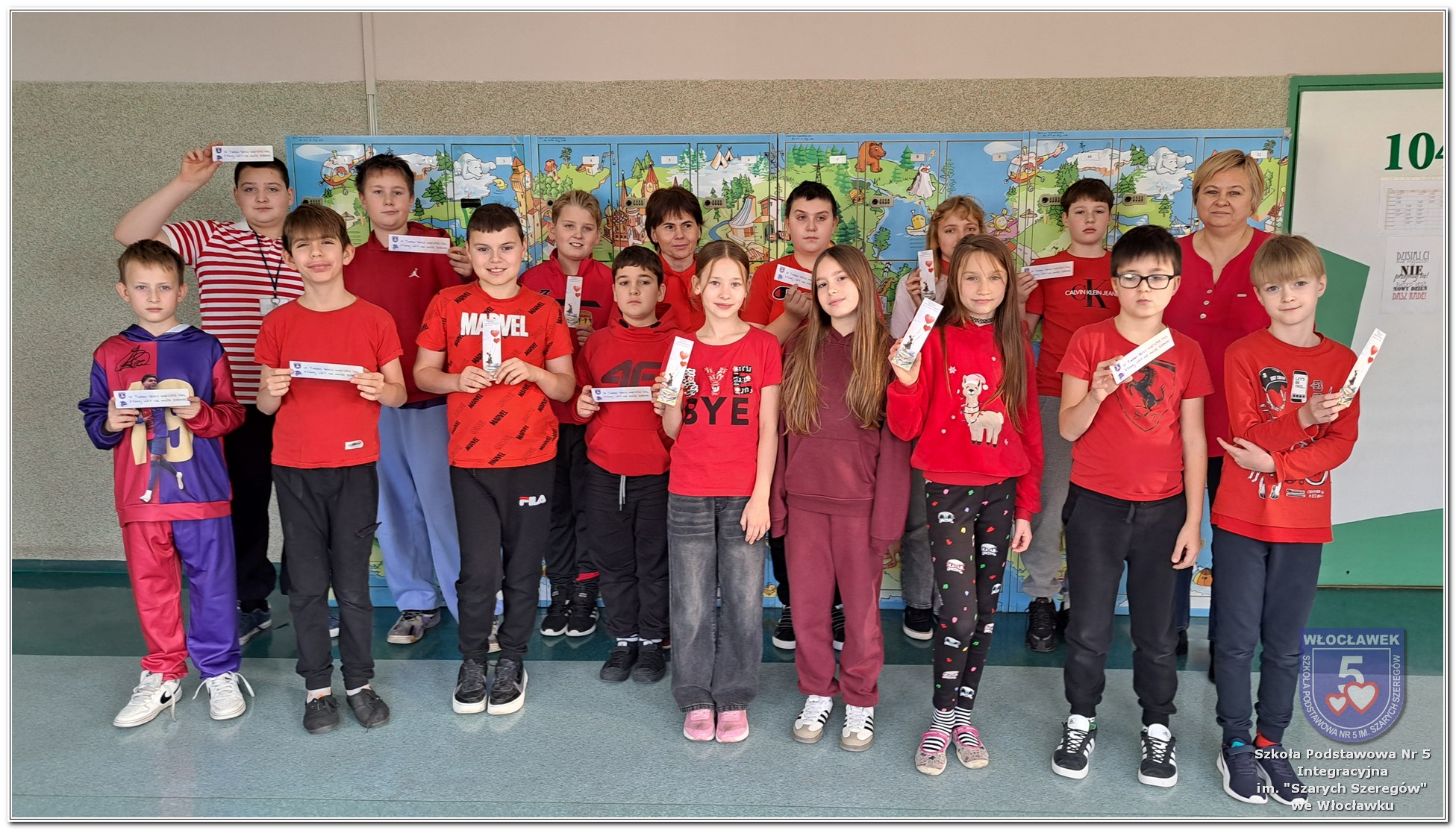 Kampania ,,Dzieciństwo bez przemocy” była kolejnym etapem szkolnych działań poświęconych tematyce przemocy. Po Tygodniu o Przeciwdziałaniu Przemocy Rówieśniczej przyszedł czas na gesty codzienne, symboliczne, wspólne – przypominające, że trzeba reagować, gdy dziecko doświadcza krzywdy. W klasach w dalszym ciągu trwają rozmowy i zajęcia poświęcone rozpoznawaniu przemocy i sposobom reagowania. Uczniowie znają sytuacje, w których nie wolno milczeć – wiedzą, jak reagować, gdzie szukać pomocy i jak wspierać osoby doświadczające krzywdy. Przekaz jest jasny: trzeba działać przeciwko przemocy – z odwagą, empatią i odpowiedzialnością. Młodsze dzieci przygotowały kolorowe serca – znak dziecięcej potrzeby bezpieczeństwa i bliskości. Serca ozbobiły gazetkę szkolną i stały się inspiracją do projektu muralu, który symbolicznie zakończył kampanię. Uczniowie włączyli się również w akcję ,,Listy Bezpiecznego Dzieciństwa” – rozdawali mieszkańcom lokalnej społeczności listy z ważnym przesłaniem. Każdy z nich był przypomnieniem, że dzieci mają prawo do szacunku, bezpieczeństwa i wolności od przemocy. Listy były apelem do dorosłych, by nie pozostawali obojętni – by reagowali, gdzy dziecku dzieje się krzywda. Na zakończenie akcji każdy uczeń otrzymał zakładkę do książki – drobny przedmiot, który ma przypominać o kampanii ,,Dzieciństwo bez przemocy”. Zakładka zostanie z dzieckiem na co dzień – jako cichy, ale trwały znak wspólnego sprzeciwku wobez przemocy. 19 listopada cała społeczność szkolna przyszła ubrana na czerwono. Ten kolor – symbol sprzeciwu wobec przemocy – towarzyszył również finałowi kampanii: prezentacji muralu i symbolicznemu podświetleniu szkoły na czerwono.