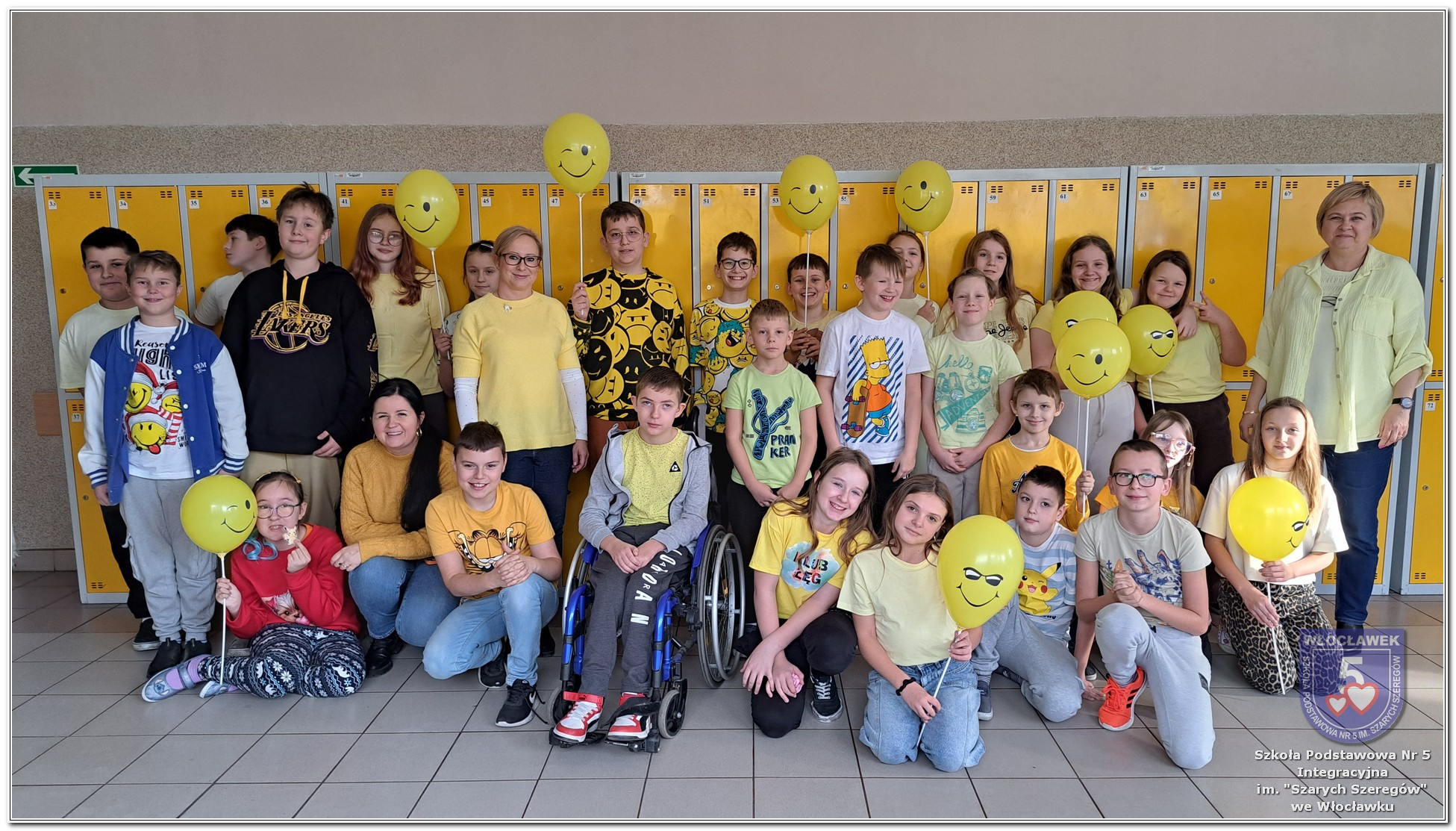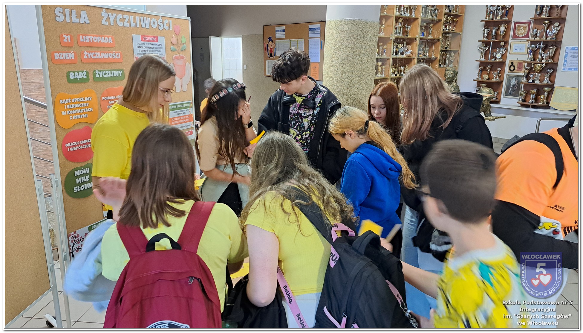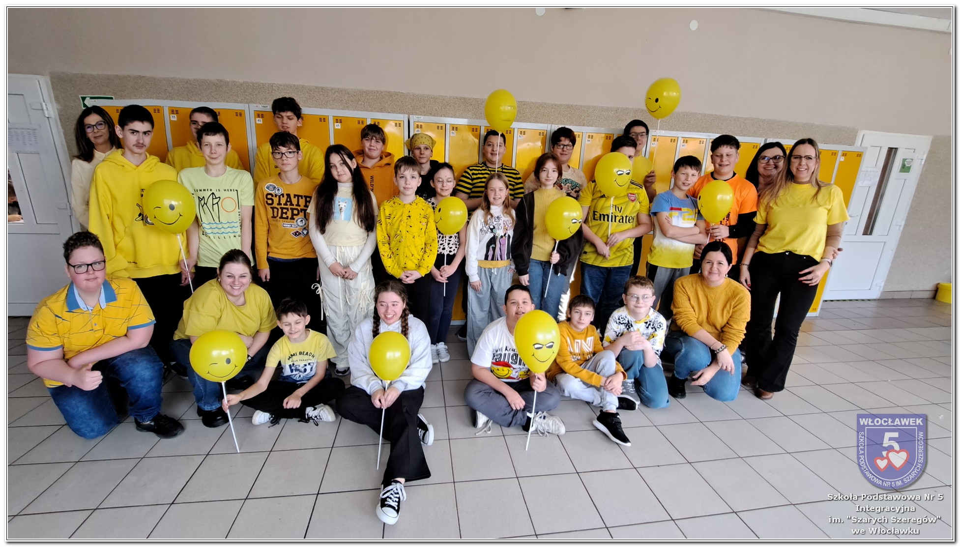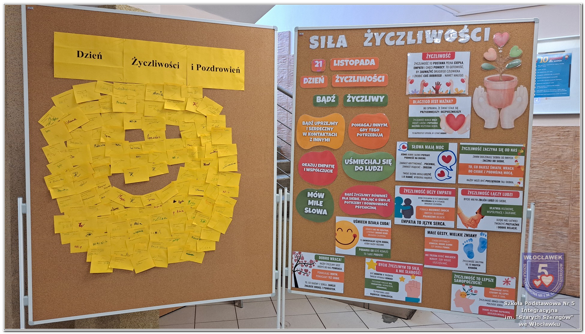 20 listopada społeczność Szkoły Podstawowej nr 5 Integracyjnej we Włocławku obchodziła Dzień Tolerancji i Życzliwości. Tego dnia w całej szkole królował kolor żółty – symbol radości, otwartości i przyjaznych relacji. Uczniowie klas I–III przygotowali „Łańcuch Tolerancji i Życzliwości”, który ozdobił hol budynku B, stając się widocznym znakiem wspólnoty i wzajemnego szacunku. Starsi uczniowie wzięli udział w zabawie „Znajdź kogoś kto…”, polegającej na zdobywaniu autografów osób spełniających warunki zapisane na żółtych karteczkach. Zebrane podpisy utworzyły radosną emotikonę, która rozbawiła całą społeczność. Aby dobry humor towarzyszył wszystkim przez cały dzień, dzieci mogły również zabrać ze sobą „dobre słowo” lub podarować je wybranej osobie. Ten prosty gest stał się pięknym symbolem życzliwości i wzajemnego wsparcia.