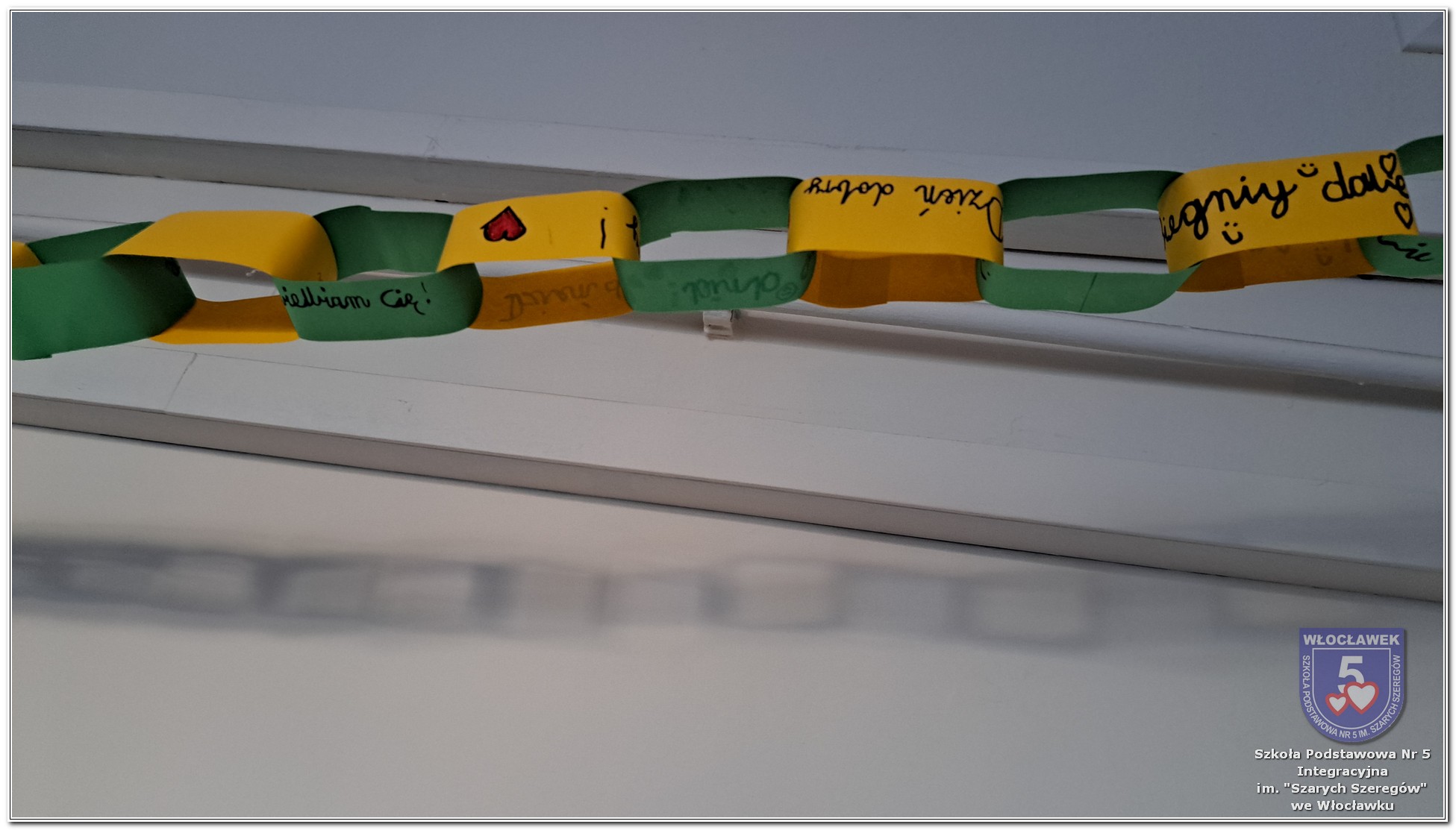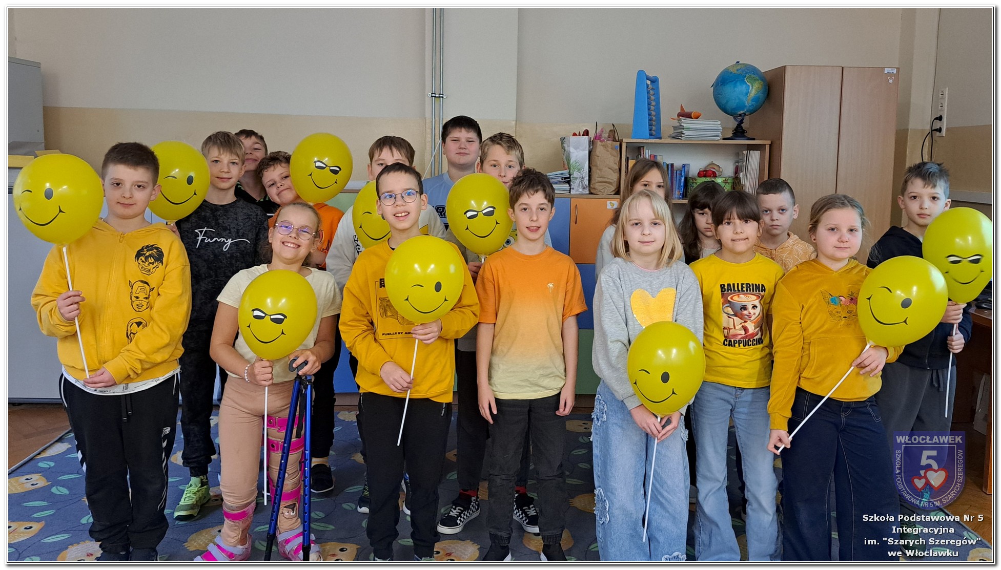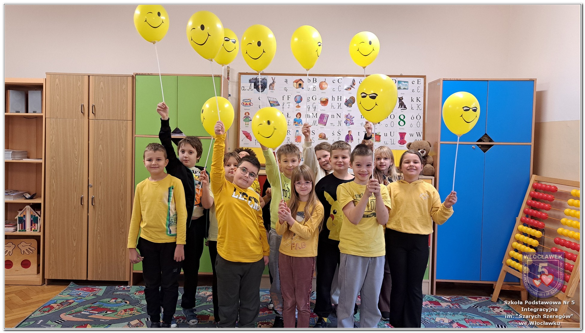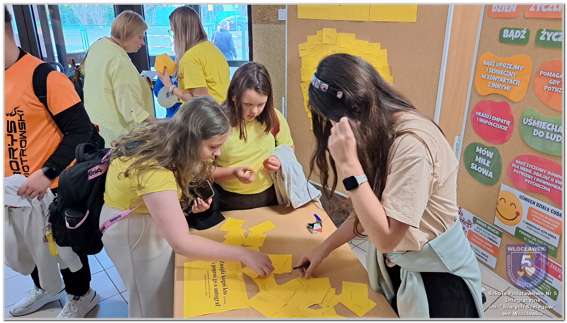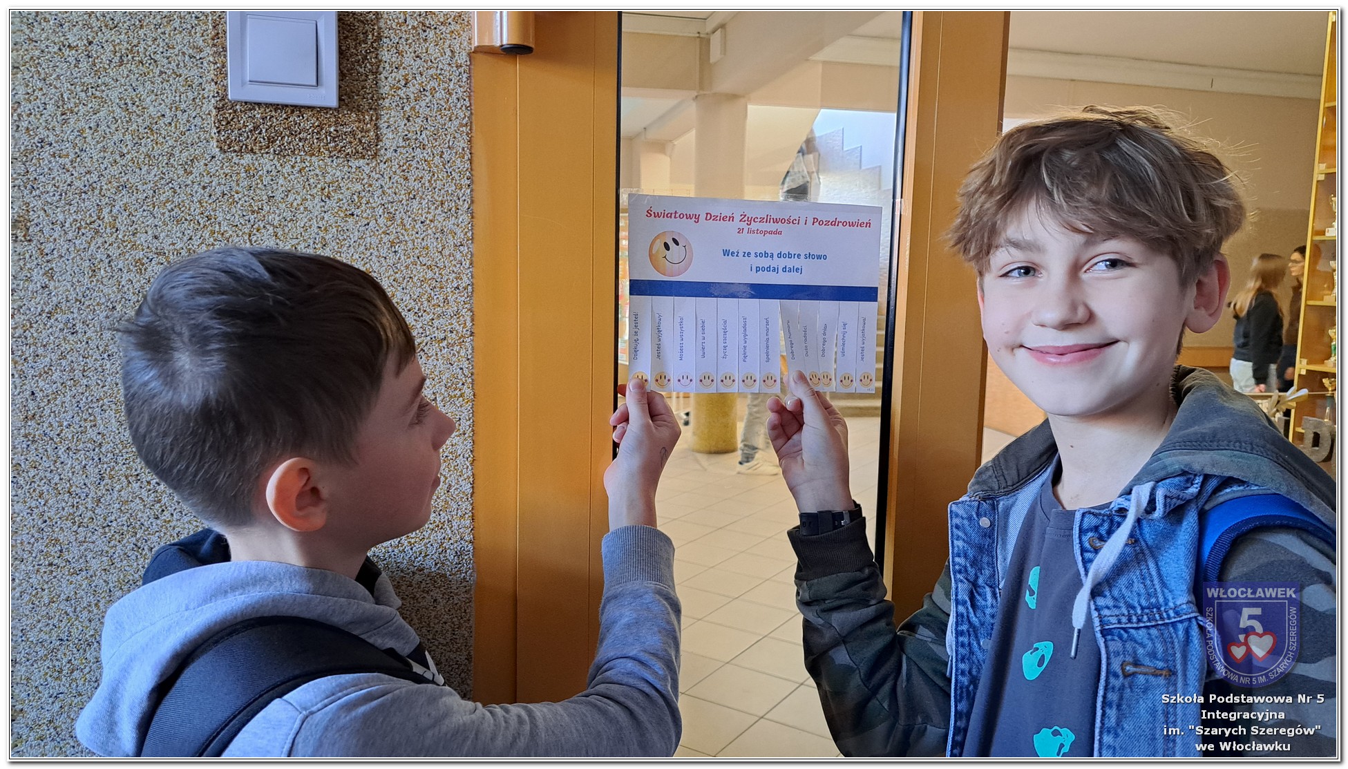 20 listopada społeczność Szkoły Podstawowej nr 5 Integracyjnej we Włocławku obchodziła Dzień Tolerancji i Życzliwości. Tego dnia w całej szkole królował kolor żółty – symbol radości, otwartości i przyjaznych relacji. Uczniowie klas I–III przygotowali „Łańcuch Tolerancji i Życzliwości”, który ozdobił hol budynku B, stając się widocznym znakiem wspólnoty i wzajemnego szacunku. Starsi uczniowie wzięli udział w zabawie „Znajdź kogoś kto…”, polegającej na zdobywaniu autografów osób spełniających warunki zapisane na żółtych karteczkach. Zebrane podpisy utworzyły radosną emotikonę, która rozbawiła całą społeczność. Aby dobry humor towarzyszył wszystkim przez cały dzień, dzieci mogły również zabrać ze sobą „dobre słowo” lub podarować je wybranej osobie. Ten prosty gest stał się pięknym symbolem życzliwości i wzajemnego wsparcia.