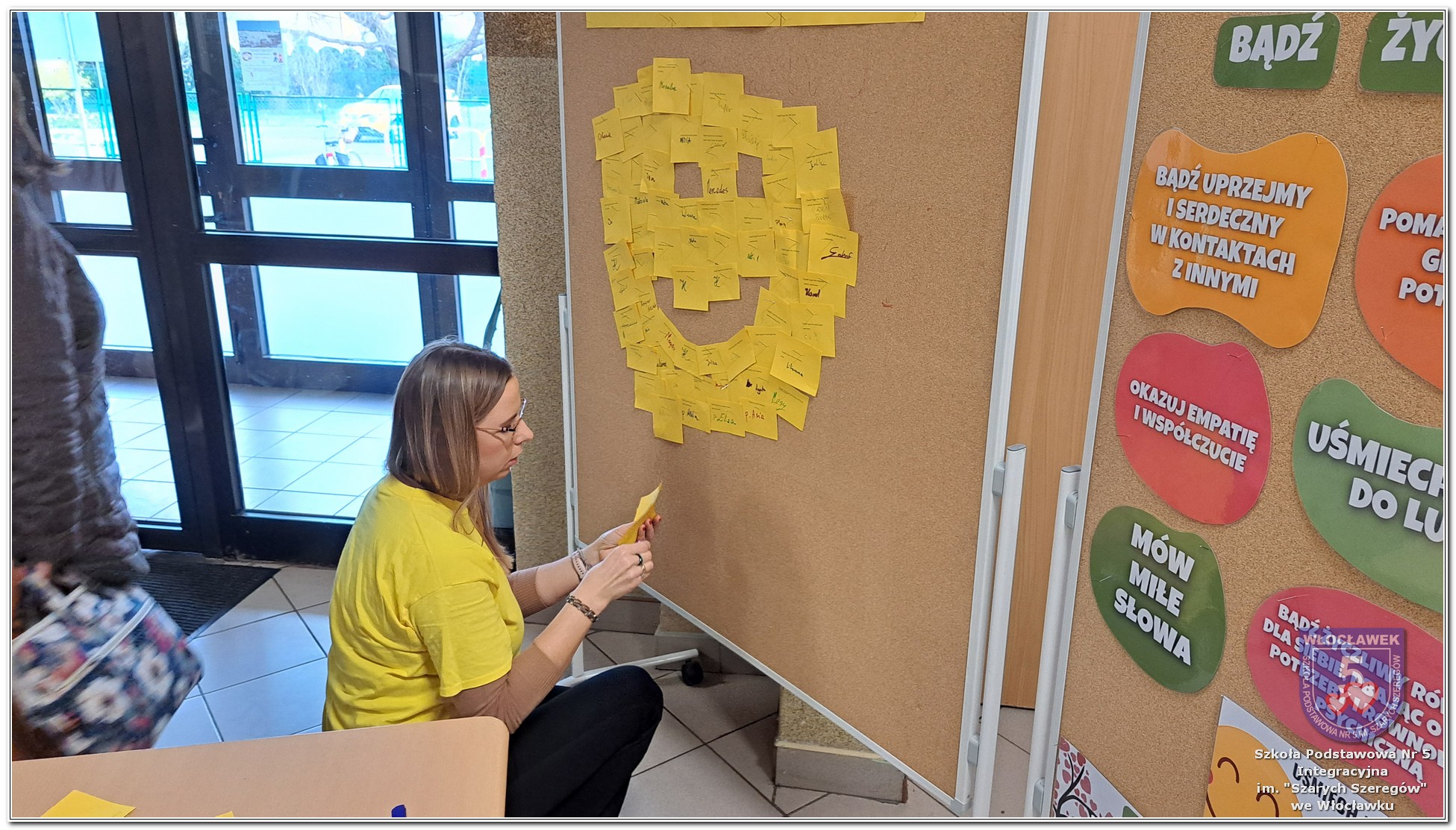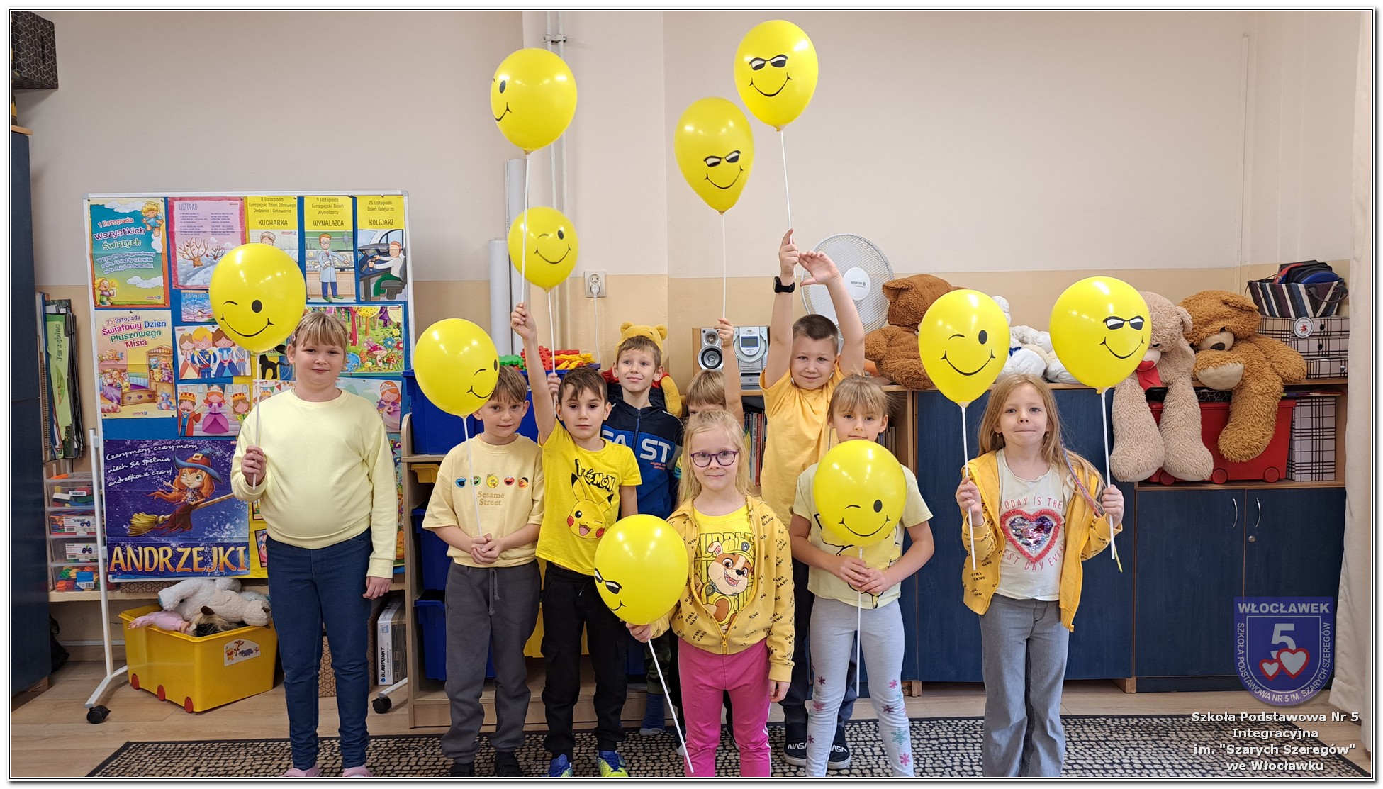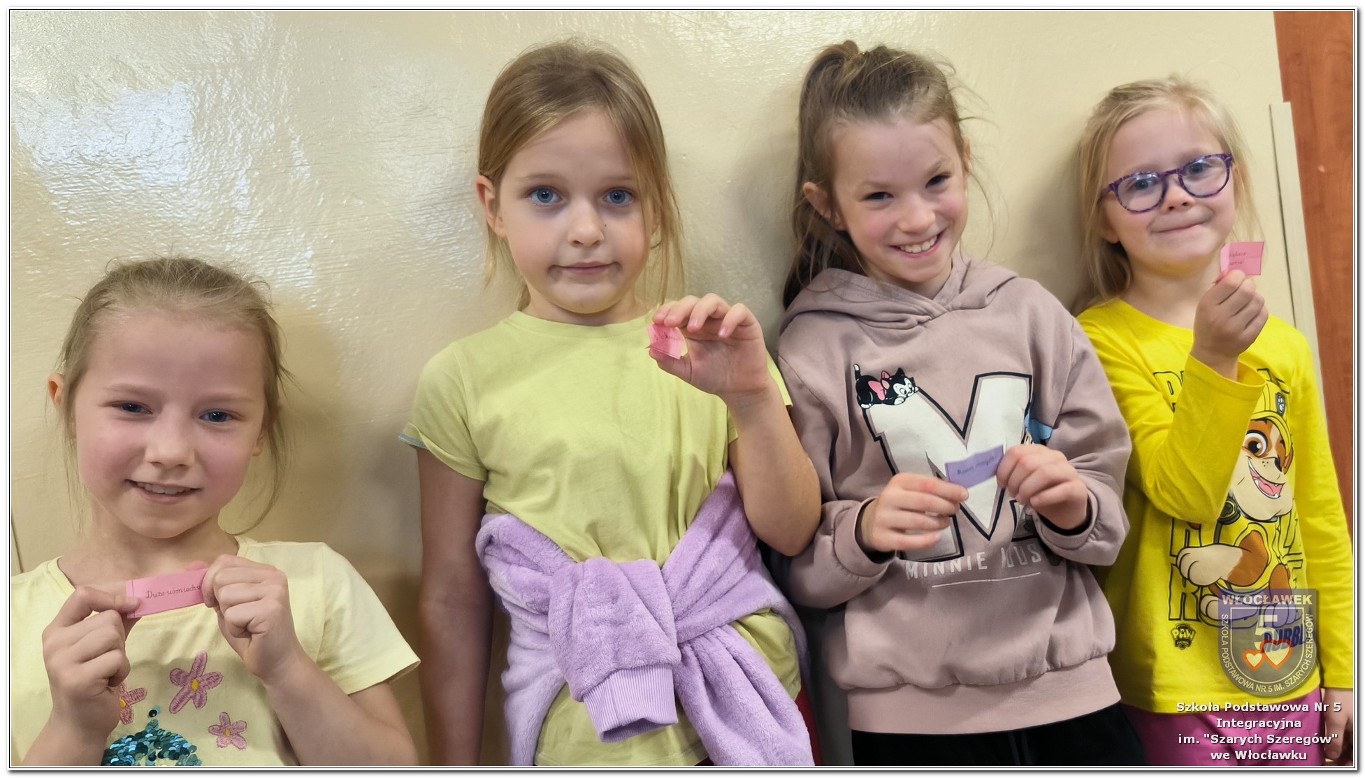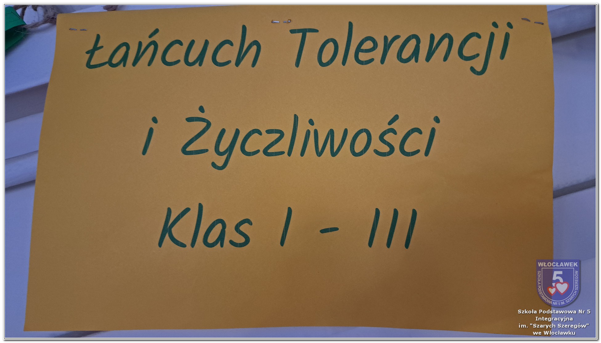 20 listopada społeczność Szkoły Podstawowej nr 5 Integracyjnej we Włocławku obchodziła Dzień Tolerancji i Życzliwości. Tego dnia w całej szkole królował kolor żółty – symbol radości, otwartości i przyjaznych relacji. Uczniowie klas I–III przygotowali „Łańcuch Tolerancji i Życzliwości”, który ozdobił hol budynku B, stając się widocznym znakiem wspólnoty i wzajemnego szacunku. Starsi uczniowie wzięli udział w zabawie „Znajdź kogoś kto…”, polegającej na zdobywaniu autografów osób spełniających warunki zapisane na żółtych karteczkach. Zebrane podpisy utworzyły radosną emotikonę, która rozbawiła całą społeczność. Aby dobry humor towarzyszył wszystkim przez cały dzień, dzieci mogły również zabrać ze sobą „dobre słowo” lub podarować je wybranej osobie. Ten prosty gest stał się pięknym symbolem życzliwości i wzajemnego wsparcia.