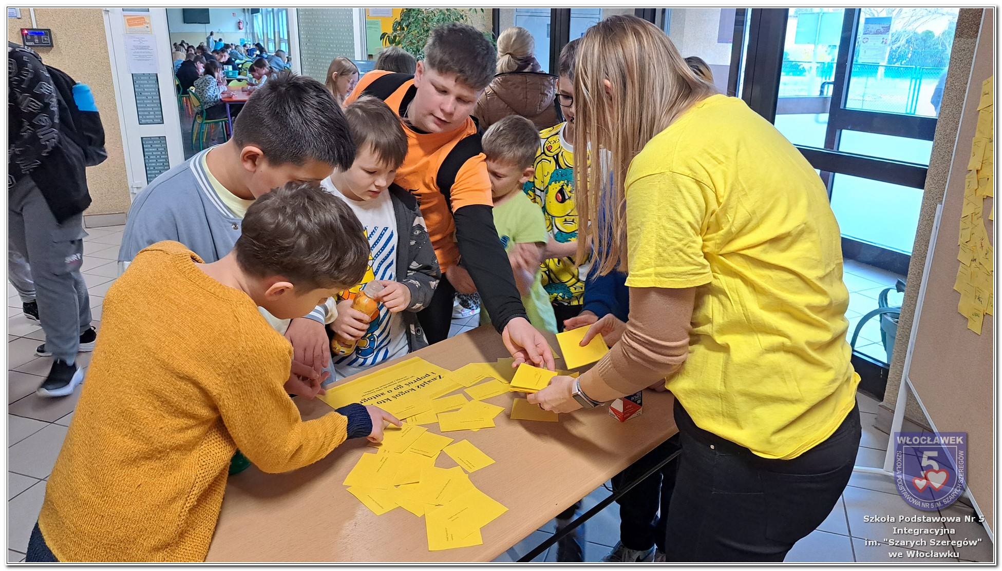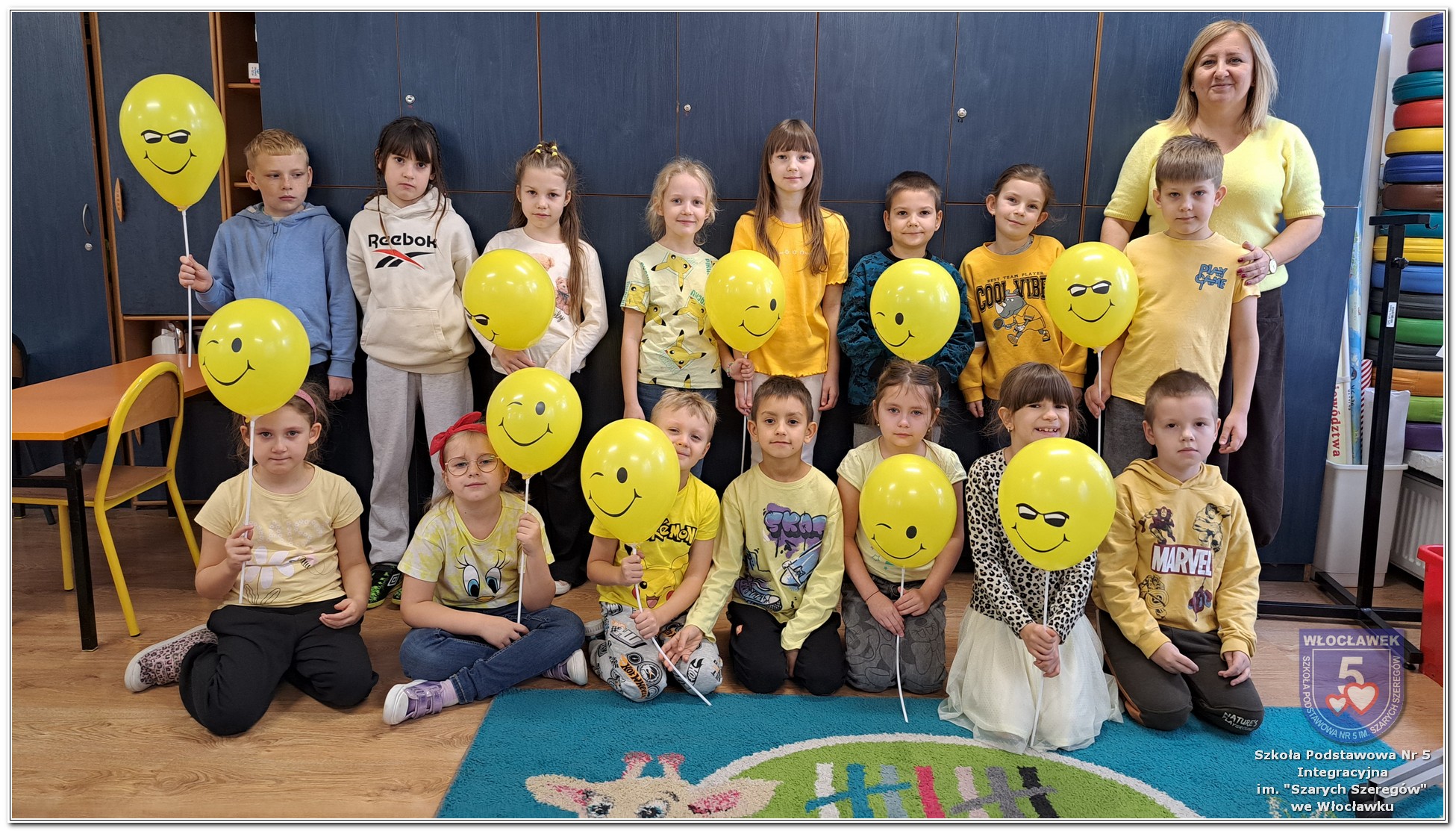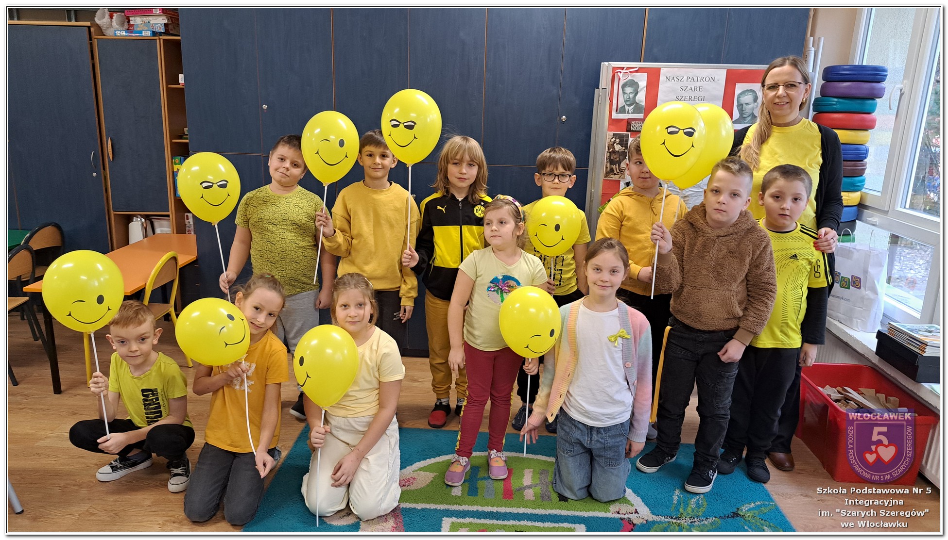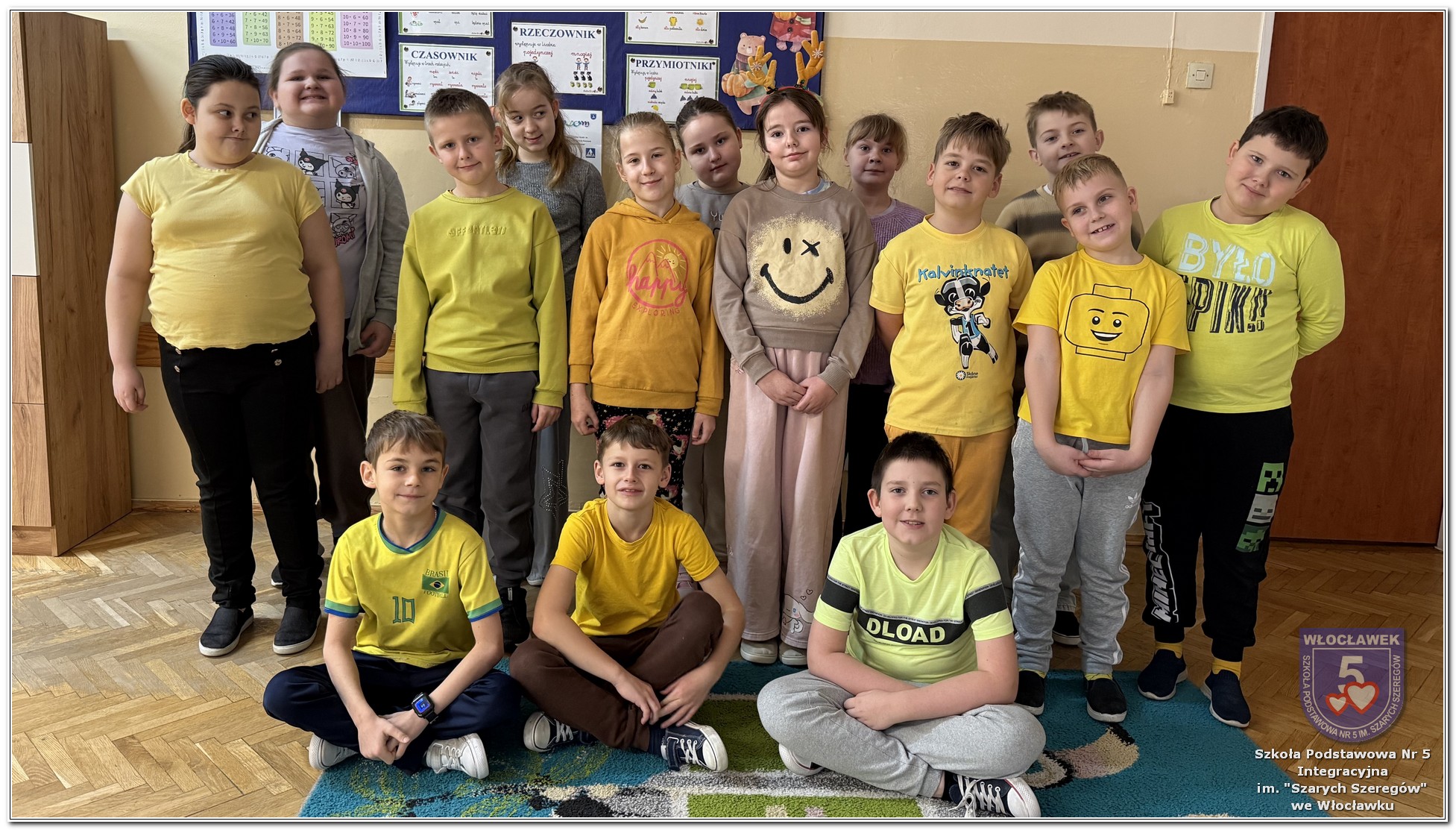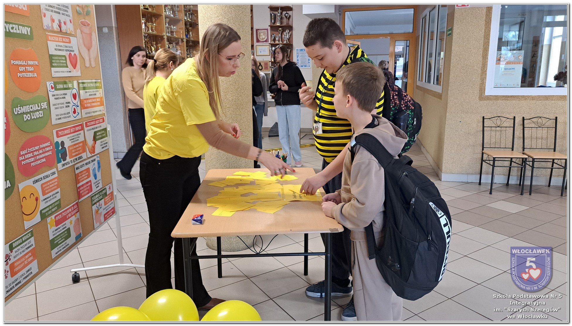 20 listopada społeczność Szkoły Podstawowej nr 5 Integracyjnej we Włocławku obchodziła Dzień Tolerancji i Życzliwości. Tego dnia w całej szkole królował kolor żółty – symbol radości, otwartości i przyjaznych relacji. Uczniowie klas I–III przygotowali „Łańcuch Tolerancji i Życzliwości”, który ozdobił hol budynku B, stając się widocznym znakiem wspólnoty i wzajemnego szacunku. Starsi uczniowie wzięli udział w zabawie „Znajdź kogoś kto…”, polegającej na zdobywaniu autografów osób spełniających warunki zapisane na żółtych karteczkach. Zebrane podpisy utworzyły radosną emotikonę, która rozbawiła całą społeczność. Aby dobry humor towarzyszył wszystkim przez cały dzień, dzieci mogły również zabrać ze sobą „dobre słowo” lub podarować je wybranej osobie. Ten prosty gest stał się pięknym symbolem życzliwości i wzajemnego wsparcia.