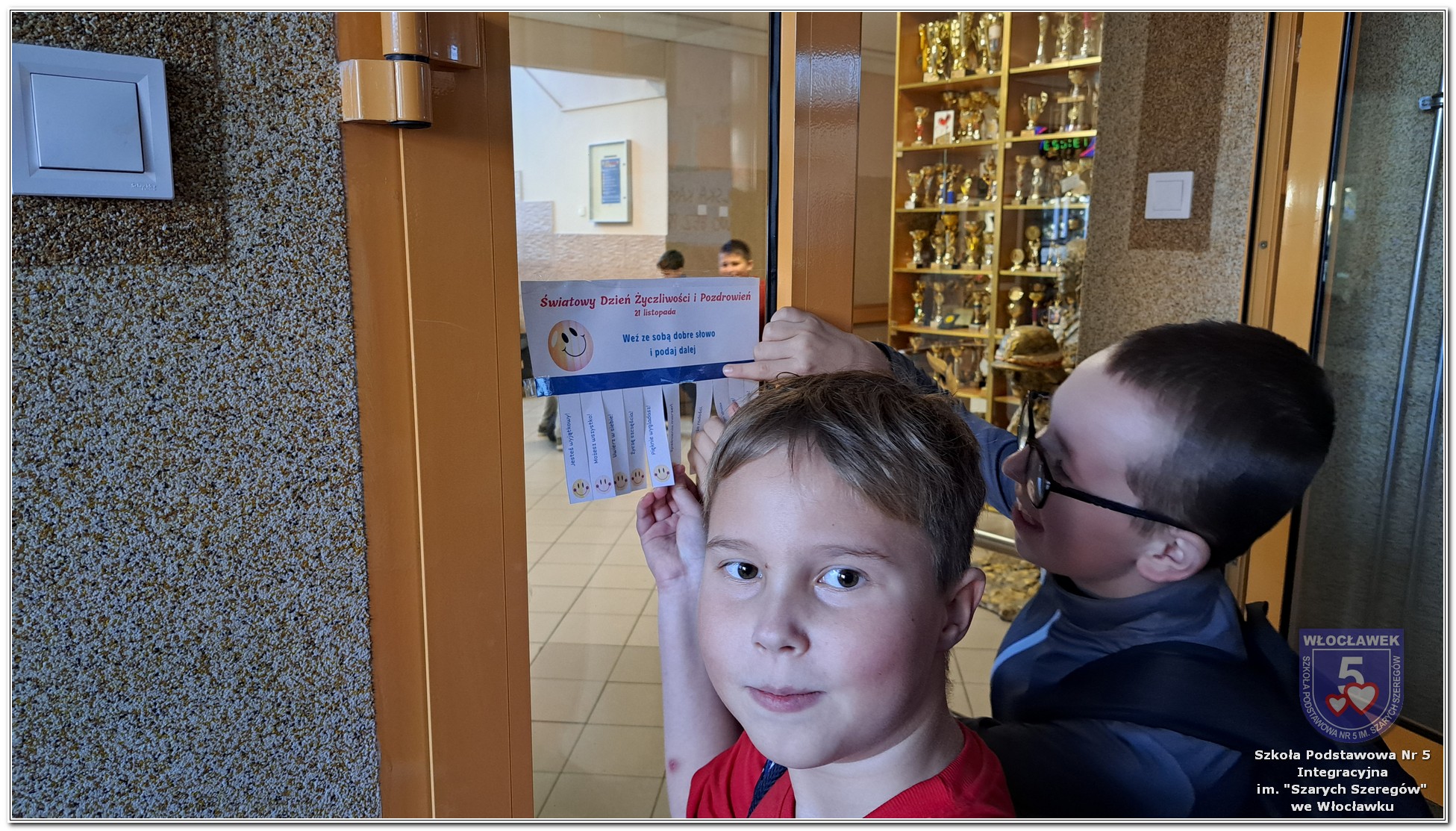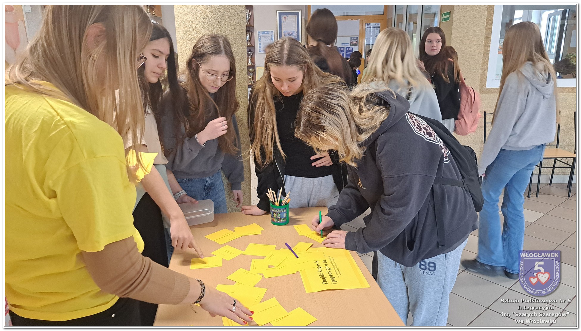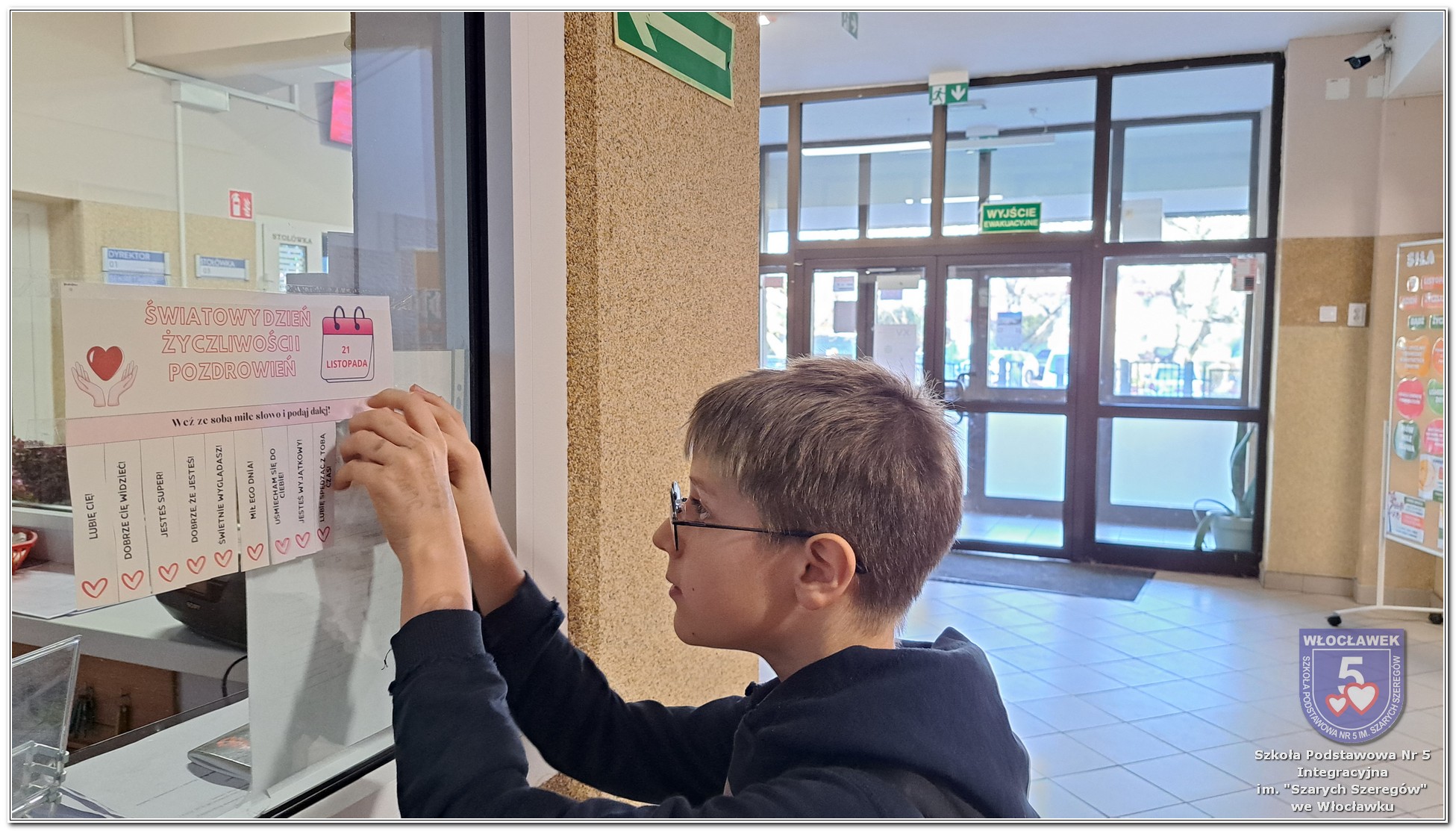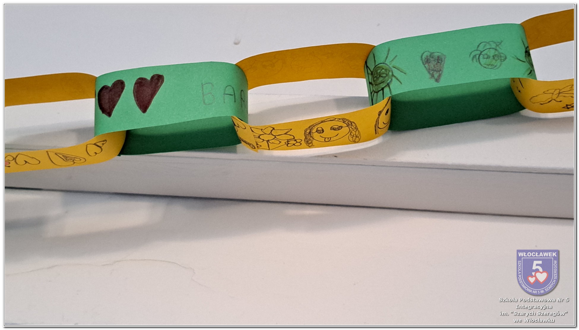 20 listopada społeczność Szkoły Podstawowej nr 5 Integracyjnej we Włocławku obchodziła Dzień Tolerancji i Życzliwości. Tego dnia w całej szkole królował kolor żółty – symbol radości, otwartości i przyjaznych relacji. Uczniowie klas I–III przygotowali „Łańcuch Tolerancji i Życzliwości”, który ozdobił hol budynku B, stając się widocznym znakiem wspólnoty i wzajemnego szacunku. Starsi uczniowie wzięli udział w zabawie „Znajdź kogoś kto…”, polegającej na zdobywaniu autografów osób spełniających warunki zapisane na żółtych karteczkach. Zebrane podpisy utworzyły radosną emotikonę, która rozbawiła całą społeczność. Aby dobry humor towarzyszył wszystkim przez cały dzień, dzieci mogły również zabrać ze sobą „dobre słowo” lub podarować je wybranej osobie. Ten prosty gest stał się pięknym symbolem życzliwości i wzajemnego wsparcia.