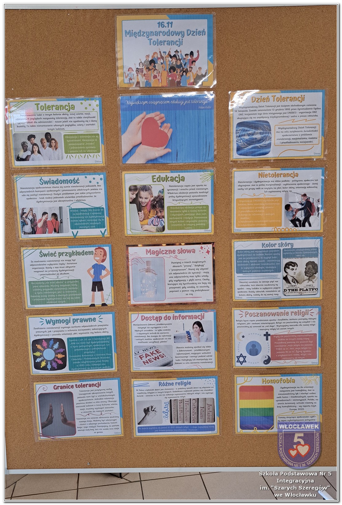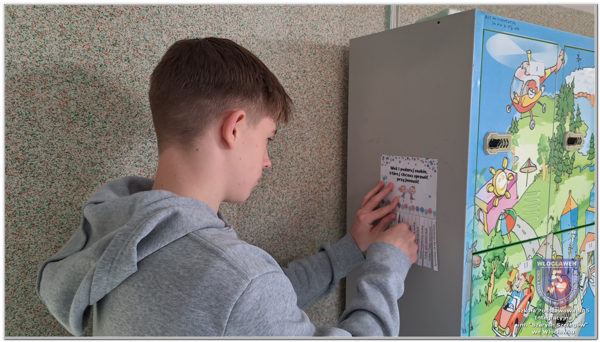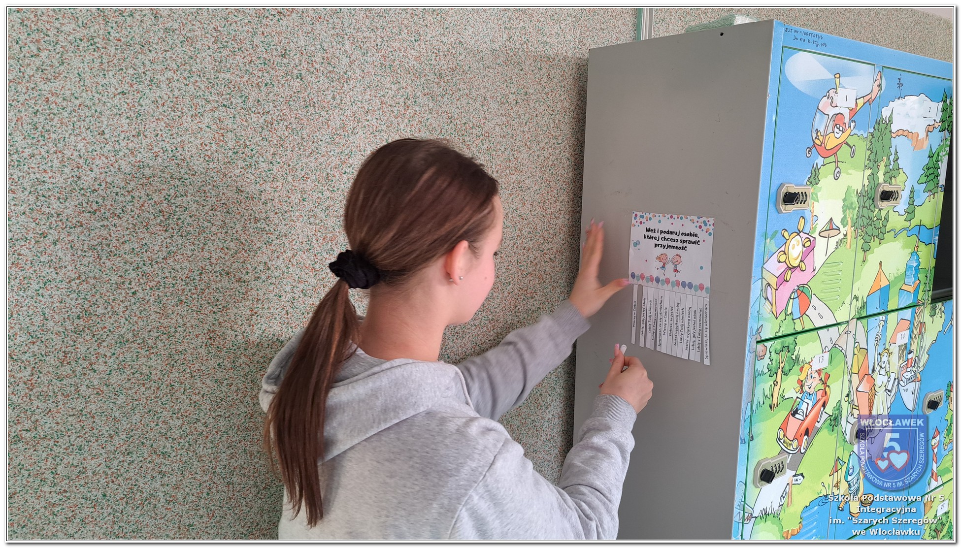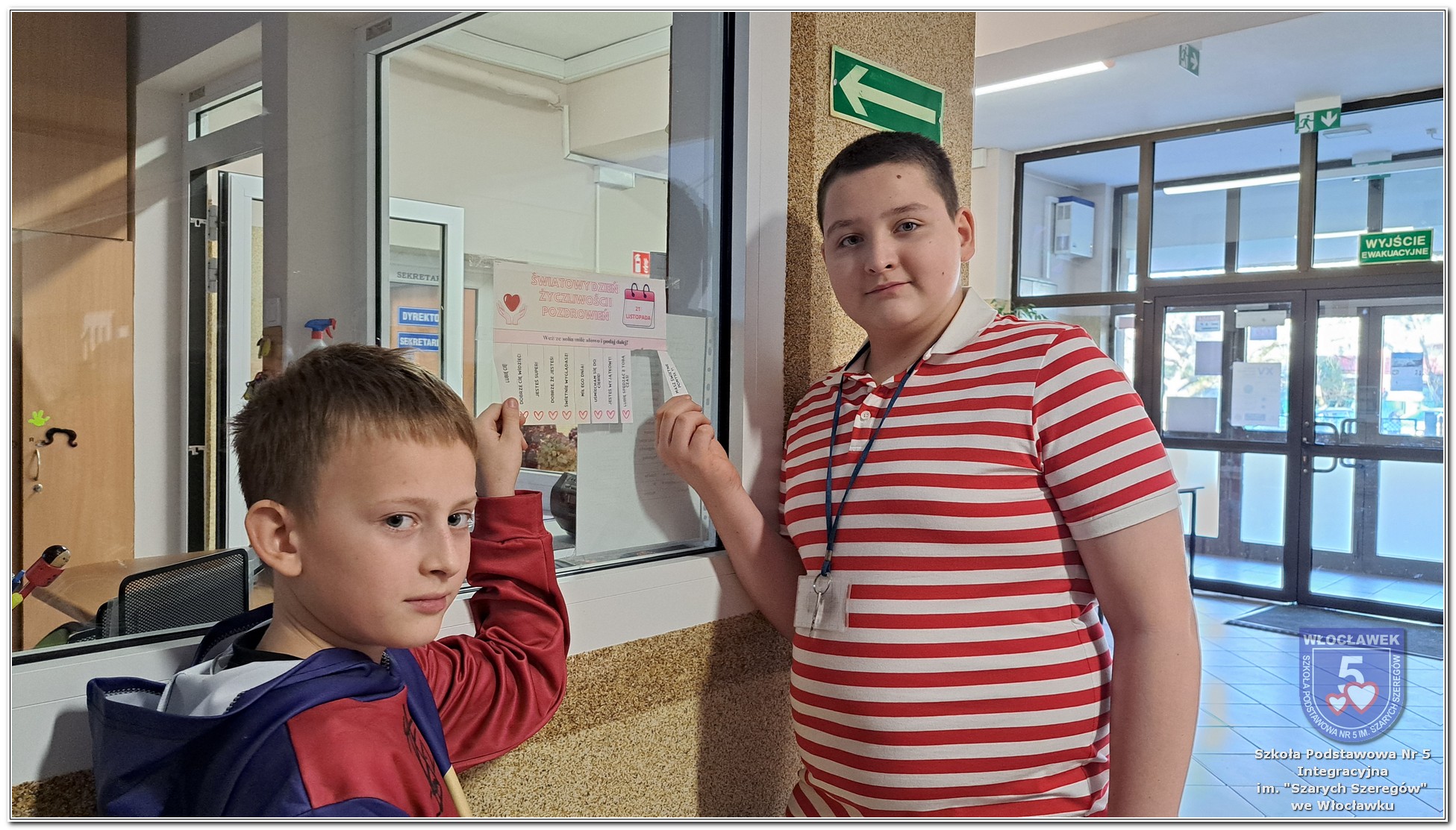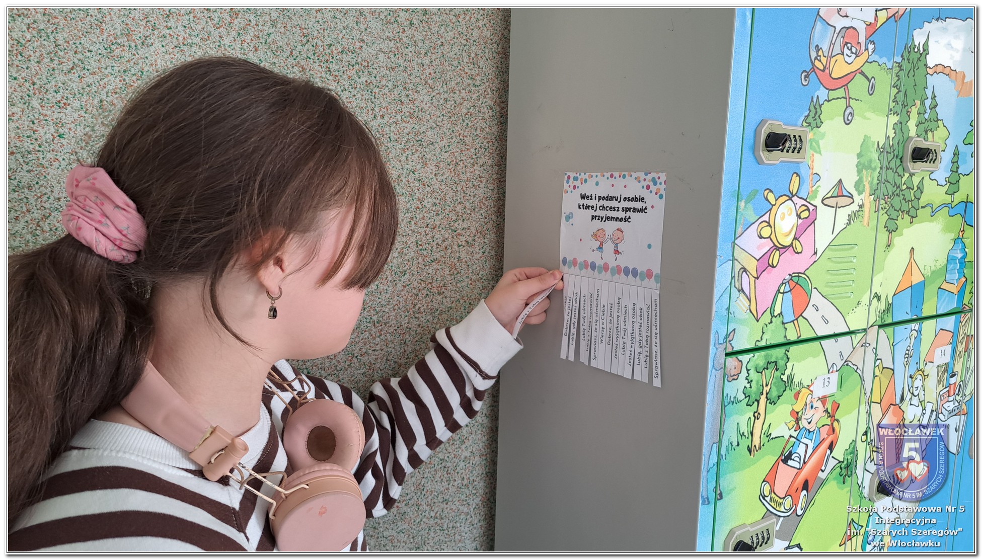 20 listopada społeczność Szkoły Podstawowej nr 5 Integracyjnej we Włocławku obchodziła Dzień Tolerancji i Życzliwości. Tego dnia w całej szkole królował kolor żółty – symbol radości, otwartości i przyjaznych relacji. Uczniowie klas I–III przygotowali „Łańcuch Tolerancji i Życzliwości”, który ozdobił hol budynku B, stając się widocznym znakiem wspólnoty i wzajemnego szacunku. Starsi uczniowie wzięli udział w zabawie „Znajdź kogoś kto…”, polegającej na zdobywaniu autografów osób spełniających warunki zapisane na żółtych karteczkach. Zebrane podpisy utworzyły radosną emotikonę, która rozbawiła całą społeczność. Aby dobry humor towarzyszył wszystkim przez cały dzień, dzieci mogły również zabrać ze sobą „dobre słowo” lub podarować je wybranej osobie. Ten prosty gest stał się pięknym symbolem życzliwości i wzajemnego wsparcia.
