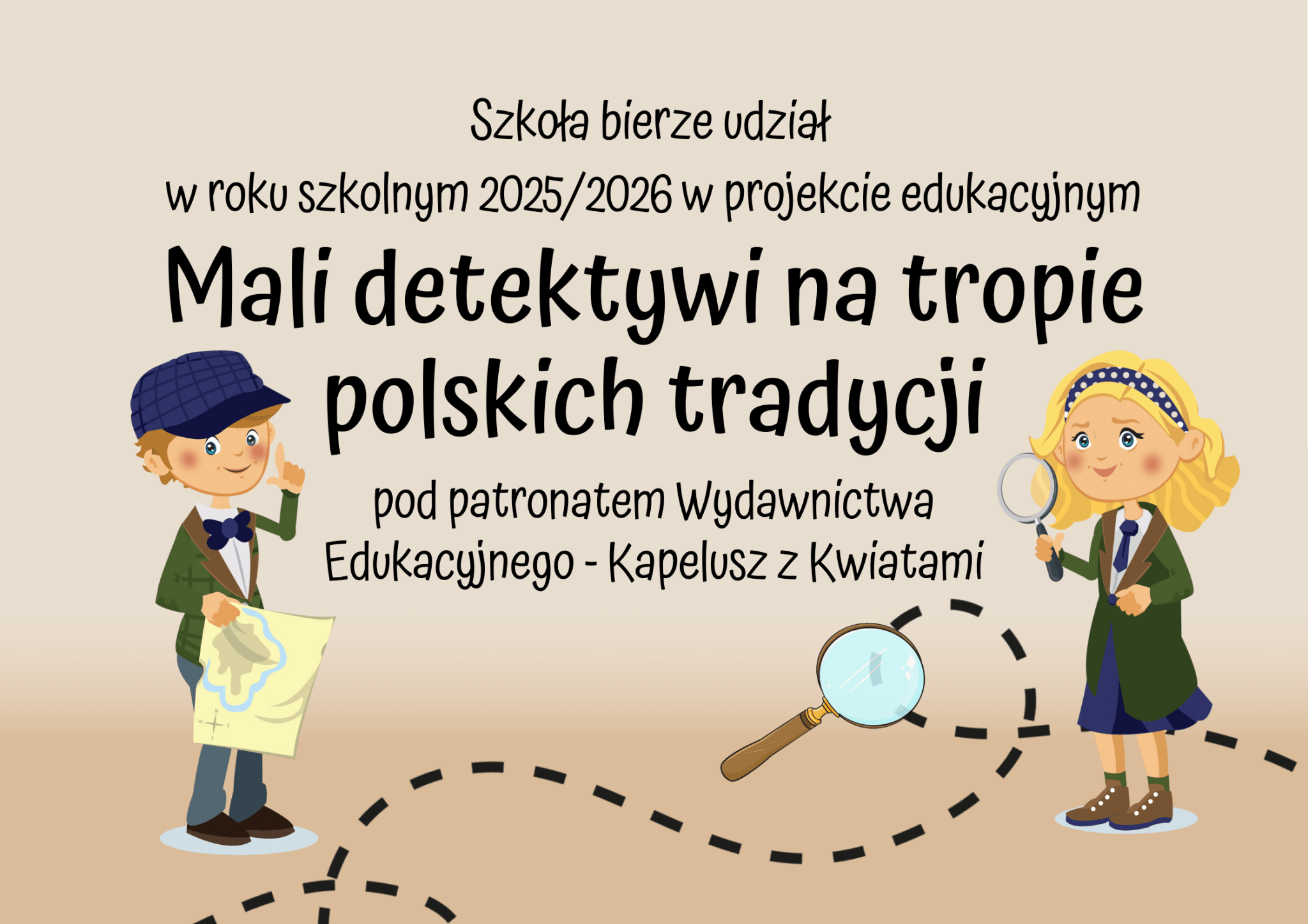 Z radością informujemy, że klasa 3b dołączyła do Ogólnopolskiego Projektu Edukacyjnego „Mali detektywi na tropie polskich tradycji”. Projekt ma na celu przybliżenie dzieciom bogactwa polskich tradycji oraz pomoc w ich głębszym zrozumieniu. Ważnym jego aspektem jest również kształtowanie postaw społecznych i patriotycznych, rozwijanie kreatywności uczniów oraz wzmacnianie ich poczucia tożsamości narodowej. Od grudnia 2025 r. do maja 2026 r. uczniowie 3b będą odkrywać fascynujące oblicza polskiej kultury. W tej wyjątkowej przygodzie towarzyszyć im będą młodzi detektywi — Alicja i Adaś, którzy zaproszą dzieci do udziału w pełnym tajemnic i niespodzianek dochodzeniu.