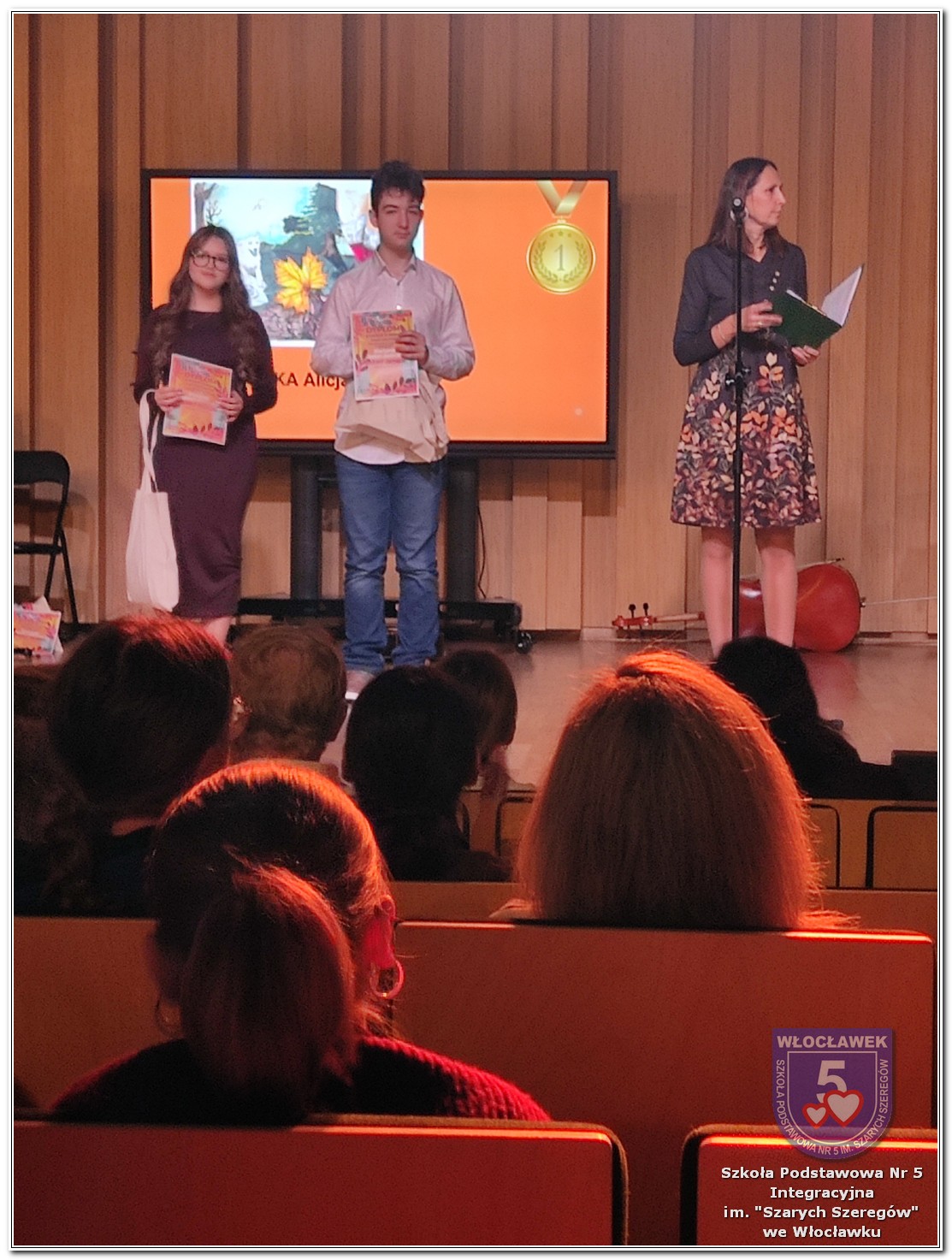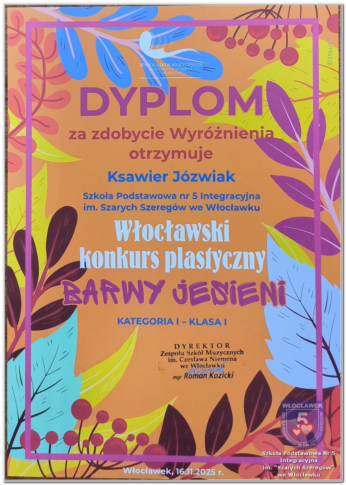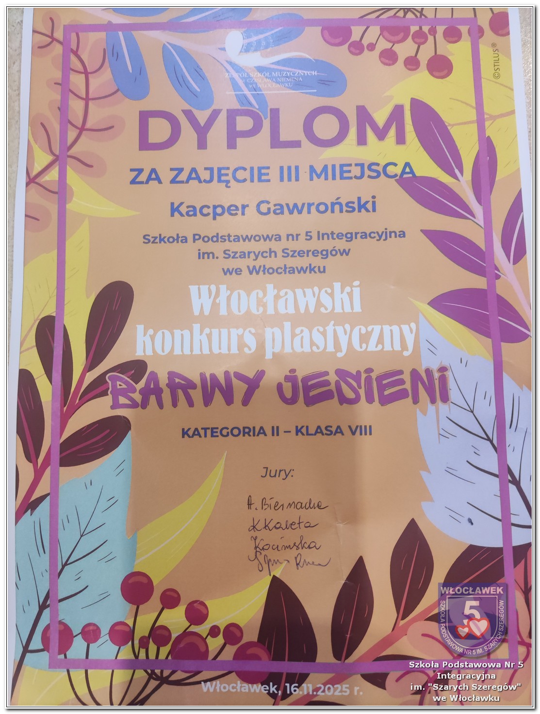 Z wielką radością informujemy o sukcesie naszych uczniów we Włocławskim Konkursie Plastycznym ,,Barwy jesieni" organizowanym przez Zespół Szkół Muzycznych im. Czesława Niemena we Włocławku. Decyzją jury Kacper Gawroński z klasy 8c zastał laureatem konkursu, a Ksawier Jóźwiak z 1a otrzymał wyróżnienie.