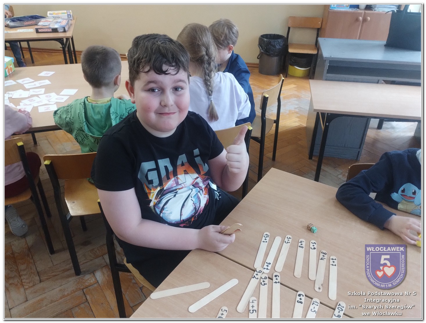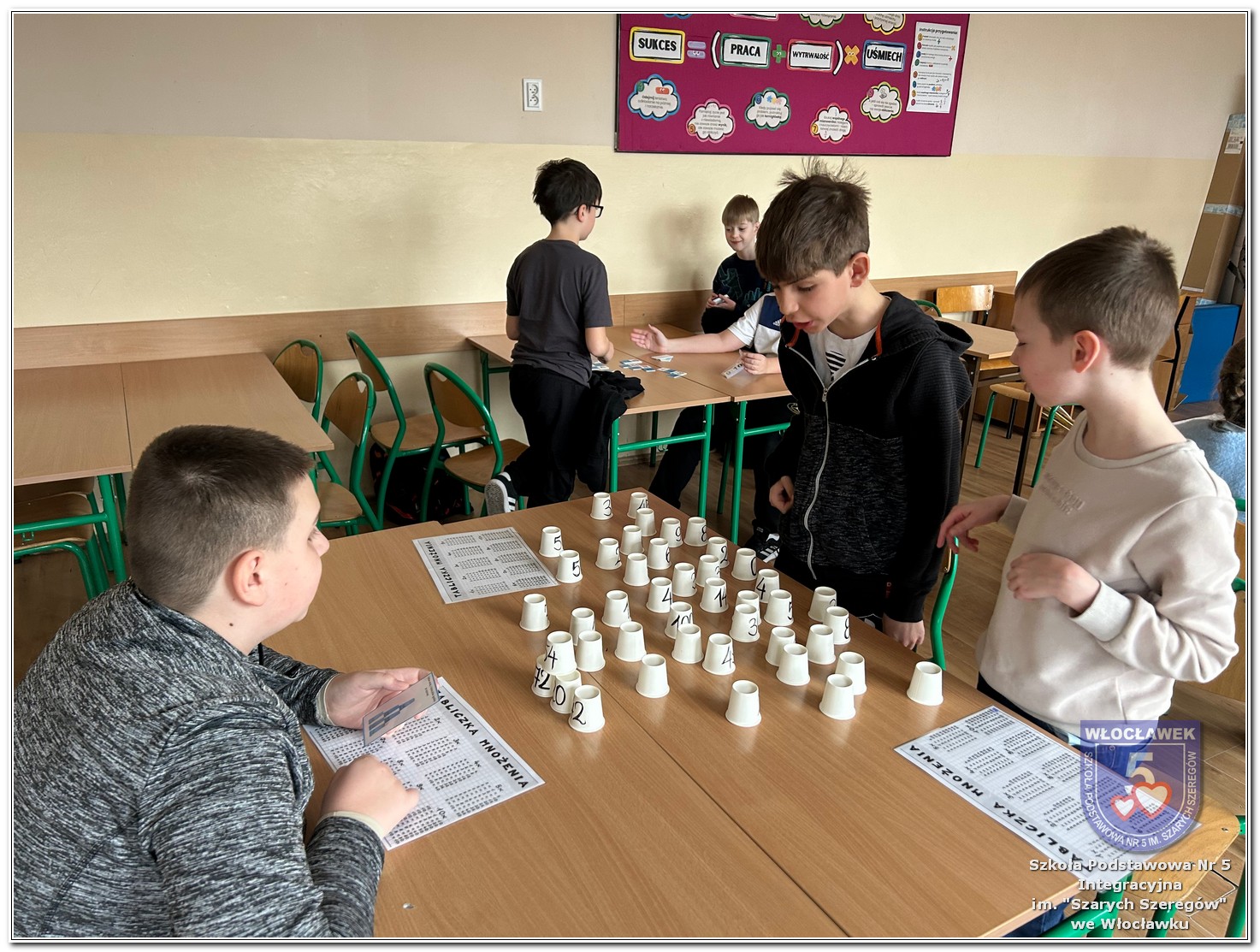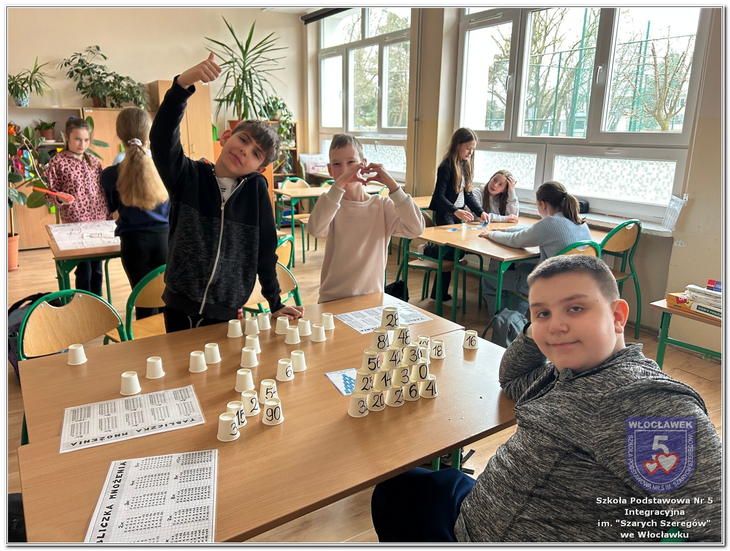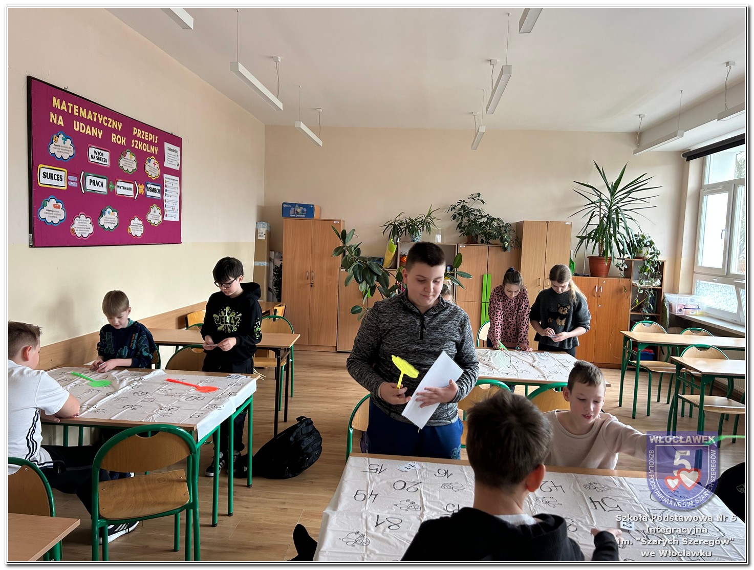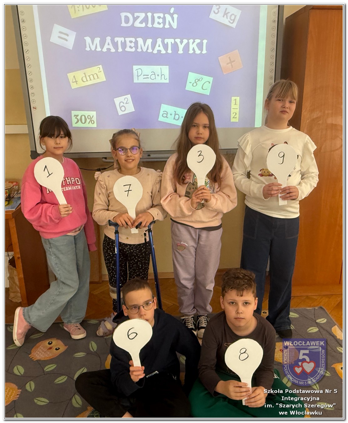 Dnia 12 marca w naszej szkole obchodziliśmy Międzynarodowy Dzień Matematyki. Z tej okazji uczniowie uczestniczyli w nietypowych lekcjach, podczas których mieli możliwość spojrzeć na matematykę z innej, bardziej przystępnej i ciekawej strony. Uczniowie z dużym zaangażowaniem uczestniczyli w różnorodnych grach i zabawach matematycznych, takich jak „Bingo matematyczne”, „Matematyczne muchy” czy „Kubeczkowe wieże”. Chętnie układali domino matematyczne, w którym poprawne zamknięcie wymagało trafnego rozwiązania działań, mierzyli się z łamigłówkami zapałkowymi oraz układali Schubitrix. Swoje umiejętności mogli również sprawdzić, biorąc udział w konkursie Sudoku. Dodatkowo uczniowie tworzyli różnorodne układy z tangramów, rozwijając przy tym wyobraźnię, spostrzegawczość oraz umiejętność logicznego myślenia. Udział w tych aktywnościach miał na celu pokazanie, że matematyka – nazywana Królową Nauk – może być nie tylko wymagająca, ale także ciekawa i pełna dobrej zabawy. W ramach obchodów wielu uczniów wzięło również udział w konkursie na plakat pt. „Symetria wokół nas”, wykazując się kreatywnością i dostrzeganiem matematyki w otaczającym świecie. Ponadto uczniowie naszej szkoły wykonali parkietaż, który stał się efektowną dekoracją szkolnego korytarza. Obchody tego dnia były doskonałą okazją do pokazania, że matematyka może być fascynująca i bliska codziennemu życiu.