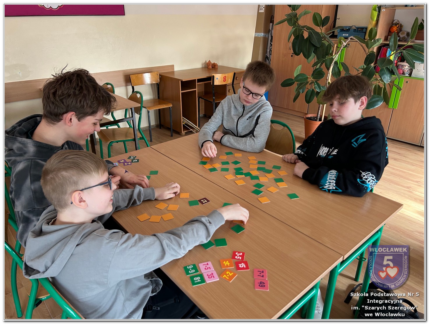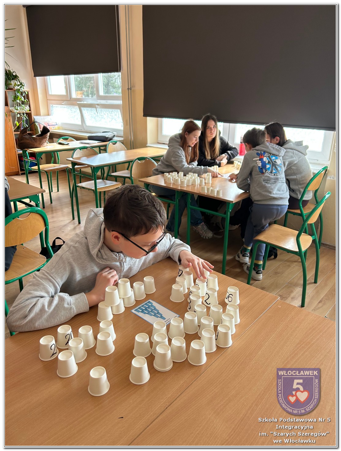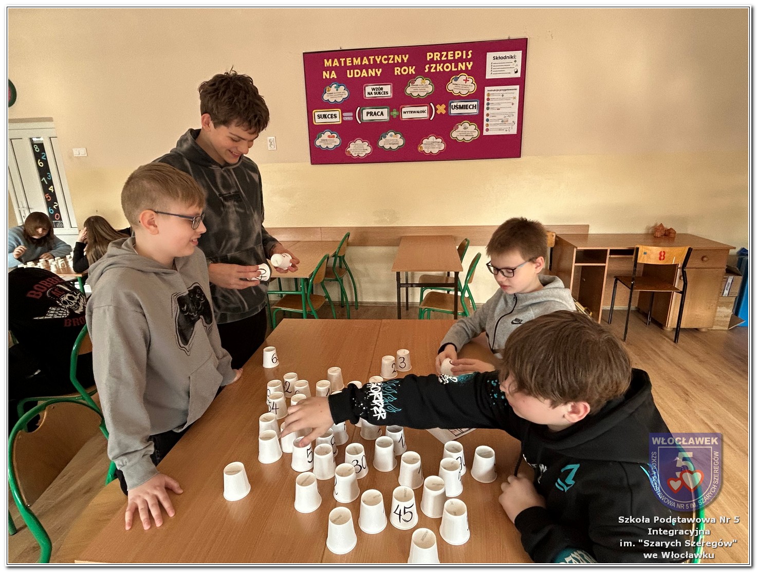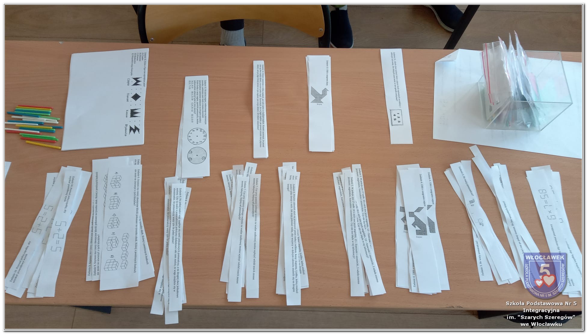 Dnia 12 marca w naszej szkole obchodziliśmy Międzynarodowy Dzień Matematyki. Z tej okazji uczniowie uczestniczyli w nietypowych lekcjach, podczas których mieli możliwość spojrzeć na matematykę z innej, bardziej przystępnej i ciekawej strony. Uczniowie z dużym zaangażowaniem uczestniczyli w różnorodnych grach i zabawach matematycznych, takich jak „Bingo matematyczne”, „Matematyczne muchy” czy „Kubeczkowe wieże”. Chętnie układali domino matematyczne, w którym poprawne zamknięcie wymagało trafnego rozwiązania działań, mierzyli się z łamigłówkami zapałkowymi oraz układali Schubitrix. Swoje umiejętności mogli również sprawdzić, biorąc udział w konkursie Sudoku. Dodatkowo uczniowie tworzyli różnorodne układy z tangramów, rozwijając przy tym wyobraźnię, spostrzegawczość oraz umiejętność logicznego myślenia. Udział w tych aktywnościach miał na celu pokazanie, że matematyka – nazywana Królową Nauk – może być nie tylko wymagająca, ale także ciekawa i pełna dobrej zabawy. W ramach obchodów wielu uczniów wzięło również udział w konkursie na plakat pt. „Symetria wokół nas”, wykazując się kreatywnością i dostrzeganiem matematyki w otaczającym świecie. Ponadto uczniowie naszej szkoły wykonali parkietaż, który stał się efektowną dekoracją szkolnego korytarza. Obchody tego dnia były doskonałą okazją do pokazania, że matematyka może być fascynująca i bliska codziennemu życiu.
