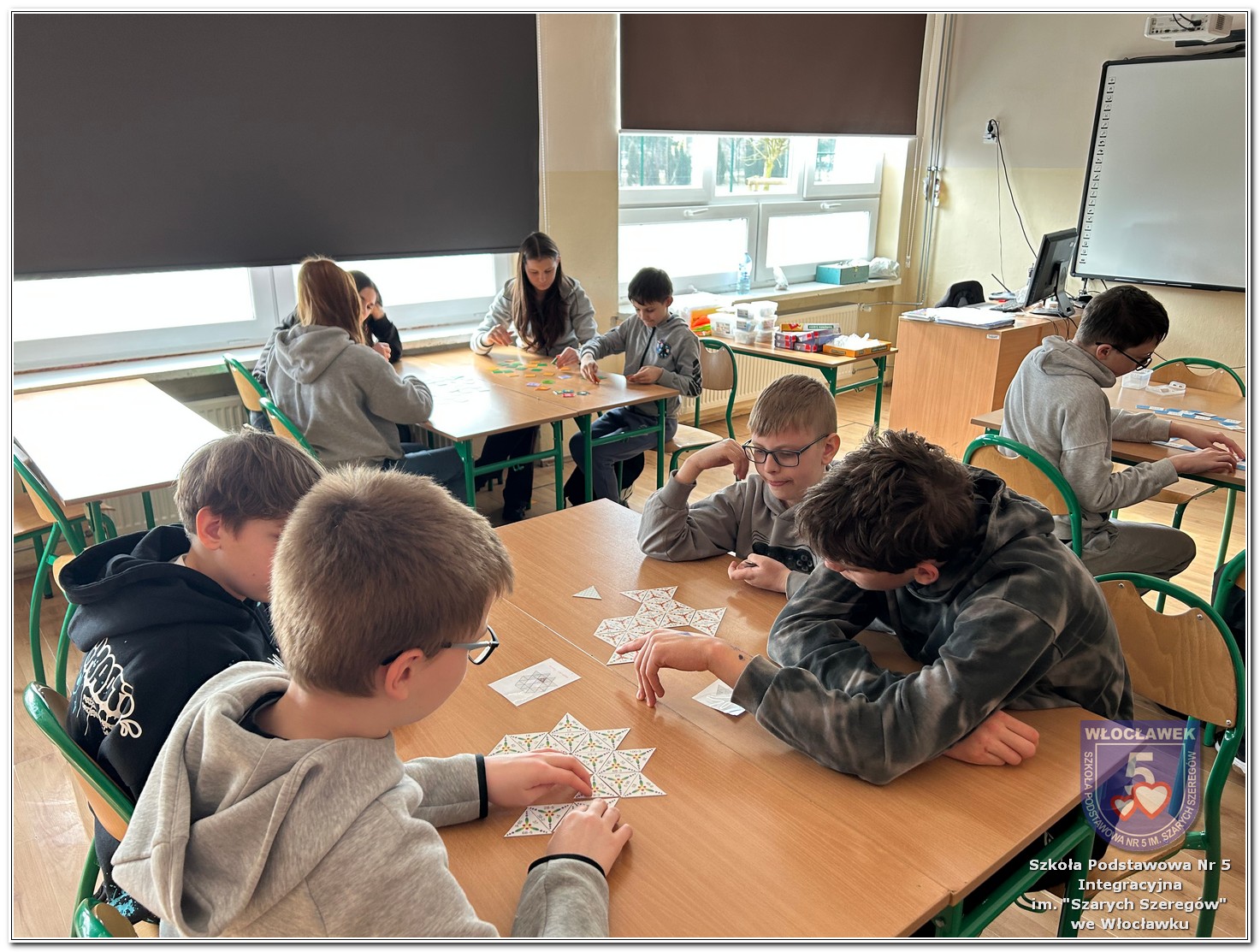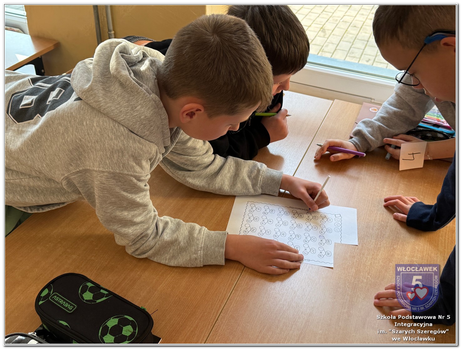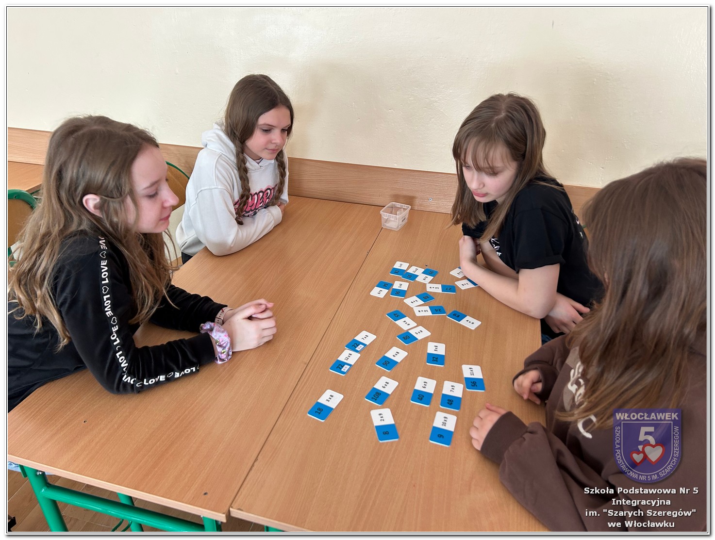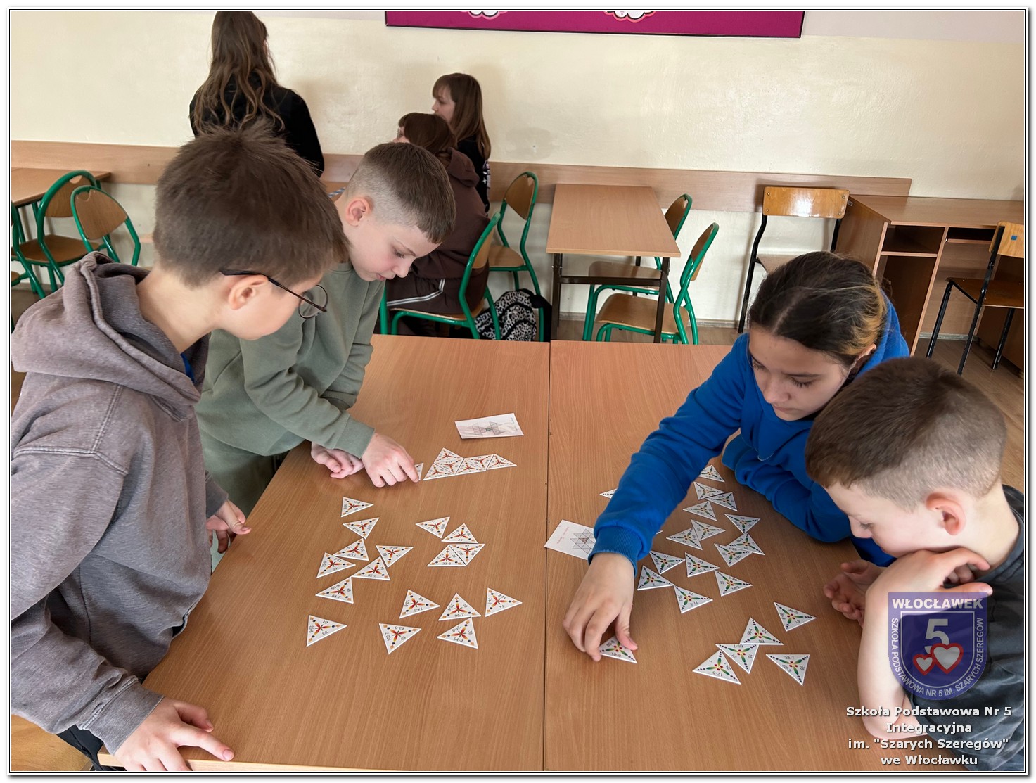 Dnia 12 marca w naszej szkole obchodziliśmy Międzynarodowy Dzień Matematyki. Z tej okazji uczniowie uczestniczyli w nietypowych lekcjach, podczas których mieli możliwość spojrzeć na matematykę z innej, bardziej przystępnej i ciekawej strony. Uczniowie z dużym zaangażowaniem uczestniczyli w różnorodnych grach i zabawach matematycznych, takich jak „Bingo matematyczne”, „Matematyczne muchy” czy „Kubeczkowe wieże”. Chętnie układali domino matematyczne, w którym poprawne zamknięcie wymagało trafnego rozwiązania działań, mierzyli się z łamigłówkami zapałkowymi oraz układali Schubitrix. Swoje umiejętności mogli również sprawdzić, biorąc udział w konkursie Sudoku. Dodatkowo uczniowie tworzyli różnorodne układy z tangramów, rozwijając przy tym wyobraźnię, spostrzegawczość oraz umiejętność logicznego myślenia. Udział w tych aktywnościach miał na celu pokazanie, że matematyka – nazywana Królową Nauk – może być nie tylko wymagająca, ale także ciekawa i pełna dobrej zabawy. W ramach obchodów wielu uczniów wzięło również udział w konkursie na plakat pt. „Symetria wokół nas”, wykazując się kreatywnością i dostrzeganiem matematyki w otaczającym świecie. Ponadto uczniowie naszej szkoły wykonali parkietaż, który stał się efektowną dekoracją szkolnego korytarza. Obchody tego dnia były doskonałą okazją do pokazania, że matematyka może być fascynująca i bliska codziennemu życiu.