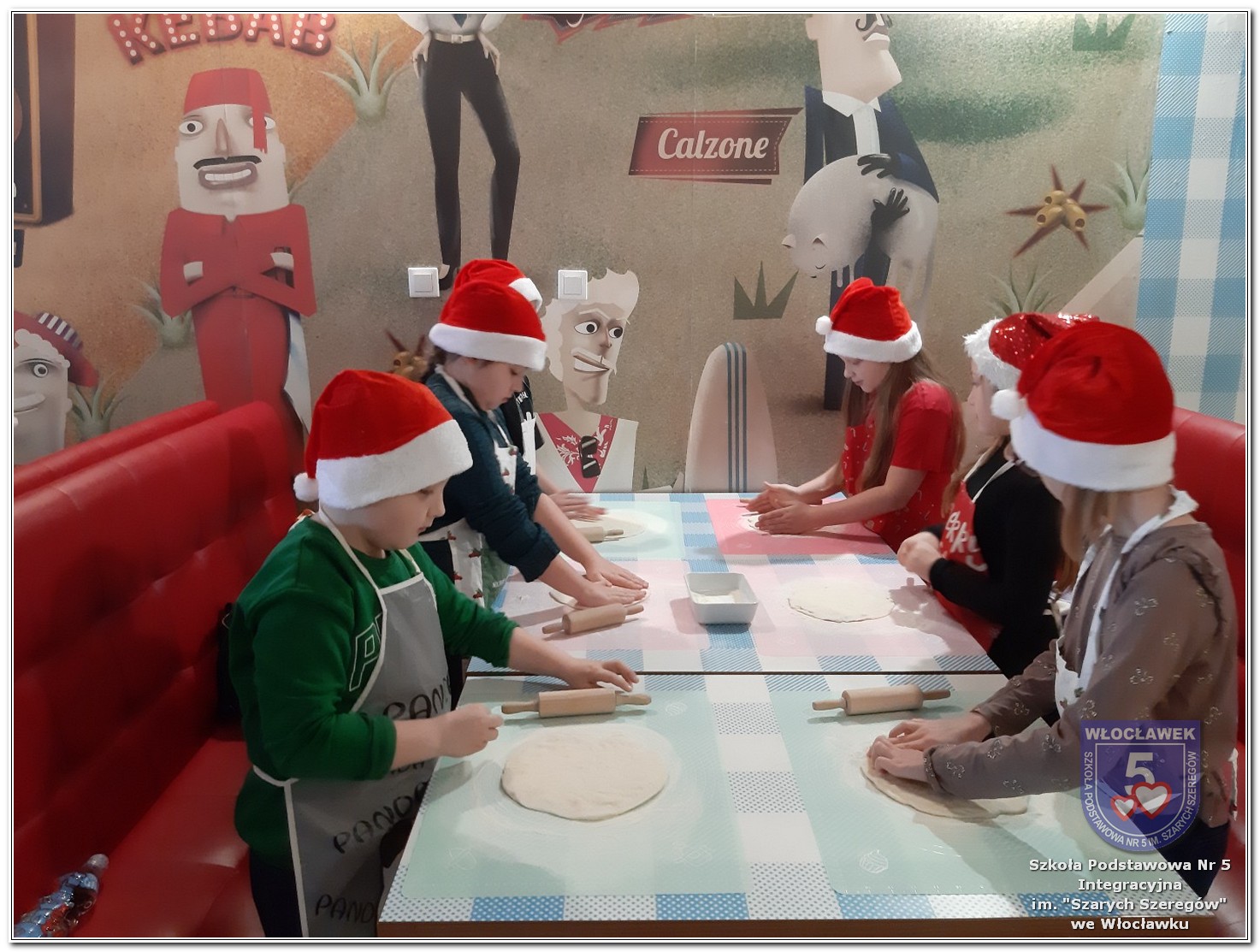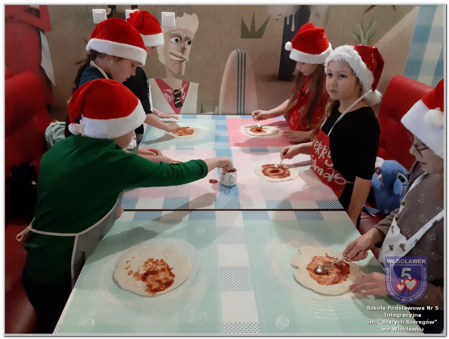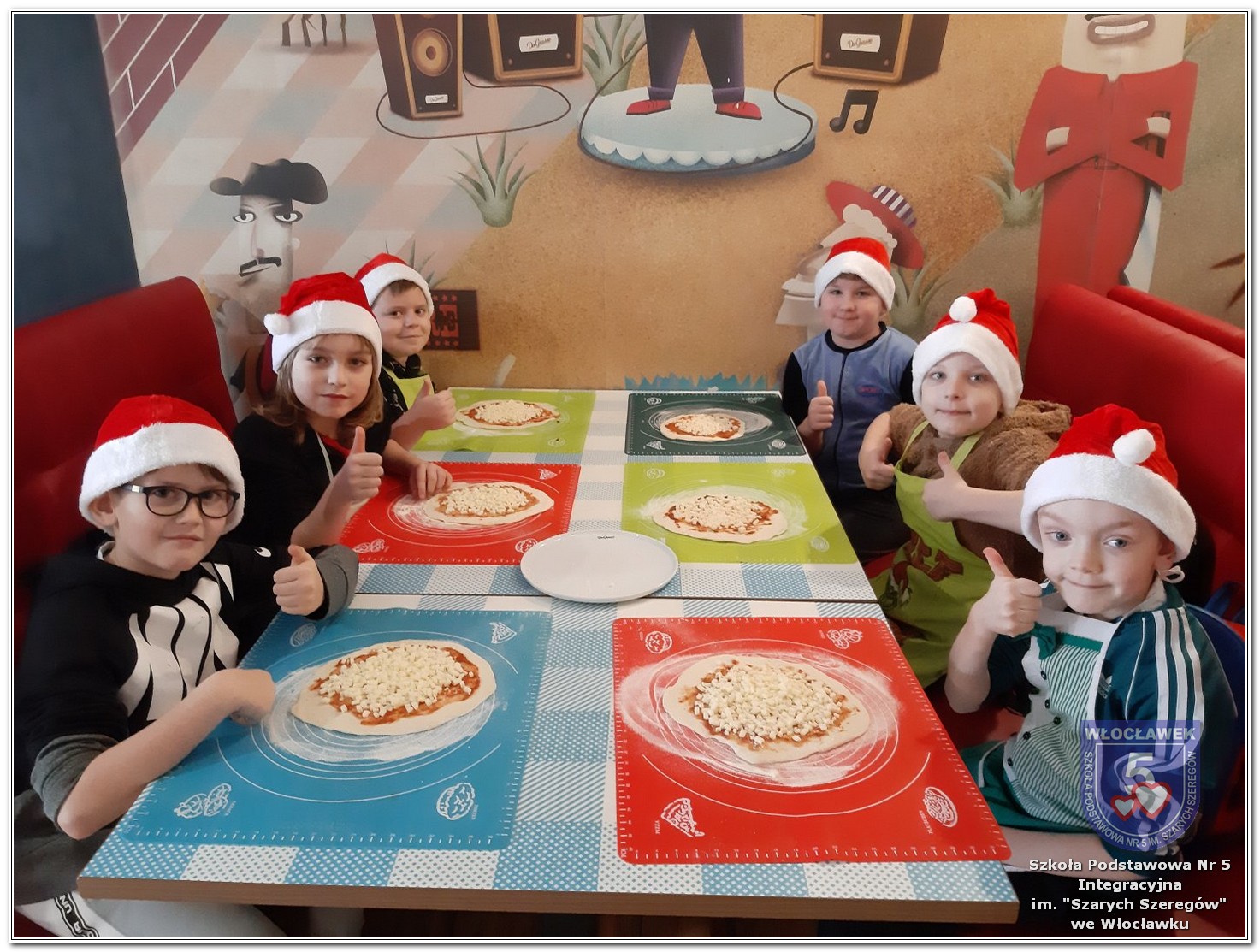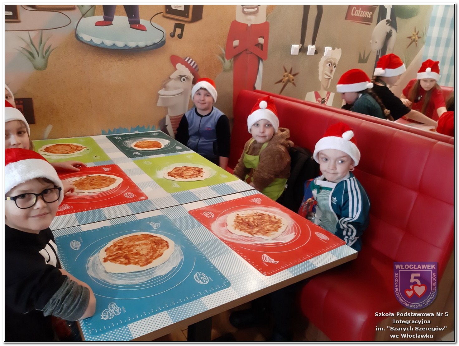 Tuż przed zbliżającymi się Mikołajkami, uczniowie klasy 2b pod opieką wychowawców udali się do pizzerii Da Grasso na warsztaty kulinarne. Dzięki uprzejmości rodziców Franka, którzy zorganizowali tę przedświąteczną niespodziankę, dzieci miały okazję poznać zawód kucharza, jak również same mogły sprawdzić się w tej roli przygotowując samodzielnie pizze pod czujnym okiem pracowników. Każdy z niecierpliwością oczekiwał aż jego pizza będzie gotowa, a następnie wszyscy ze smakiem degustowali małe kulinarne dzieła. Pizze były wyśmienite, humory dopisywały, a nowe doświadczenia z pewnością przydadzą się w przyszłości. Wszyscy zasłużyli na sprawność kuchcika, czego dowodem są piękne pamiątkowe dyplomy.