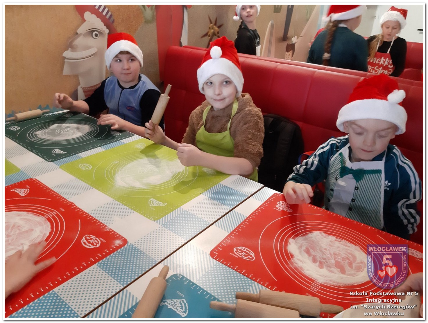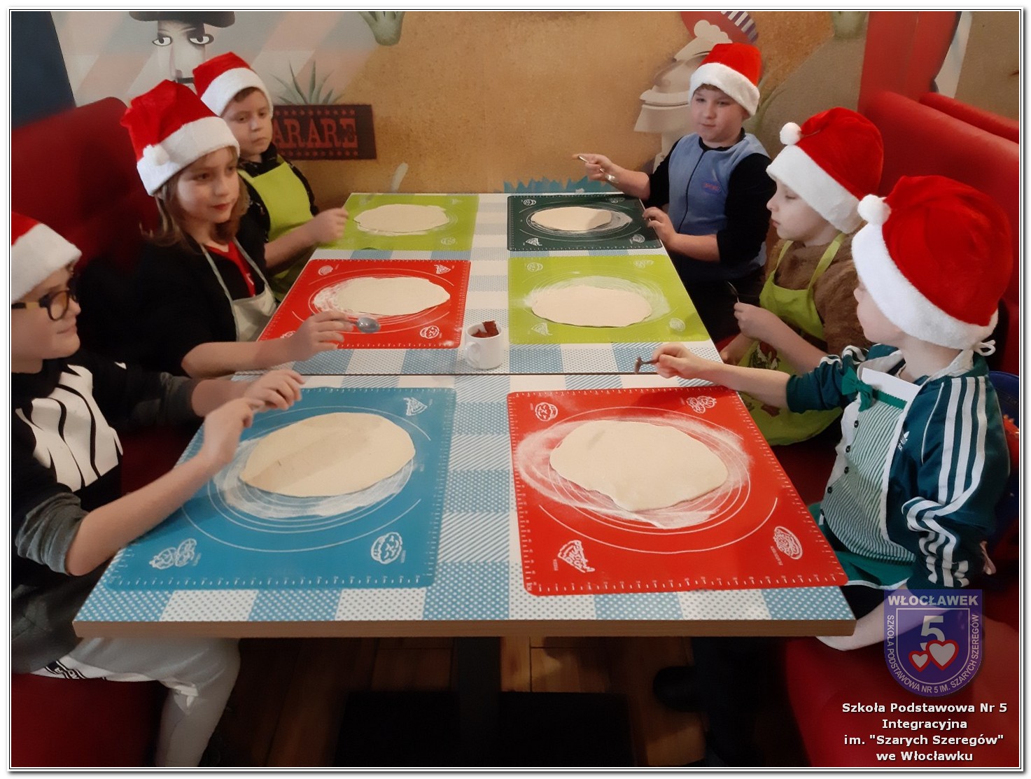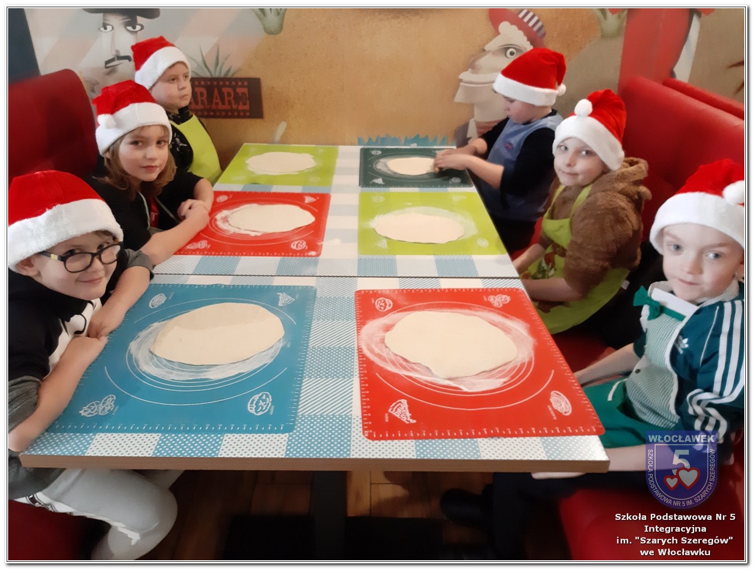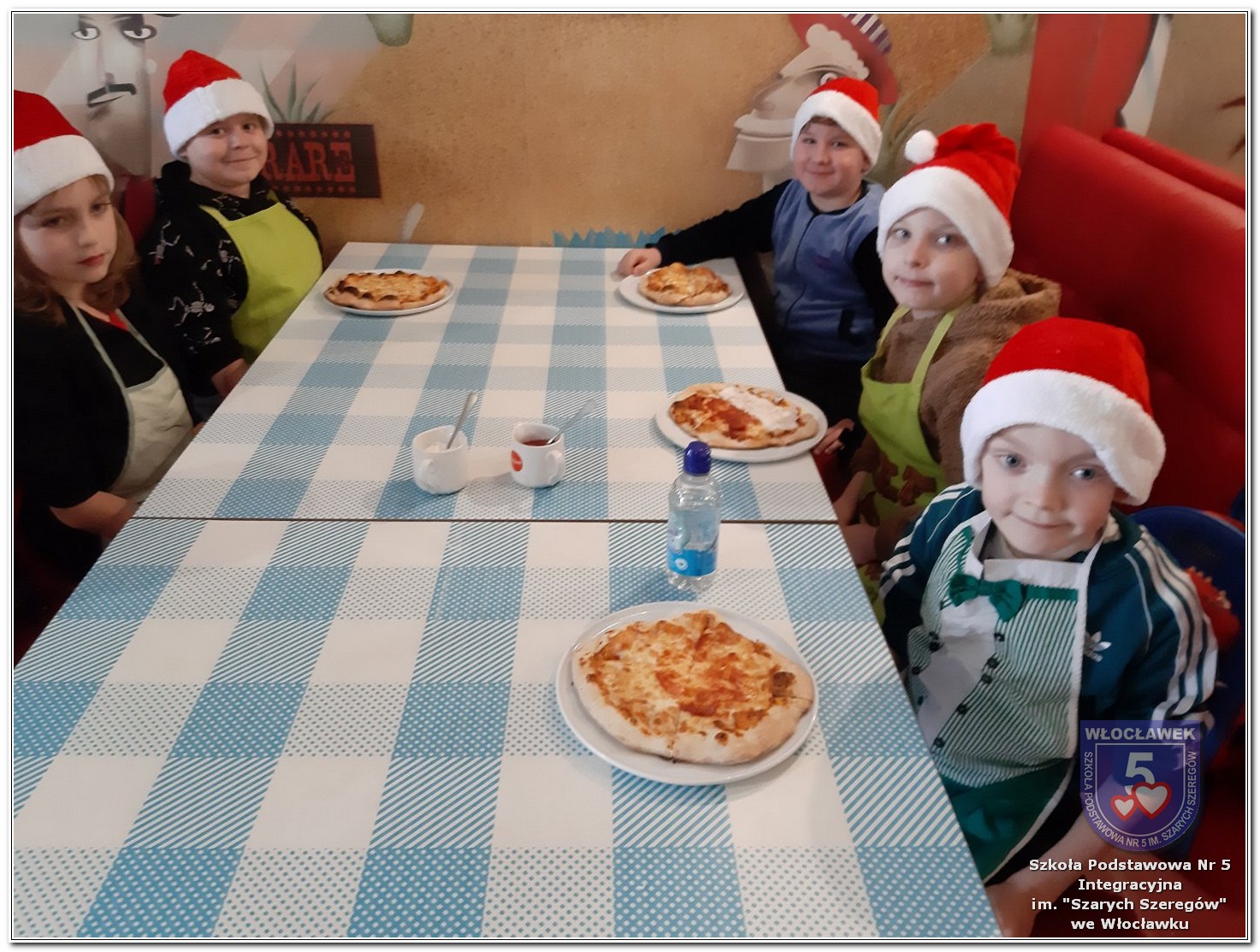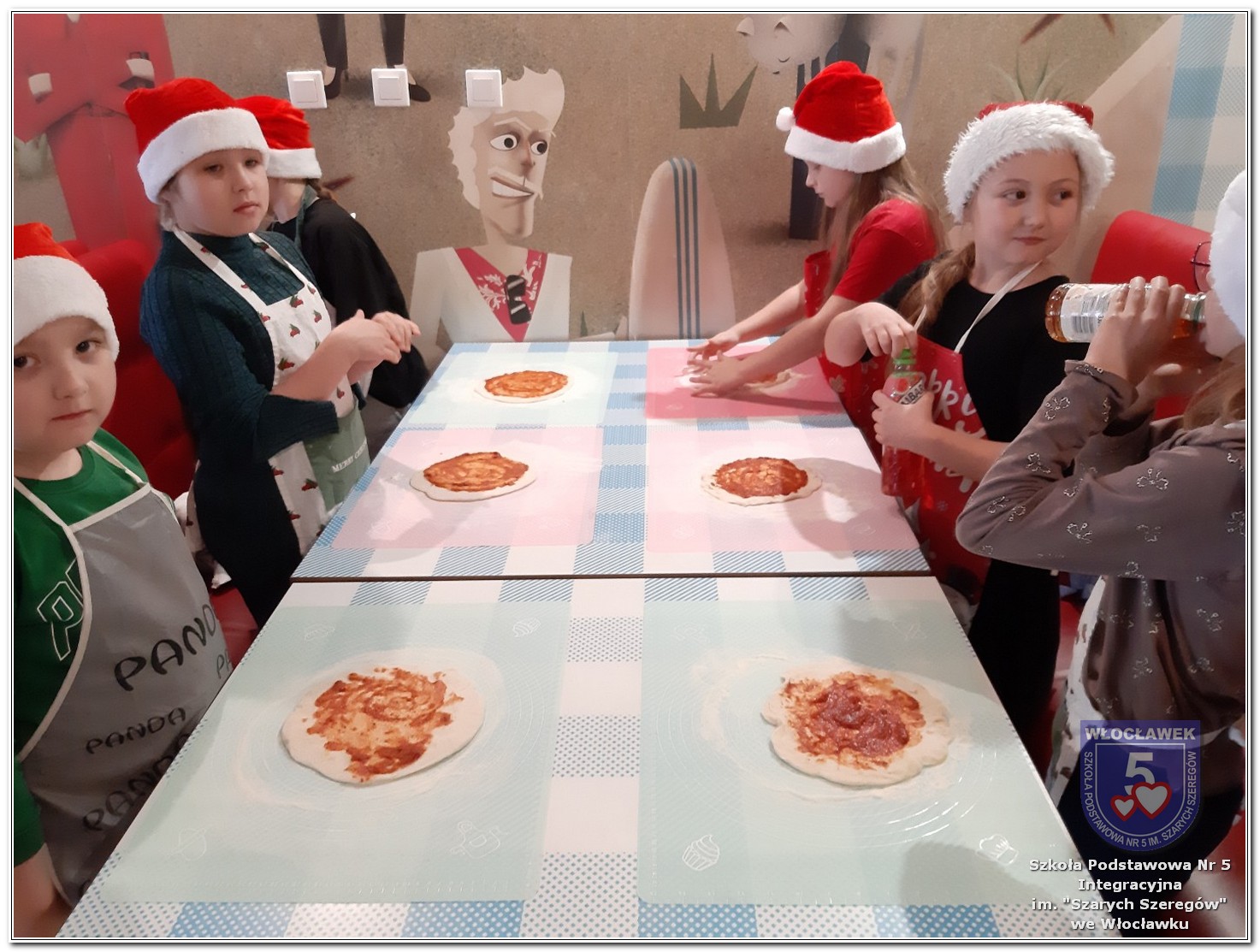 Tuż przed zbliżającymi się Mikołajkami, uczniowie klasy 2b pod opieką wychowawców udali się do pizzerii Da Grasso na warsztaty kulinarne. Dzięki uprzejmości rodziców Franka, którzy zorganizowali tę przedświąteczną niespodziankę, dzieci miały okazję poznać zawód kucharza, jak również same mogły sprawdzić się w tej roli przygotowując samodzielnie pizze pod czujnym okiem pracowników. Każdy z niecierpliwością oczekiwał aż jego pizza będzie gotowa, a następnie wszyscy ze smakiem degustowali małe kulinarne dzieła. Pizze były wyśmienite, humory dopisywały, a nowe doświadczenia z pewnością przydadzą się w przyszłości. Wszyscy zasłużyli na sprawność kuchcika, czego dowodem są piękne pamiątkowe dyplomy.