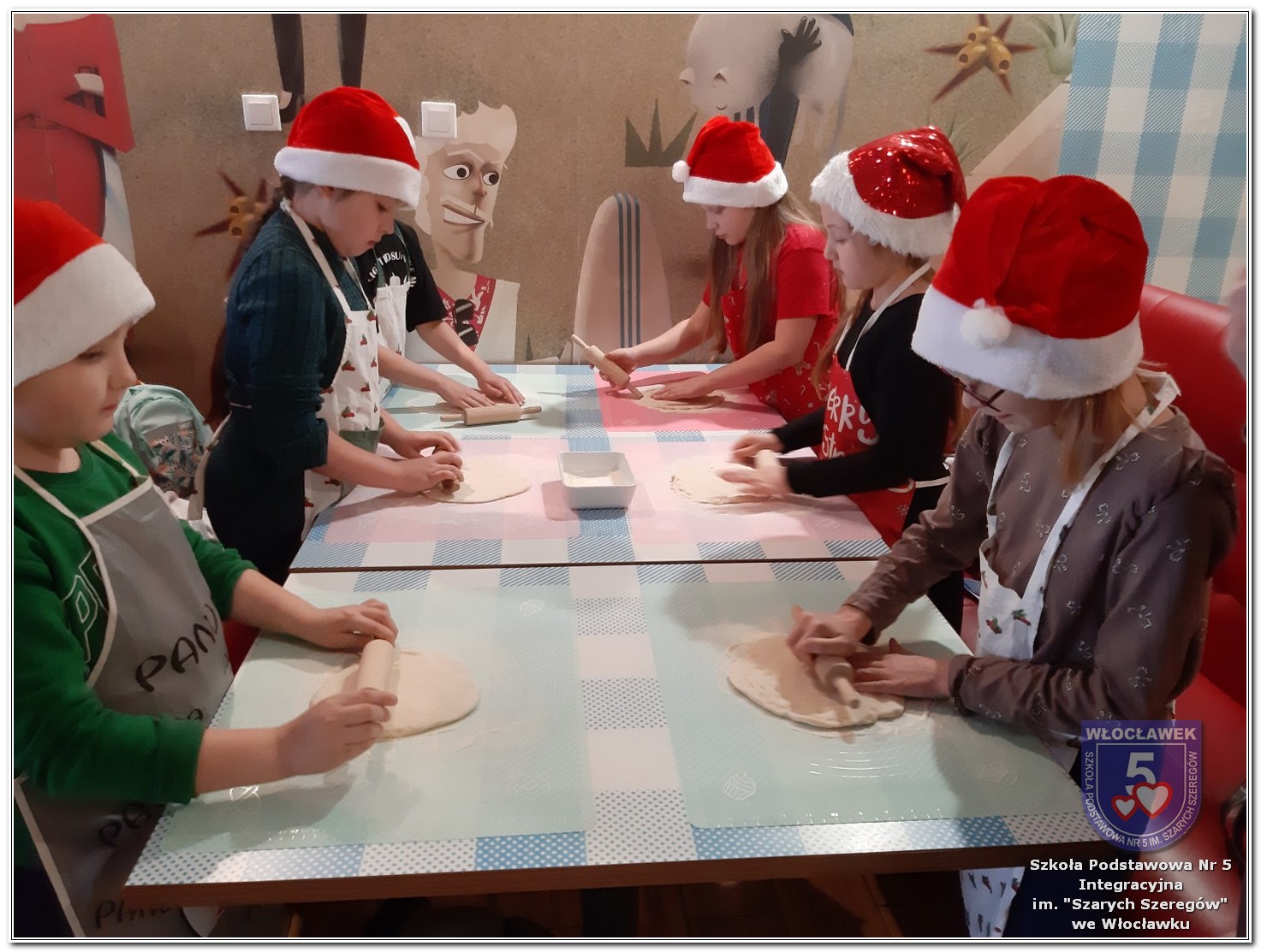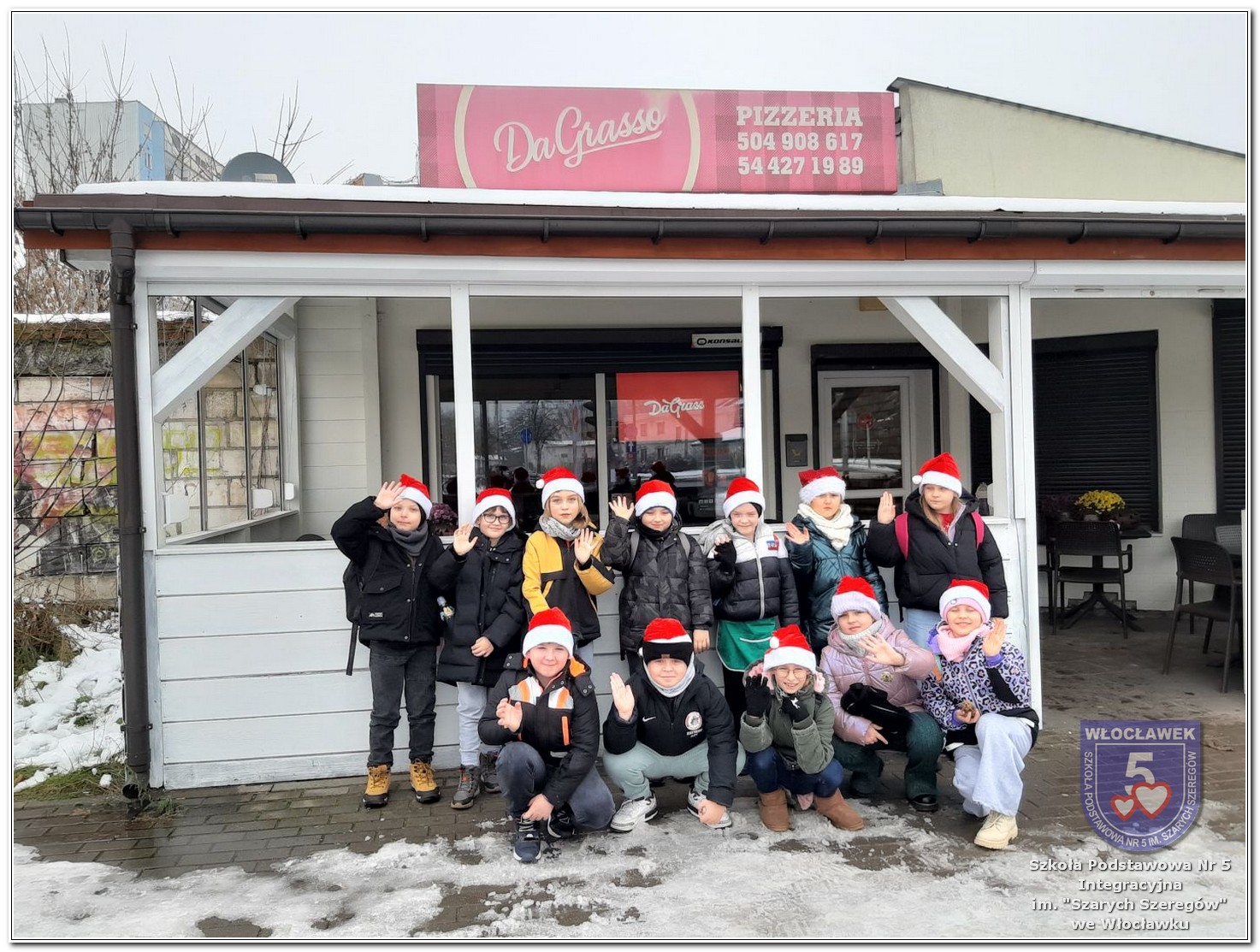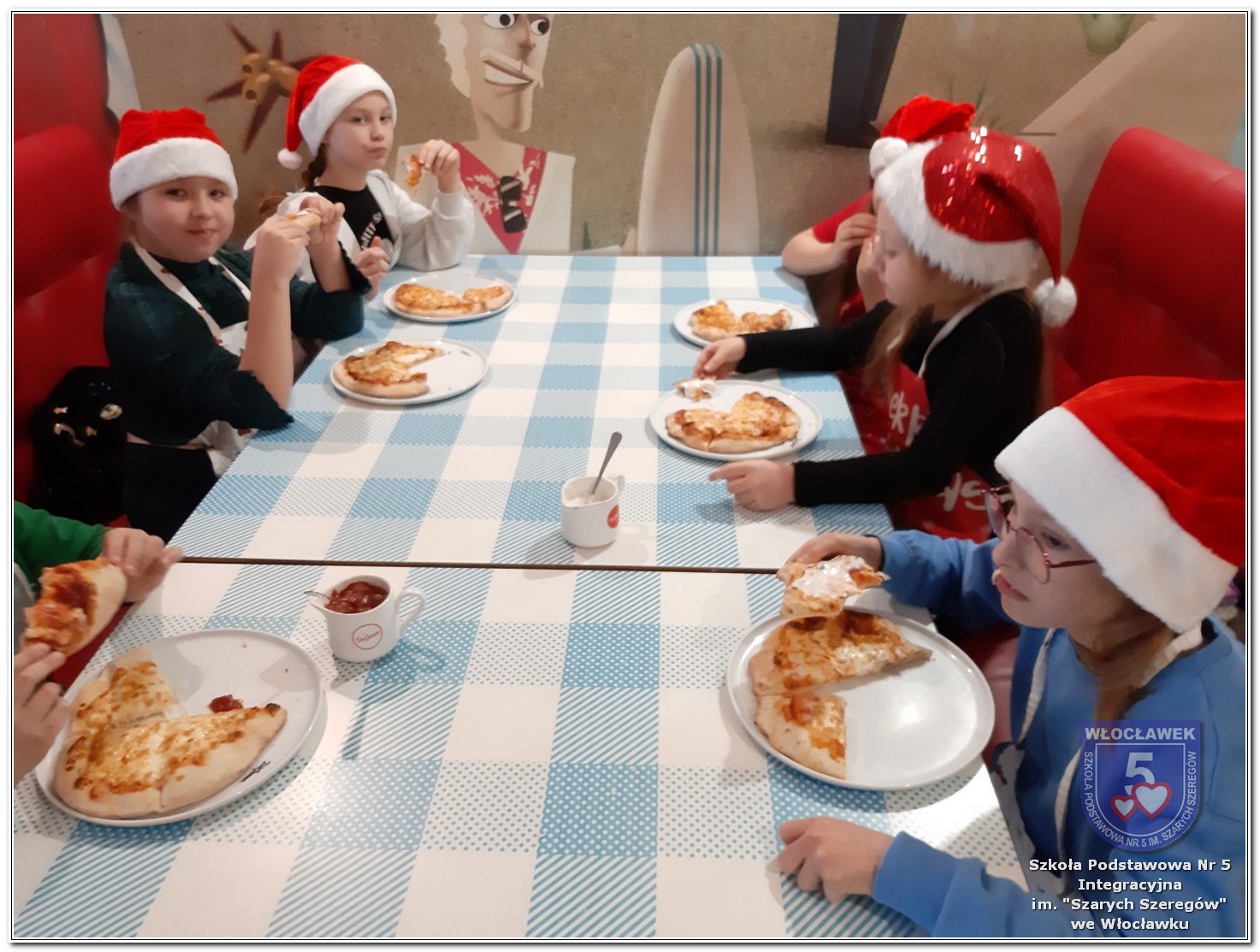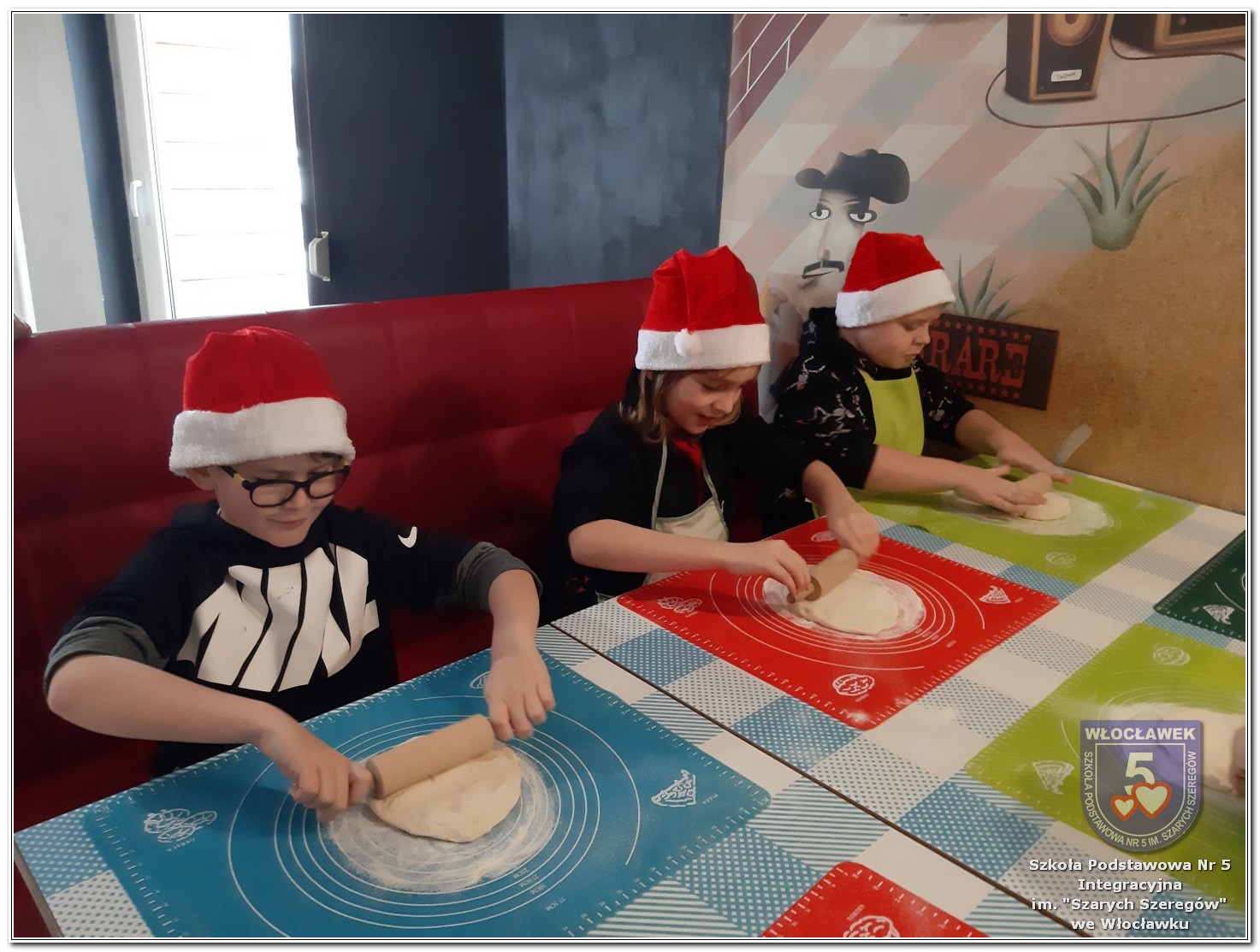 Tuż przed zbliżającymi się Mikołajkami, uczniowie klasy 2b pod opieką wychowawców udali się do pizzerii Da Grasso na warsztaty kulinarne. Dzięki uprzejmości rodziców Franka, którzy zorganizowali tę przedświąteczną niespodziankę, dzieci miały okazję poznać zawód kucharza, jak również same mogły sprawdzić się w tej roli przygotowując samodzielnie pizze pod czujnym okiem pracowników. Każdy z niecierpliwością oczekiwał aż jego pizza będzie gotowa, a następnie wszyscy ze smakiem degustowali małe kulinarne dzieła. Pizze były wyśmienite, humory dopisywały, a nowe doświadczenia z pewnością przydadzą się w przyszłości. Wszyscy zasłużyli na sprawność kuchcika, czego dowodem są piękne pamiątkowe dyplomy.