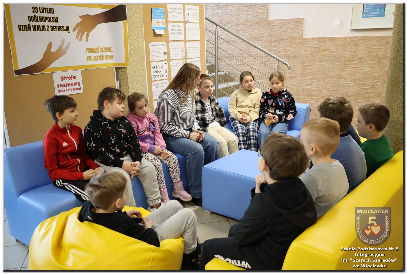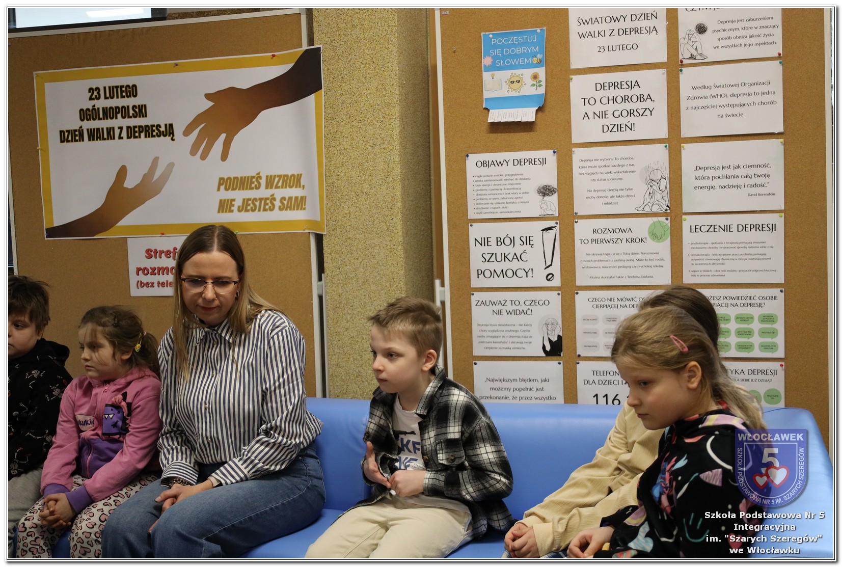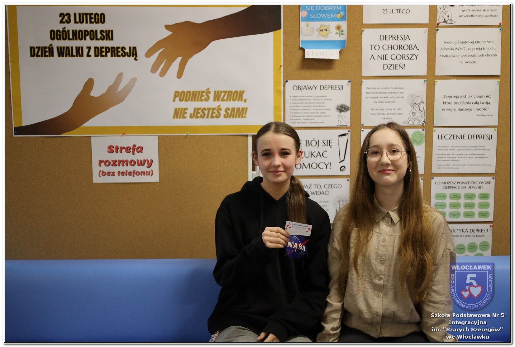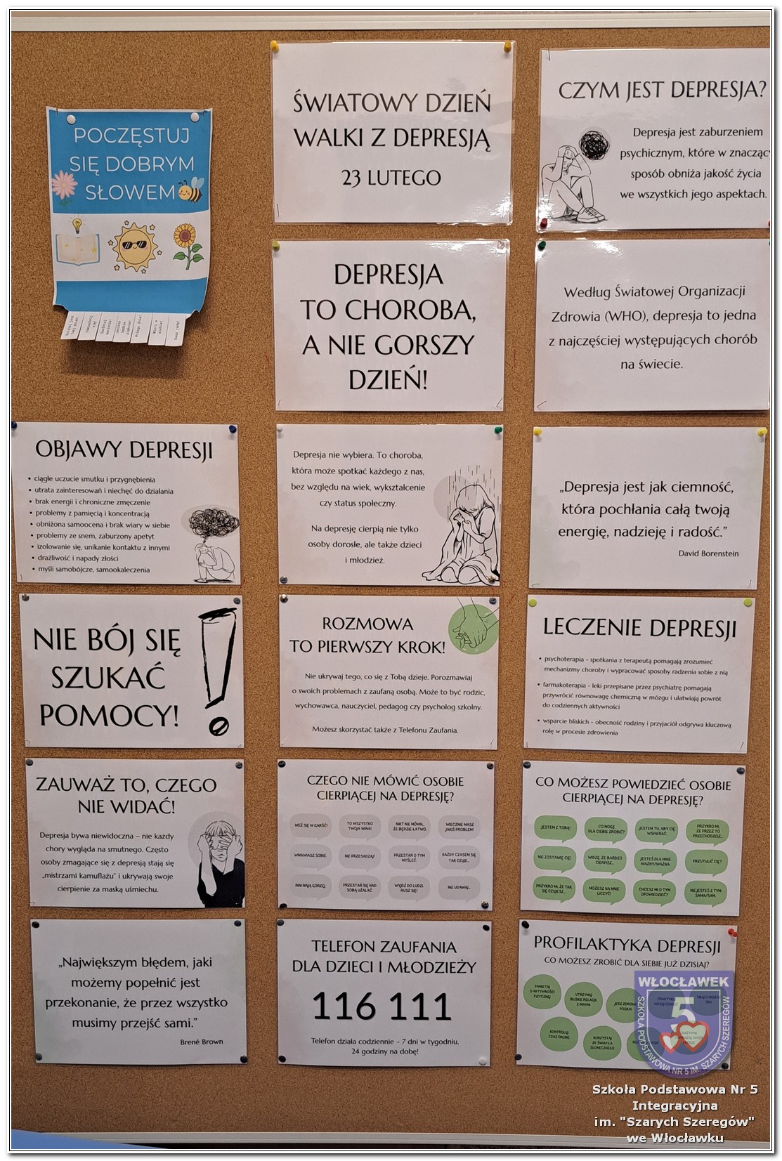 Uczniowie klas 4–8 otrzymali ulotki informacyjne przygotowane przez psychologa szkolnego, zawierające najważniejsze informacje dotyczące depresji i miejsc, w których można szukać wsparcia. Dodatkowo jedna z uczennic, Maja Szadkowska z klasy 8b, samodzielnie przygotowała dla swoich koleżanek i kolegów ulotkę z numerami telefonów, pod którymi można uzyskać pomoc. Wszystkie ulotki były dostępne w Strefie Wsparcia i Pomocy.
