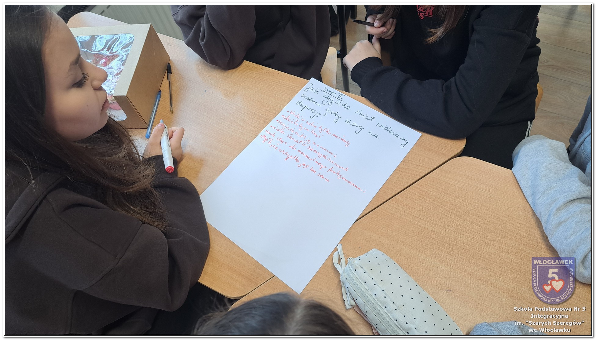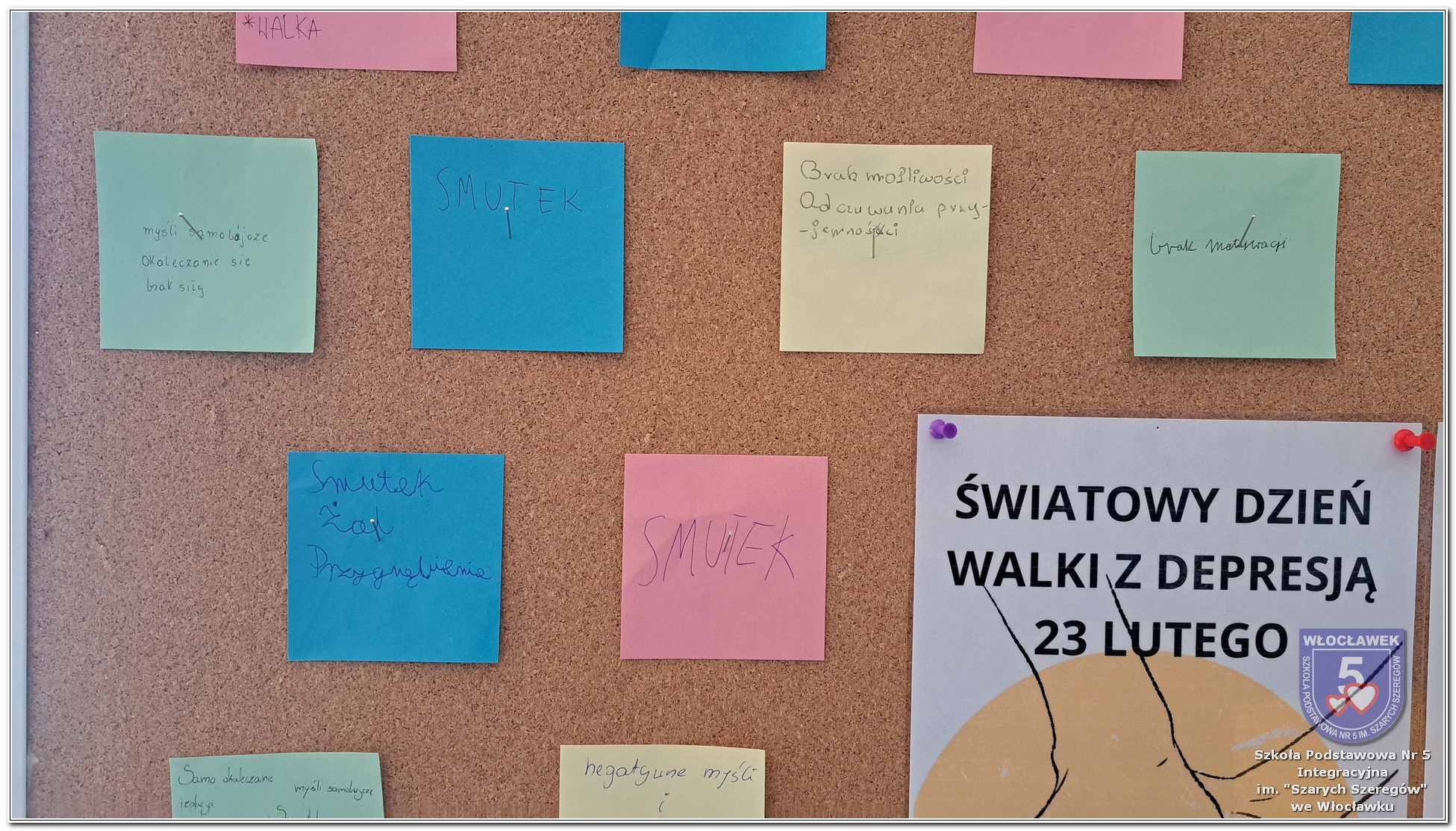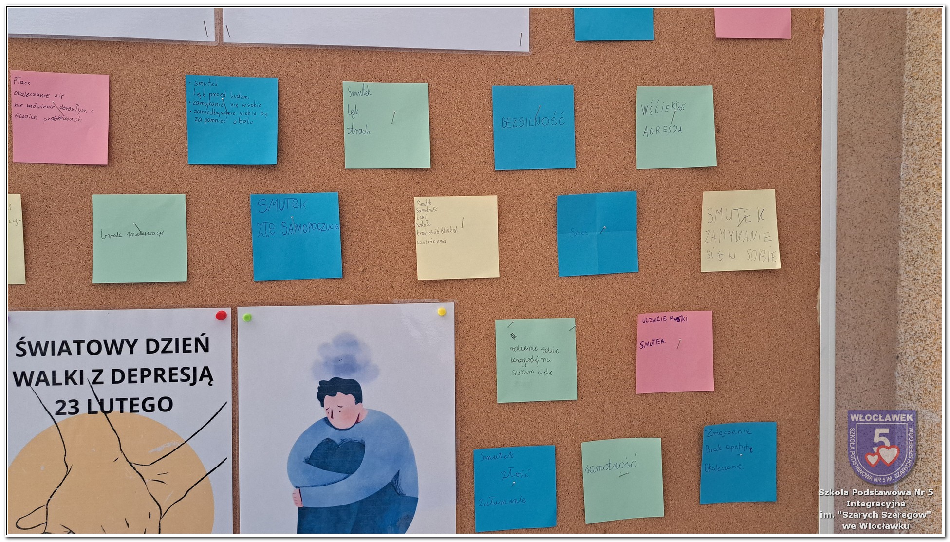 W klasach 6–8 psycholog szkolny przeprowadził warsztaty „Zrozumieć depresję”, podczas których uczniowie poznawali mechanizmy depresji, uczyli się rozpoznawać sygnały ostrzegawcze oraz dowiadywali się, jak reagować, gdy ktoś potrzebuje pomocy. W ramach zajęć uczniowie współtworzyli tablicę skojarzeń, zapisując swoje refleksje związane ze słowem „depresja”. Stała się ona punktem wyjścia do rozmów o emocjach i sposobach radzenia sobie z trudnościami. Dodatkowo odbyły się rozmowy z wybranymi klasami 1–3, dostosowane do wieku uczniów i skupione na emocjach, radzeniu sobie z trudnymi sytuacjami oraz budowaniu poczucia bezpieczeństwa.