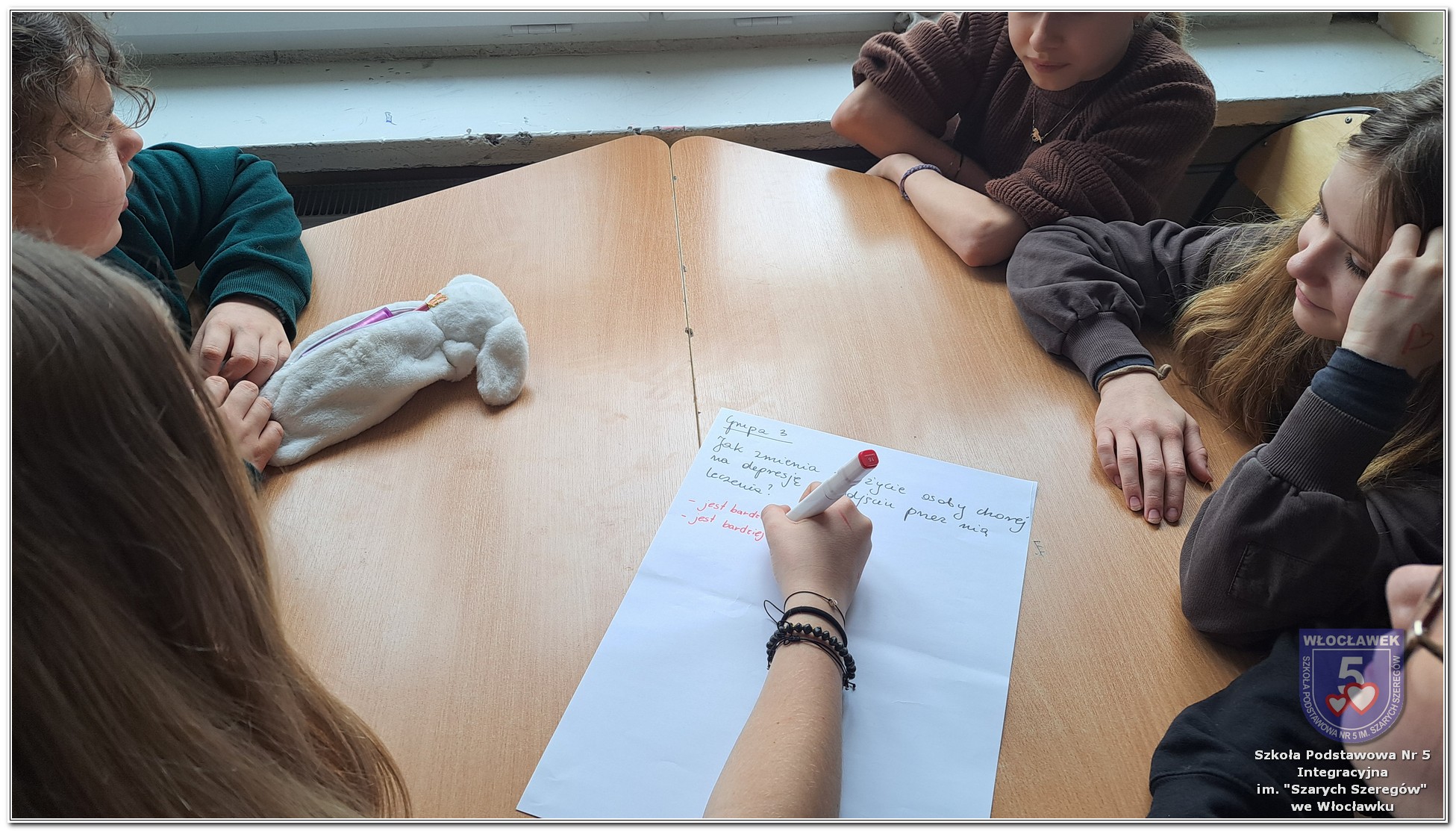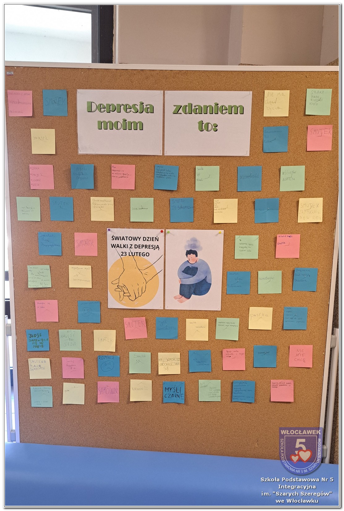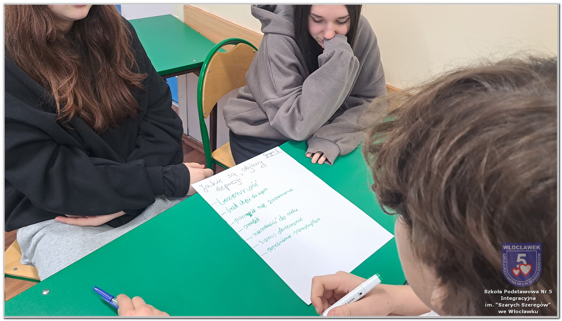 W klasach 6–8 psycholog szkolny przeprowadził warsztaty „Zrozumieć depresję”, podczas których uczniowie poznawali mechanizmy depresji, uczyli się rozpoznawać sygnały ostrzegawcze oraz dowiadywali się, jak reagować, gdy ktoś potrzebuje pomocy. W ramach zajęć uczniowie współtworzyli tablicę skojarzeń, zapisując swoje refleksje związane ze słowem „depresja”. Stała się ona punktem wyjścia do rozmów o emocjach i sposobach radzenia sobie z trudnościami. Dodatkowo odbyły się rozmowy z wybranymi klasami 1–3, dostosowane do wieku uczniów i skupione na emocjach, radzeniu sobie z trudnymi sytuacjami oraz budowaniu poczucia bezpieczeństwa.