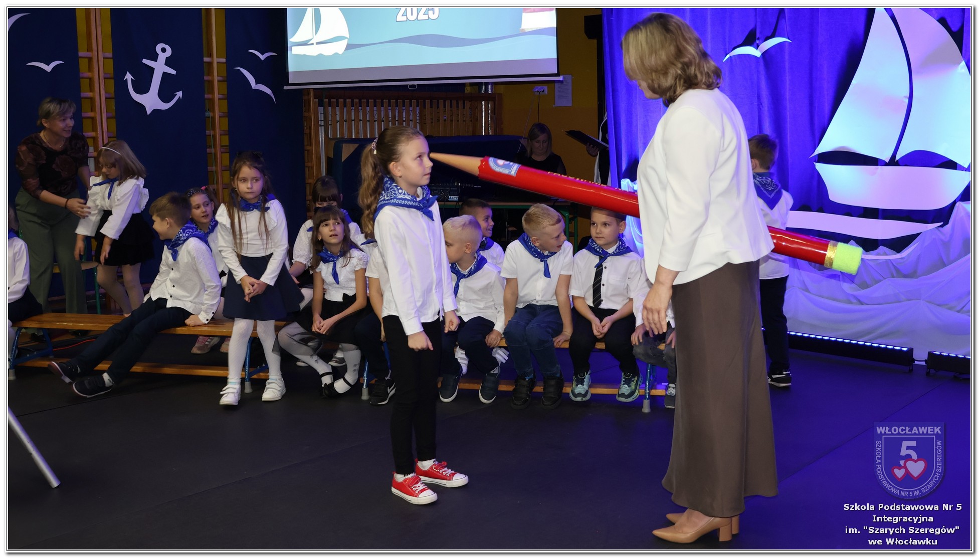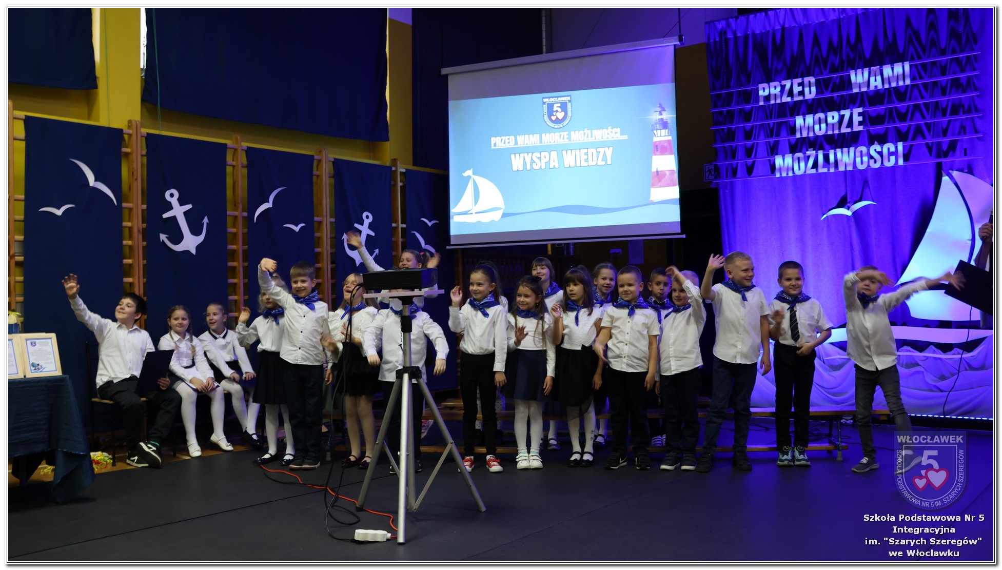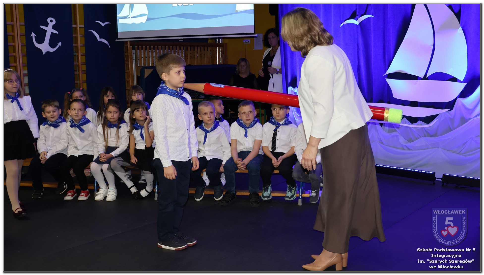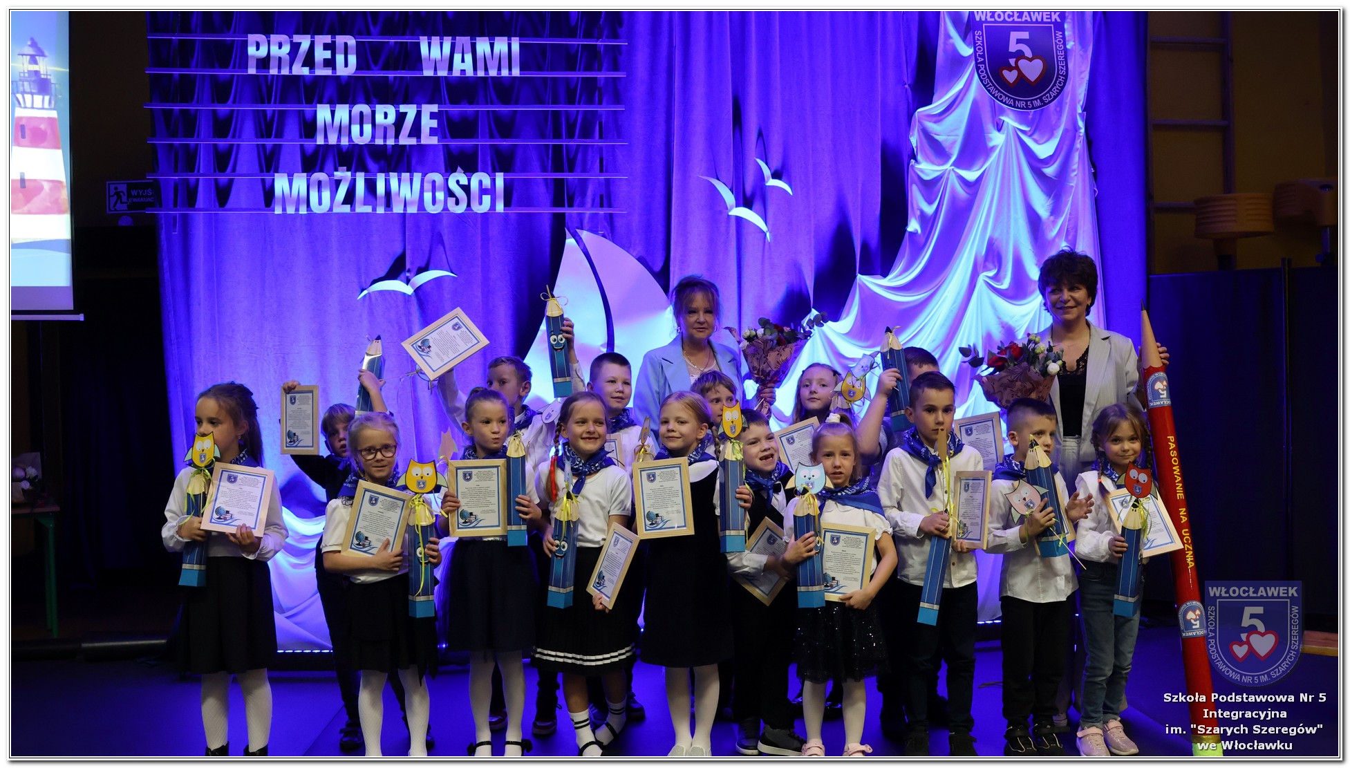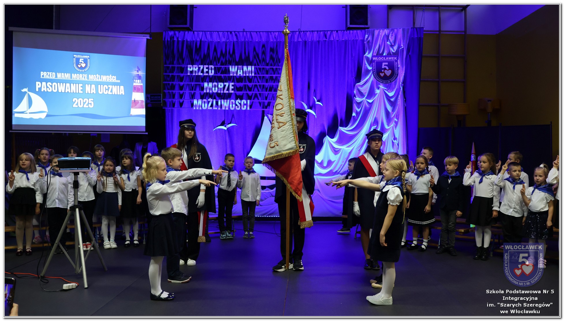 W czwartek, 23 października odbyła się uroczystość Pasowania Uczniów Klas 1. Pod hasłem „Przed Wami morze możliwości” pierwszoklasiści wyruszyli w symboliczną podróż ku wiedzy, przyjaźni i odkrywaniu świata. W obecności nauczycieli, rodziców i starszych kolegów, dzieci z klas pierwszych złożyły ślubowanie, a następnie zostały pasowane symbolicznym ołówkiem. Każdy uczeń otrzymał upominek przygotowany przez Radę Rodziców – drobną pamiątkę, która będzie przypominać o tym wyjątkowym dniu i pierwszym kroku w szkolną przygodę. Uroczystość miała spokojny, ciepły charakter. Nie zabrakło występów artystycznych, wspólnych gestów i słów, które podkreślały wagę tego dnia. Całość dopełniały dekoracje i motywy morskie – jako metafora otwartych horyzontów i dziecięcej ciekawości.