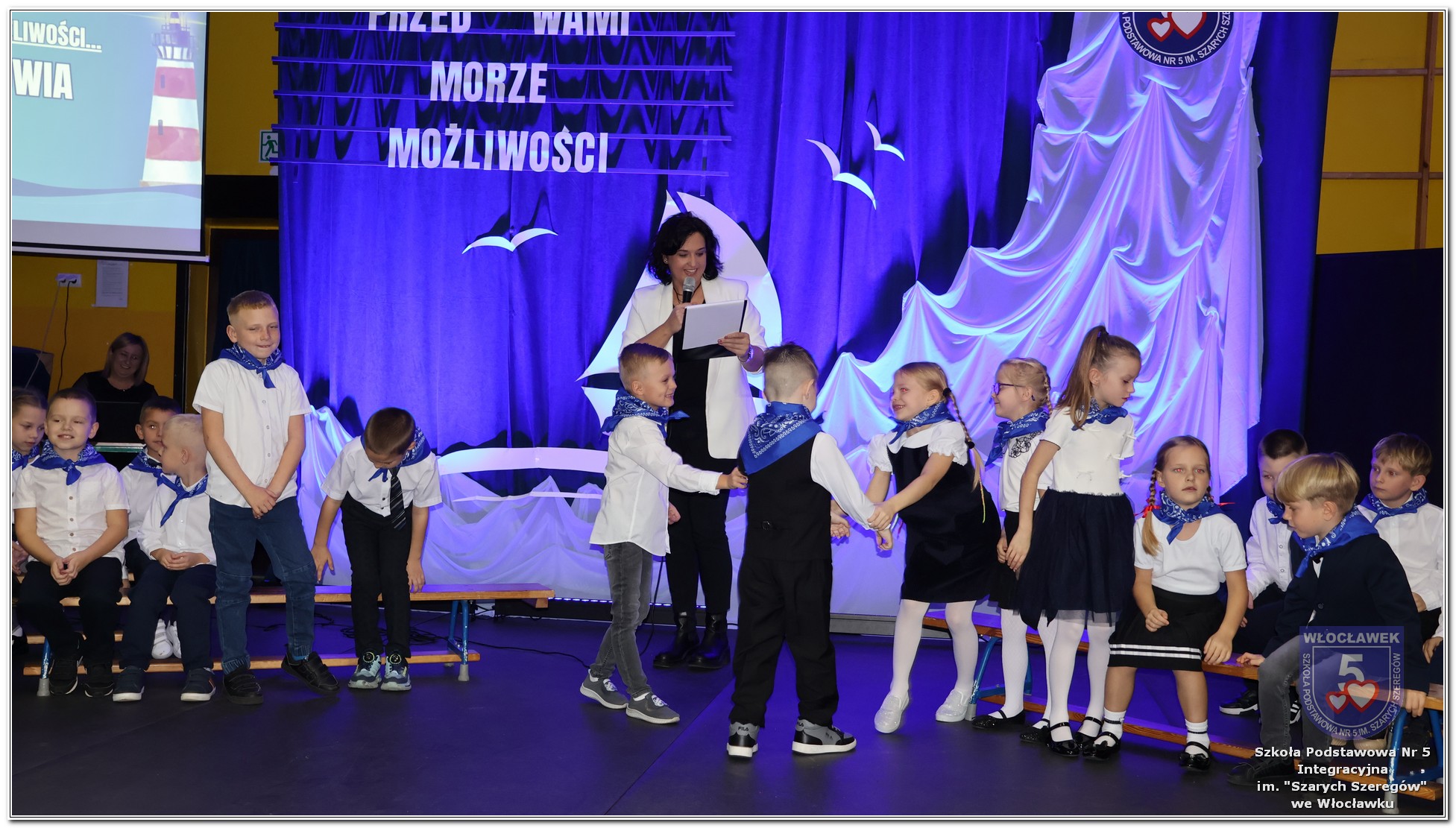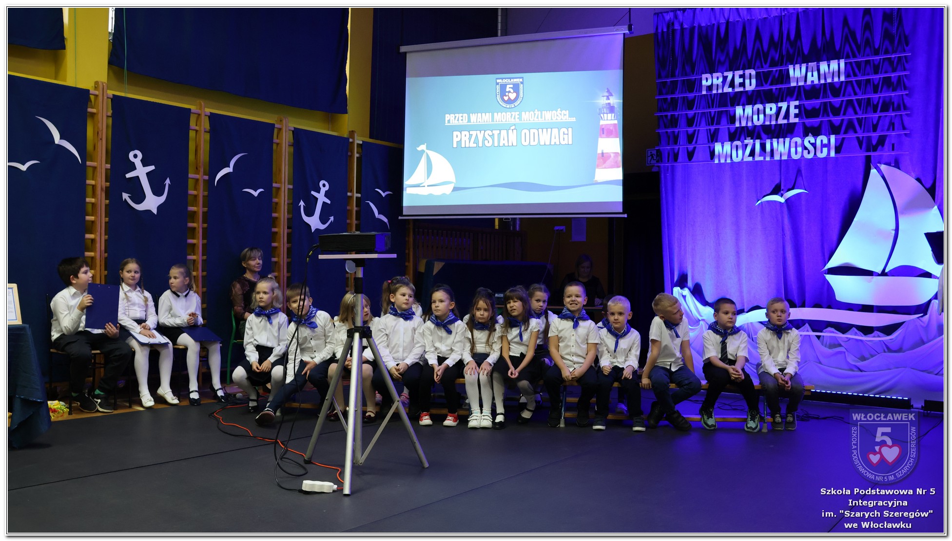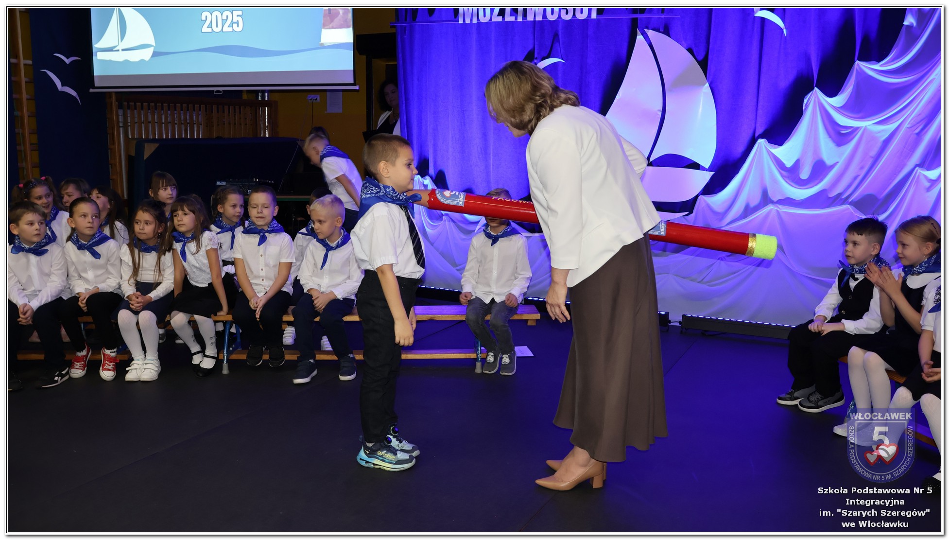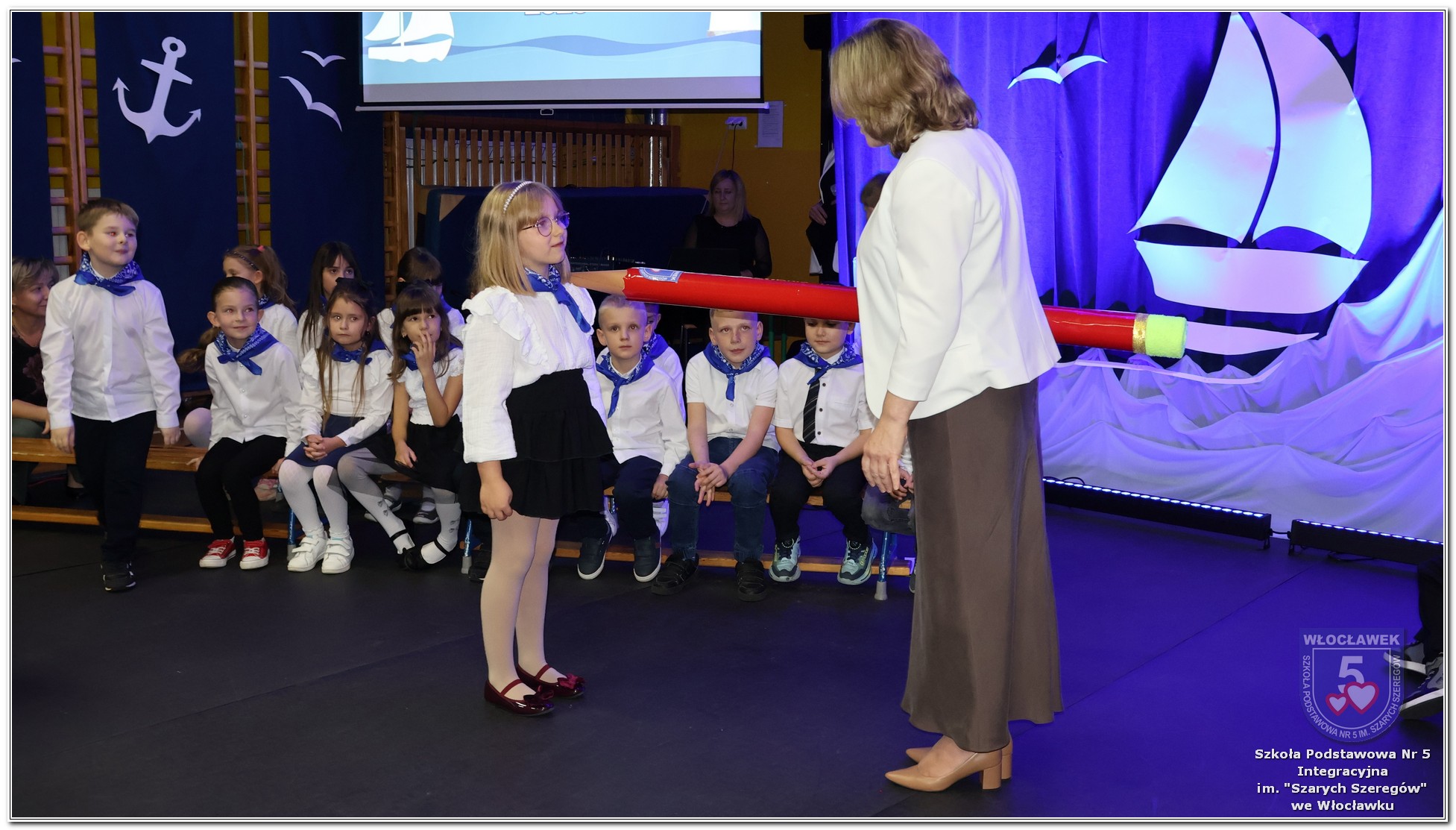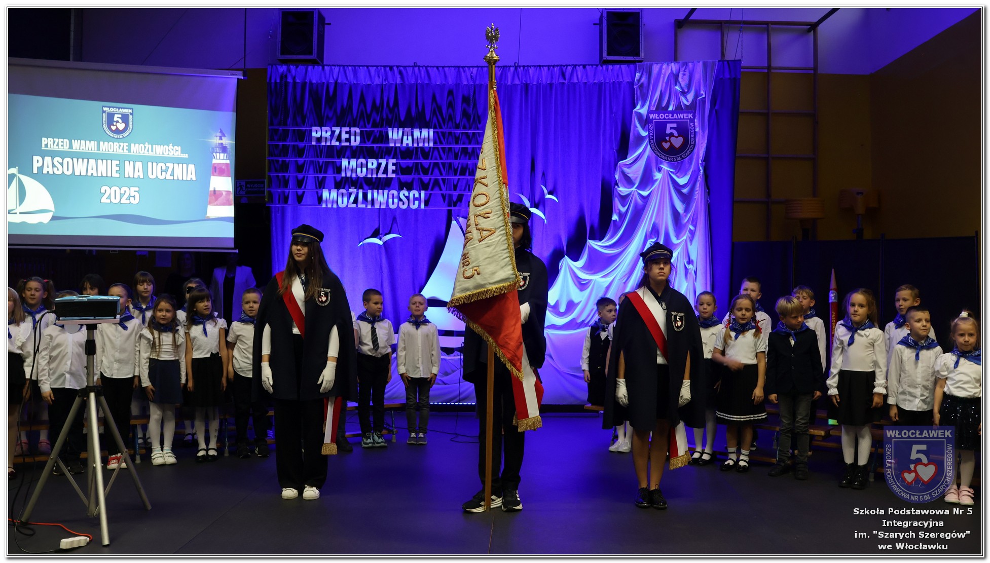 W czwartek, 23 października odbyła się uroczystość Pasowania Uczniów Klas 1. Pod hasłem „Przed Wami morze możliwości” pierwszoklasiści wyruszyli w symboliczną podróż ku wiedzy, przyjaźni i odkrywaniu świata. W obecności nauczycieli, rodziców i starszych kolegów, dzieci z klas pierwszych złożyły ślubowanie, a następnie zostały pasowane symbolicznym ołówkiem. Każdy uczeń otrzymał upominek przygotowany przez Radę Rodziców – drobną pamiątkę, która będzie przypominać o tym wyjątkowym dniu i pierwszym kroku w szkolną przygodę. Uroczystość miała spokojny, ciepły charakter. Nie zabrakło występów artystycznych, wspólnych gestów i słów, które podkreślały wagę tego dnia. Całość dopełniały dekoracje i motywy morskie – jako metafora otwartych horyzontów i dziecięcej ciekawości.