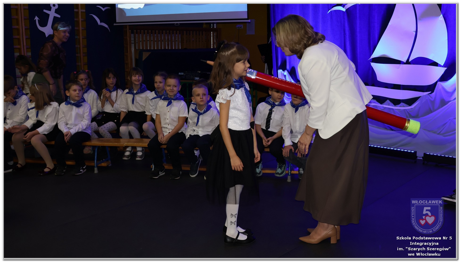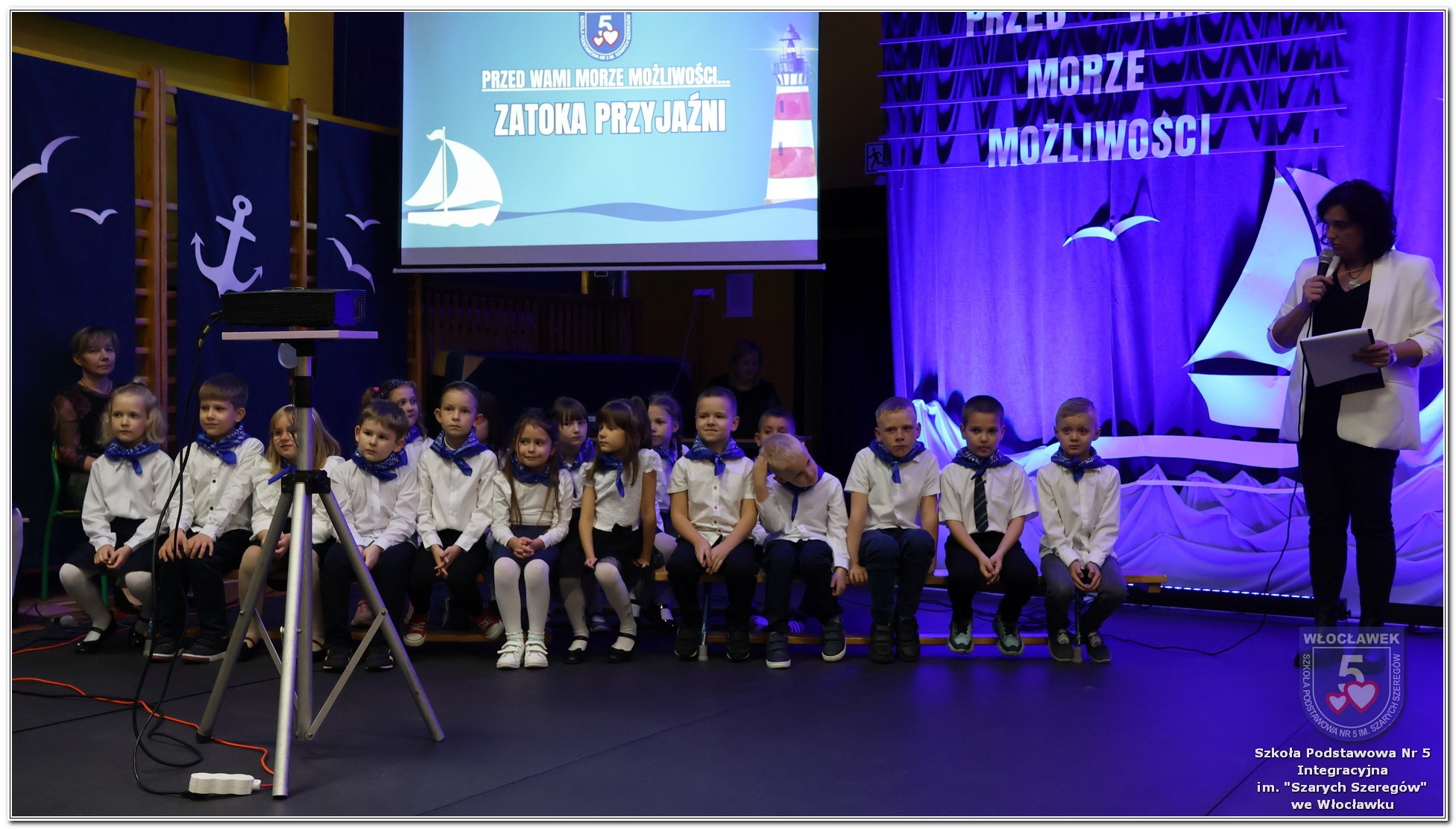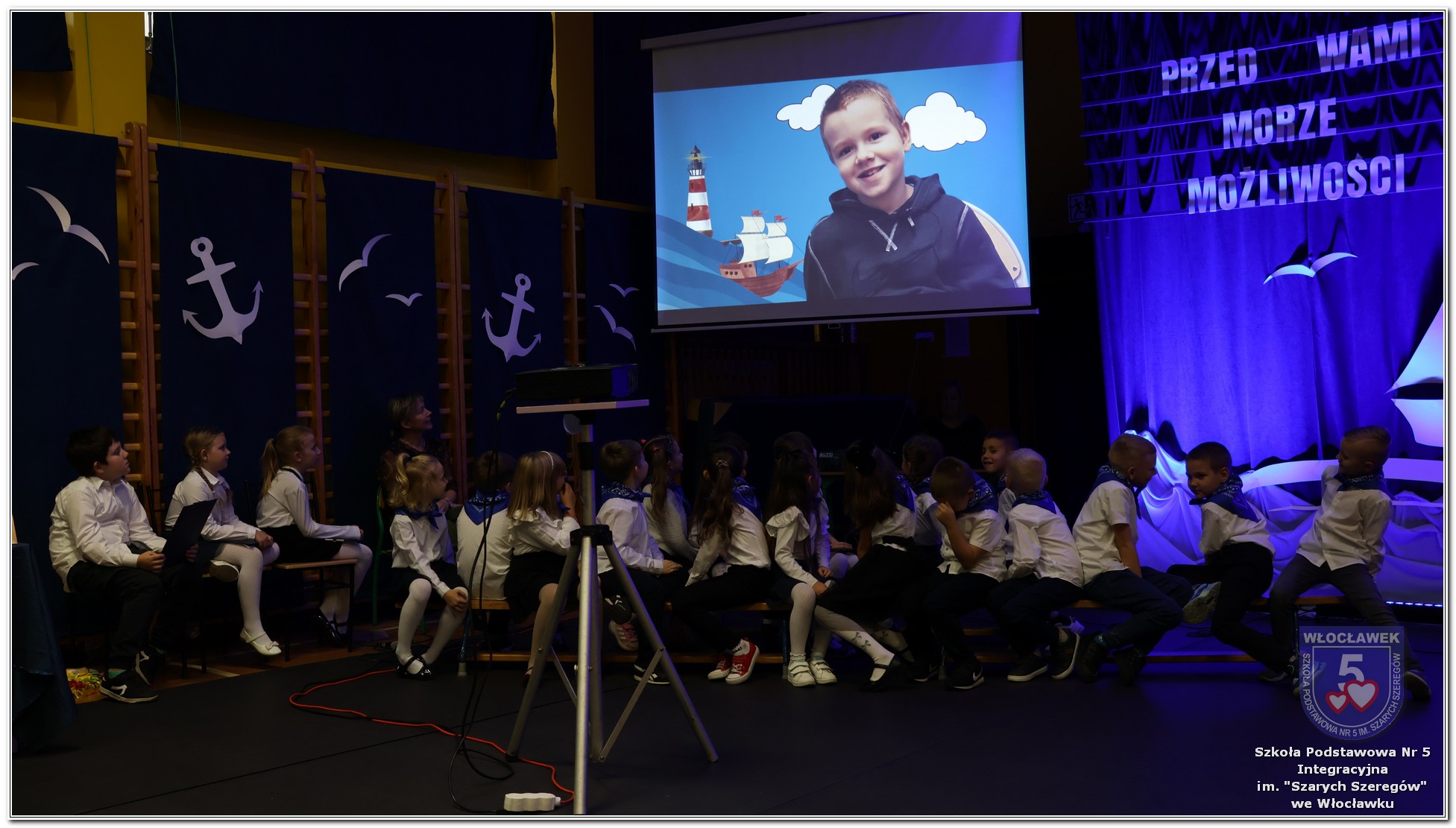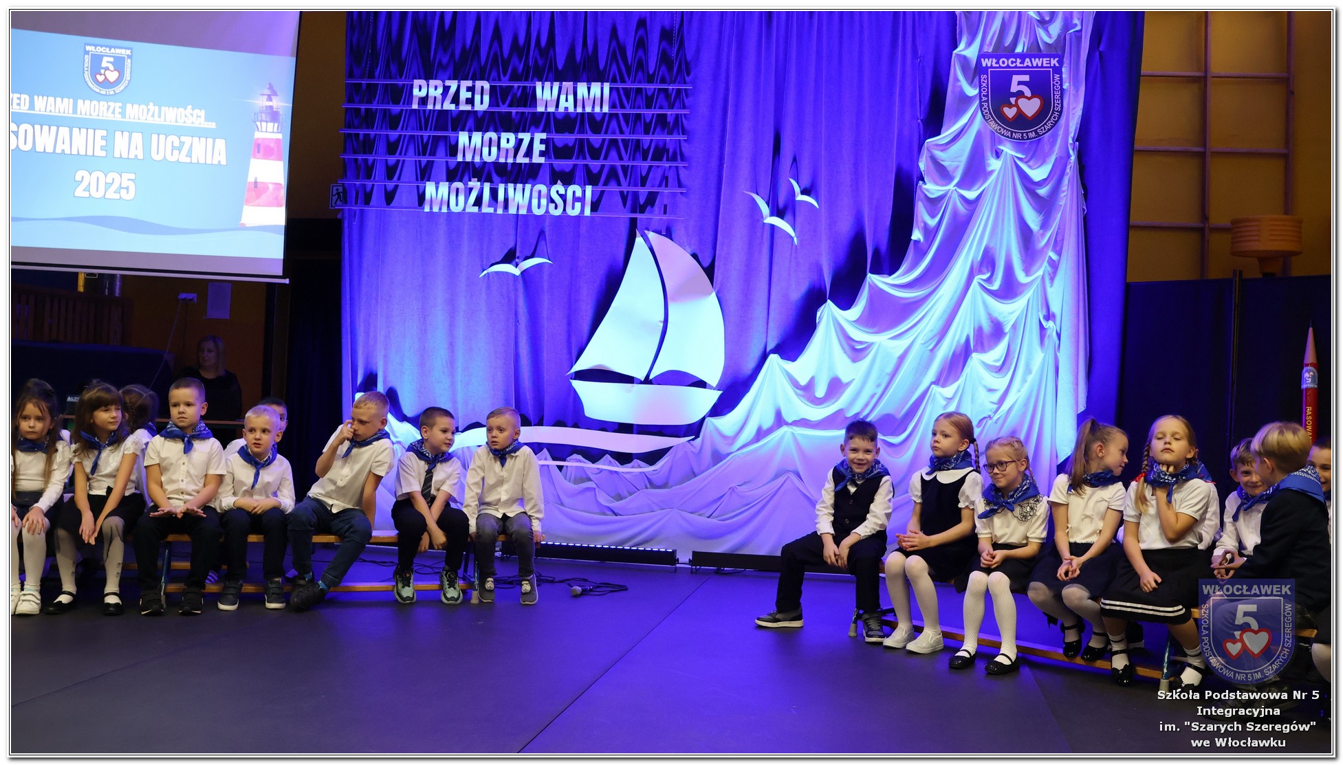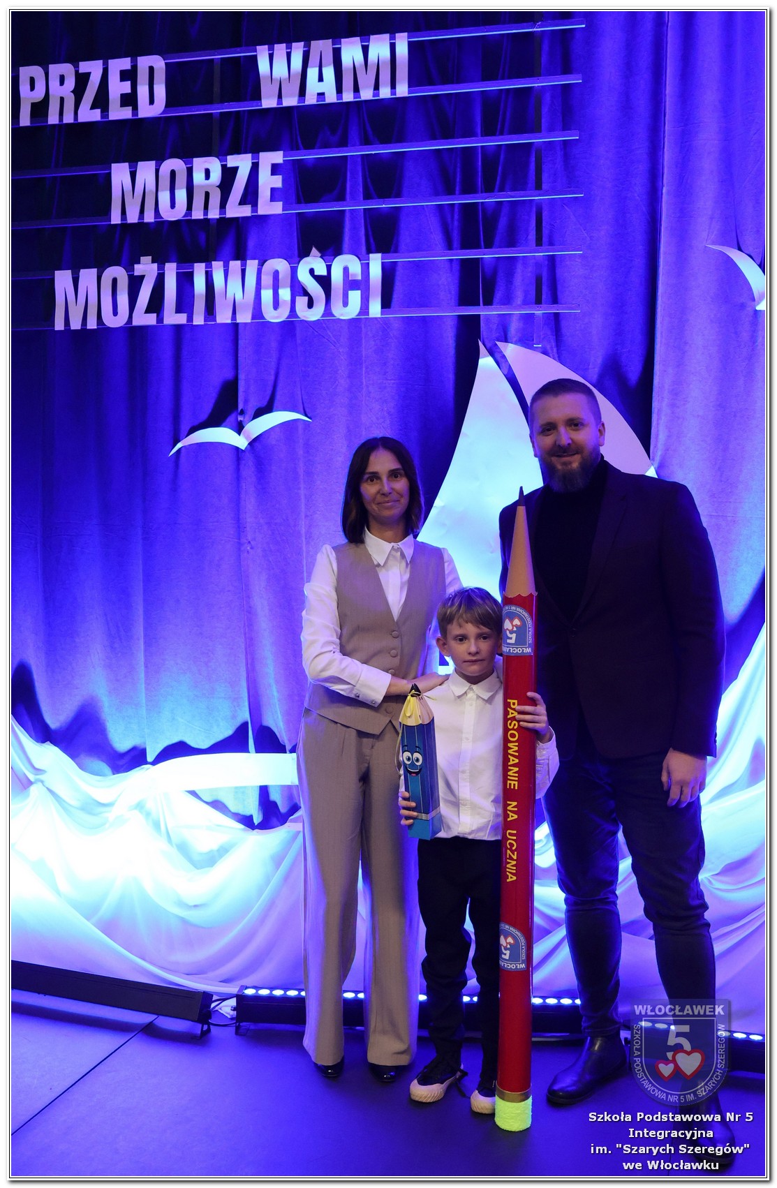 W czwartek, 23 października odbyła się uroczystość Pasowania Uczniów Klas 1. Pod hasłem „Przed Wami morze możliwości” pierwszoklasiści wyruszyli w symboliczną podróż ku wiedzy, przyjaźni i odkrywaniu świata. W obecności nauczycieli, rodziców i starszych kolegów, dzieci z klas pierwszych złożyły ślubowanie, a następnie zostały pasowane symbolicznym ołówkiem. Każdy uczeń otrzymał upominek przygotowany przez Radę Rodziców – drobną pamiątkę, która będzie przypominać o tym wyjątkowym dniu i pierwszym kroku w szkolną przygodę. Uroczystość miała spokojny, ciepły charakter. Nie zabrakło występów artystycznych, wspólnych gestów i słów, które podkreślały wagę tego dnia. Całość dopełniały dekoracje i motywy morskie – jako metafora otwartych horyzontów i dziecięcej ciekawości.