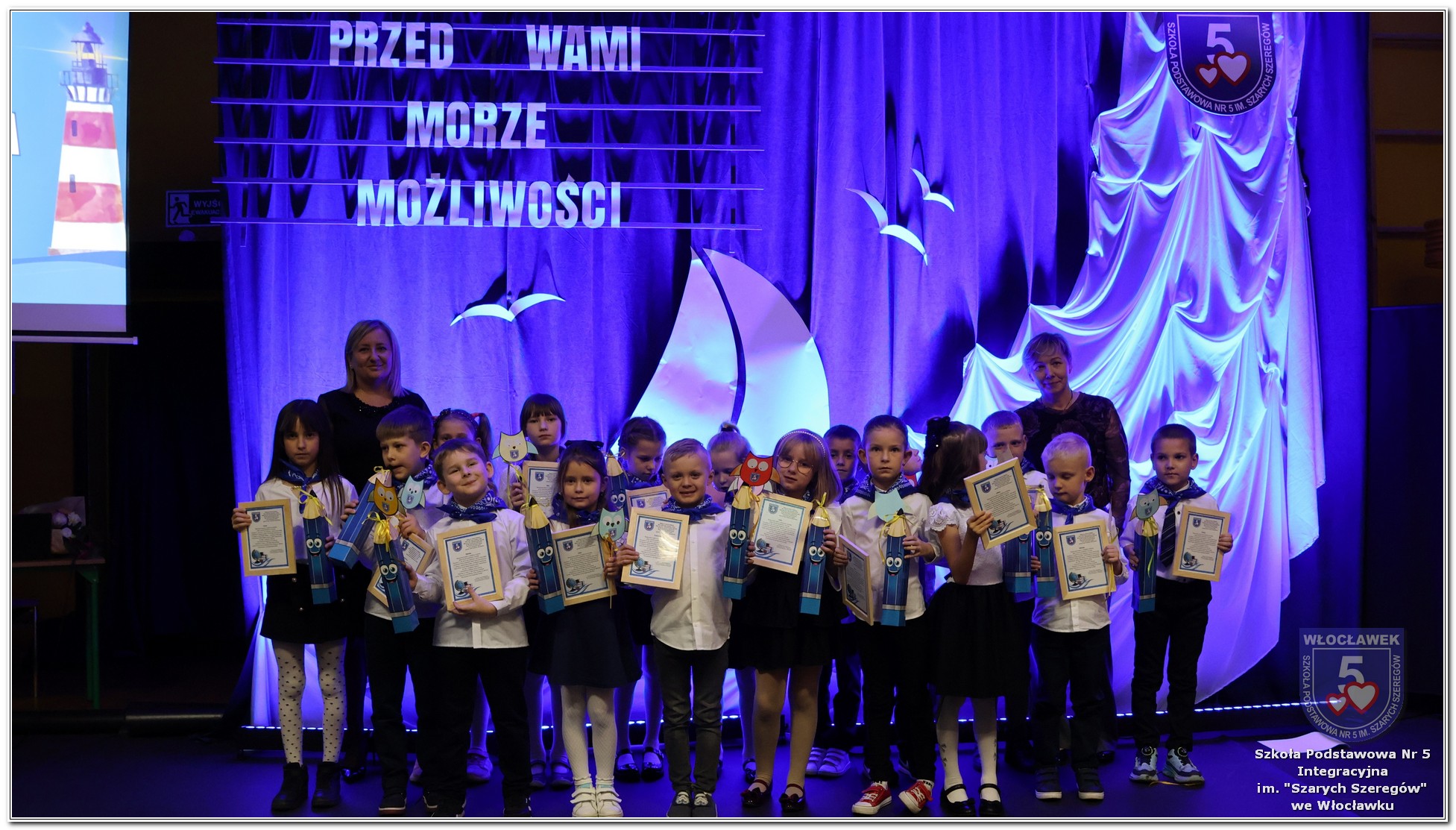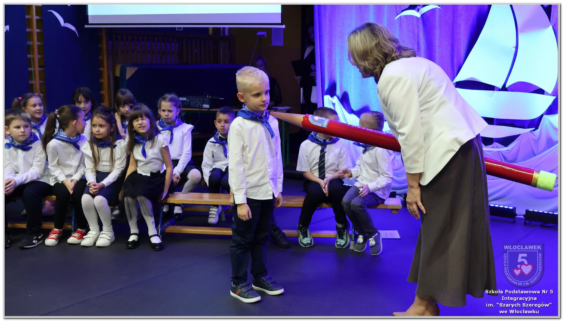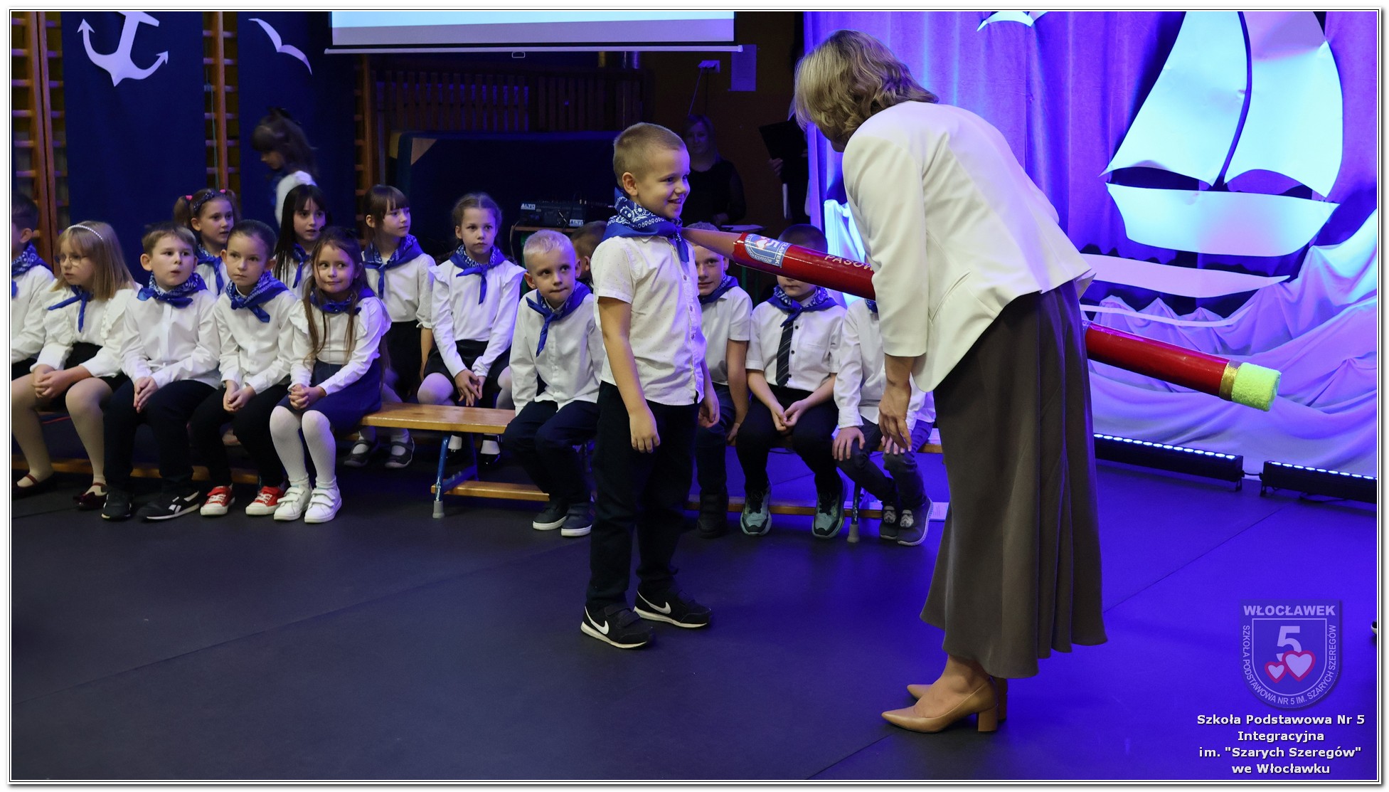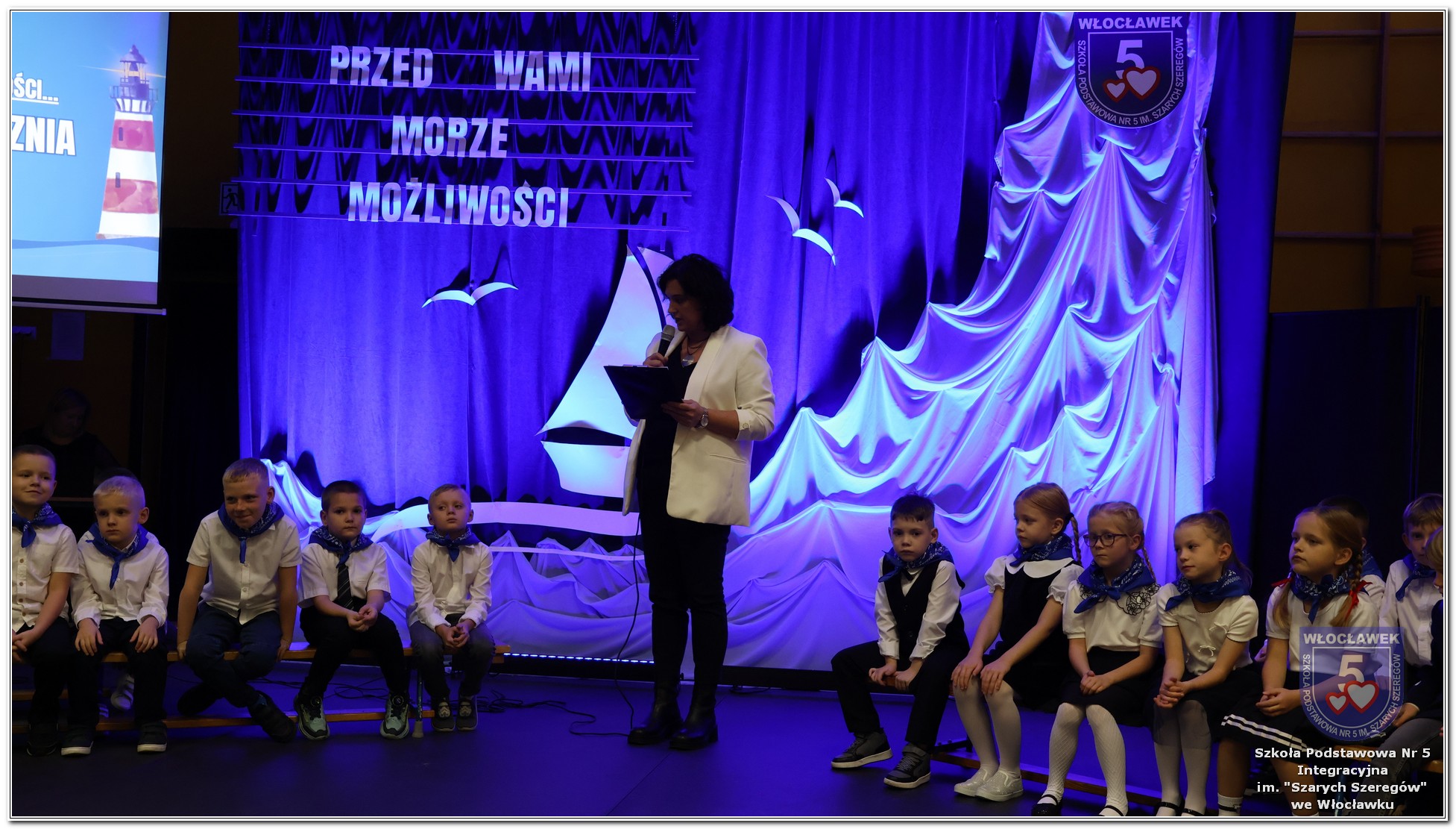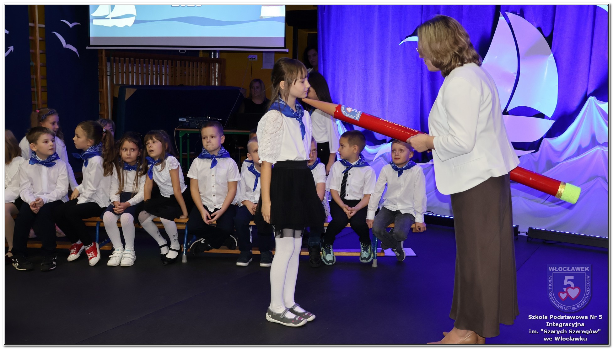 W czwartek, 23 października odbyła się uroczystość Pasowania Uczniów Klas 1. Pod hasłem „Przed Wami morze możliwości” pierwszoklasiści wyruszyli w symboliczną podróż ku wiedzy, przyjaźni i odkrywaniu świata. W obecności nauczycieli, rodziców i starszych kolegów, dzieci z klas pierwszych złożyły ślubowanie, a następnie zostały pasowane symbolicznym ołówkiem. Każdy uczeń otrzymał upominek przygotowany przez Radę Rodziców – drobną pamiątkę, która będzie przypominać o tym wyjątkowym dniu i pierwszym kroku w szkolną przygodę. Uroczystość miała spokojny, ciepły charakter. Nie zabrakło występów artystycznych, wspólnych gestów i słów, które podkreślały wagę tego dnia. Całość dopełniały dekoracje i motywy morskie – jako metafora otwartych horyzontów i dziecięcej ciekawości.