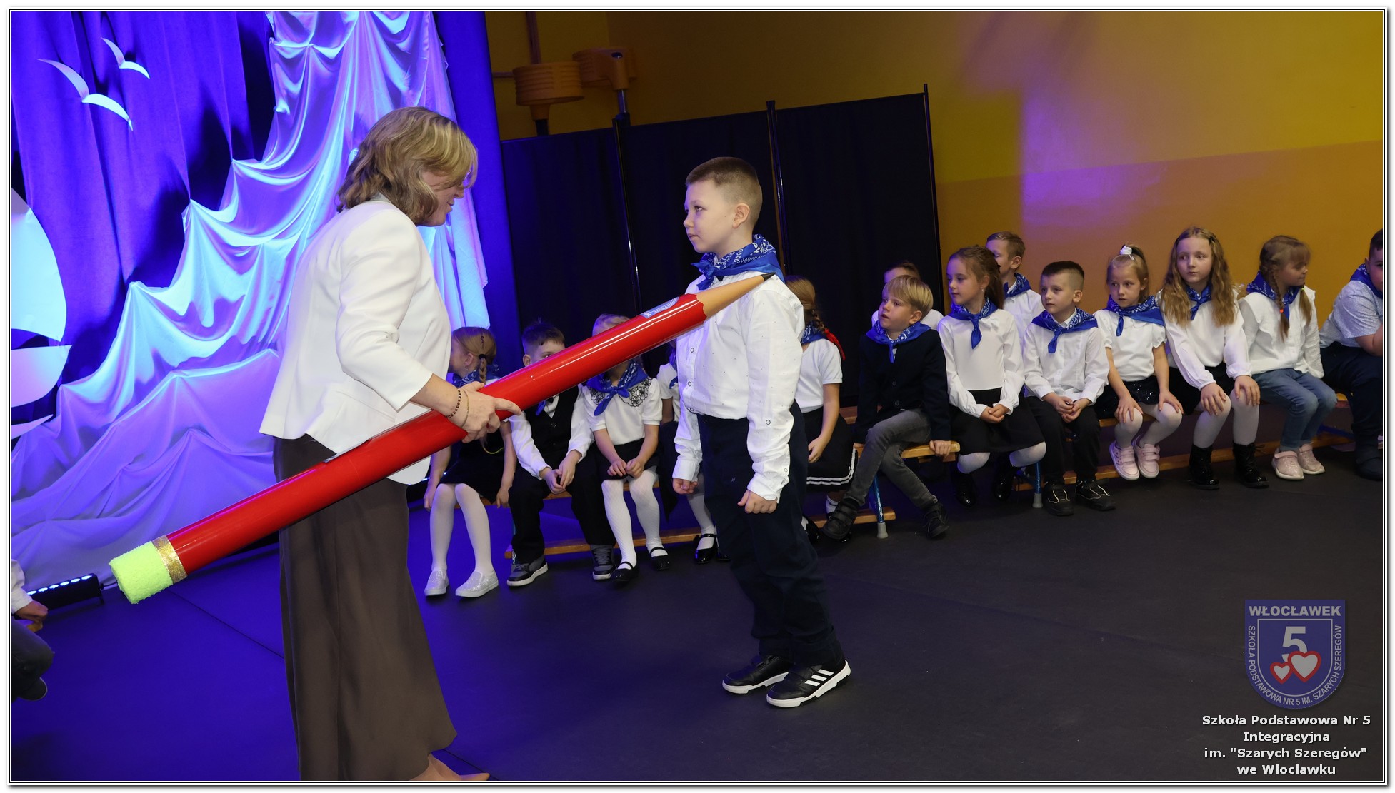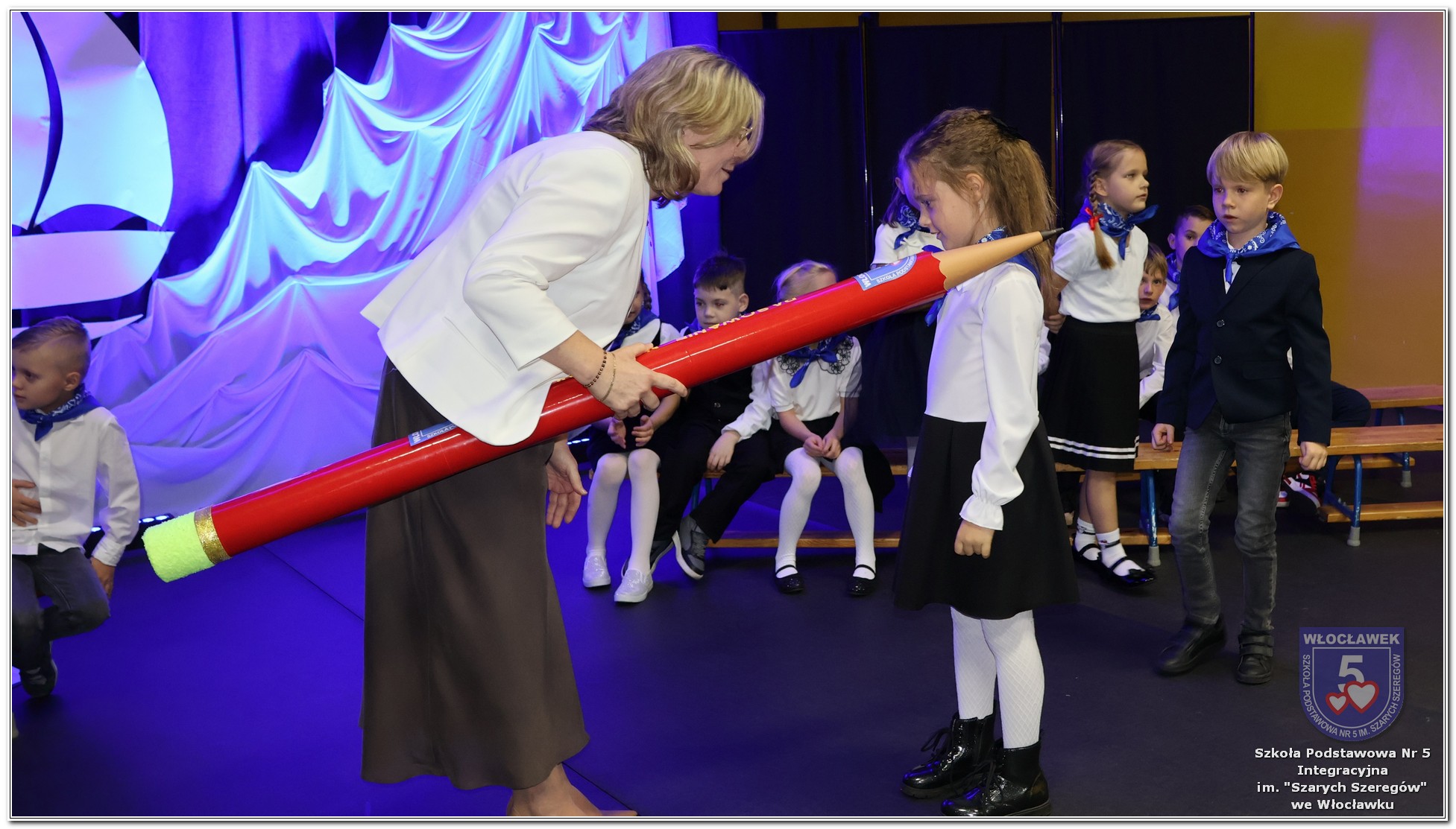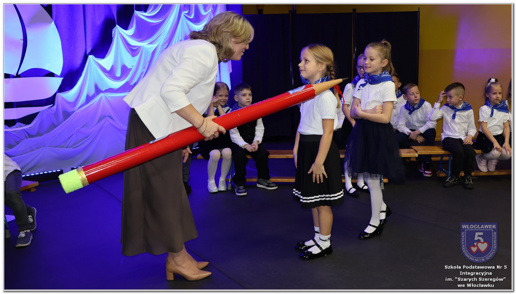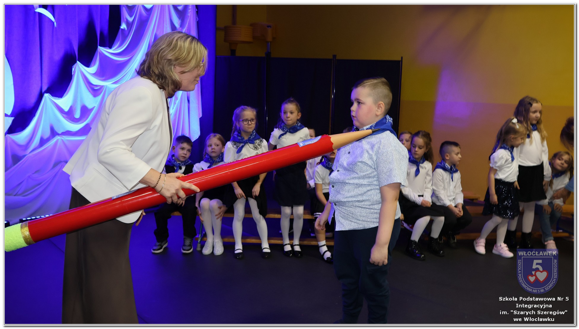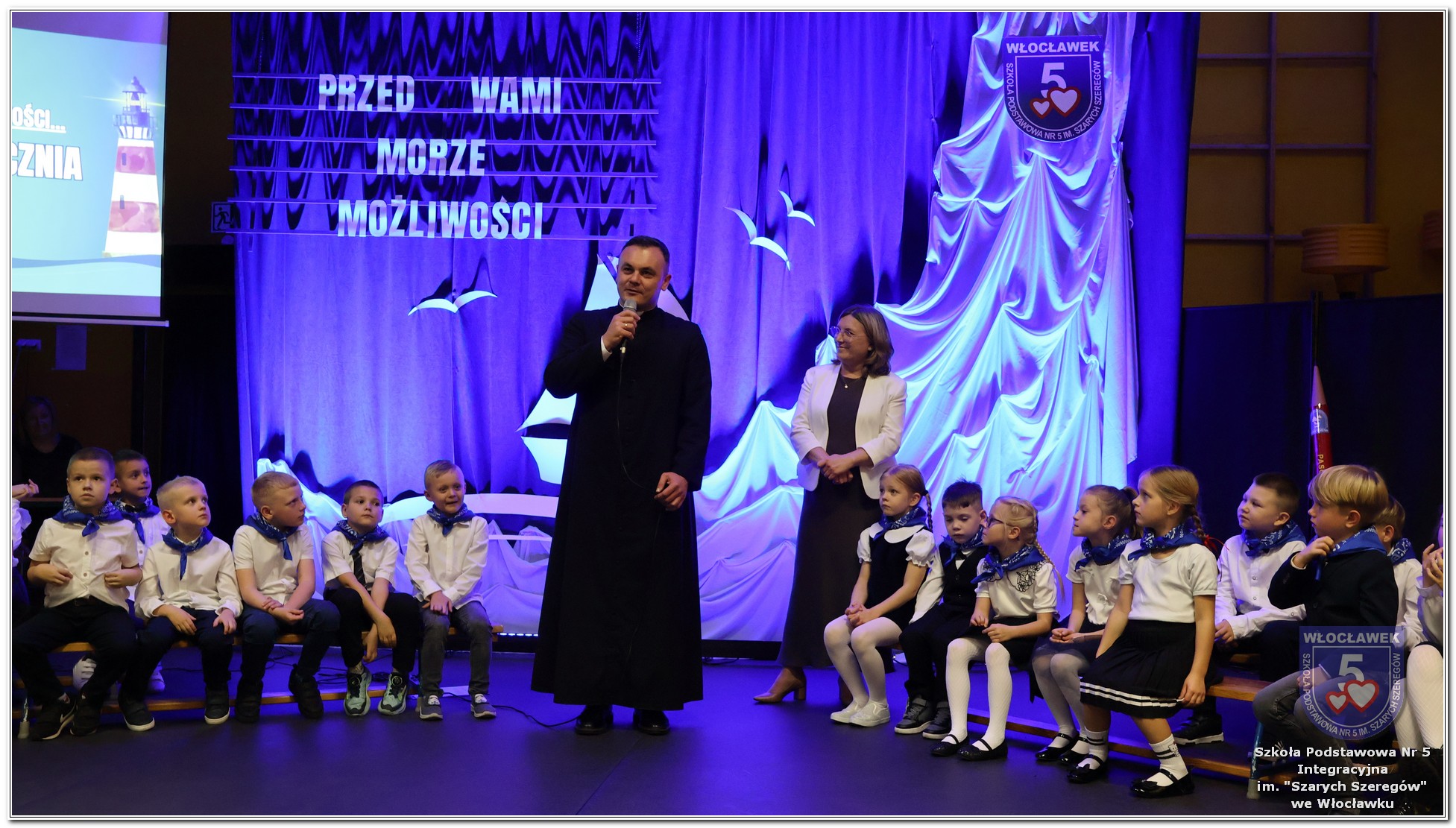 W czwartek, 23 października odbyła się uroczystość Pasowania Uczniów Klas 1. Pod hasłem „Przed Wami morze możliwości” pierwszoklasiści wyruszyli w symboliczną podróż ku wiedzy, przyjaźni i odkrywaniu świata. W obecności nauczycieli, rodziców i starszych kolegów, dzieci z klas pierwszych złożyły ślubowanie, a następnie zostały pasowane symbolicznym ołówkiem. Każdy uczeń otrzymał upominek przygotowany przez Radę Rodziców – drobną pamiątkę, która będzie przypominać o tym wyjątkowym dniu i pierwszym kroku w szkolną przygodę. Uroczystość miała spokojny, ciepły charakter. Nie zabrakło występów artystycznych, wspólnych gestów i słów, które podkreślały wagę tego dnia. Całość dopełniały dekoracje i motywy morskie – jako metafora otwartych horyzontów i dziecięcej ciekawości.