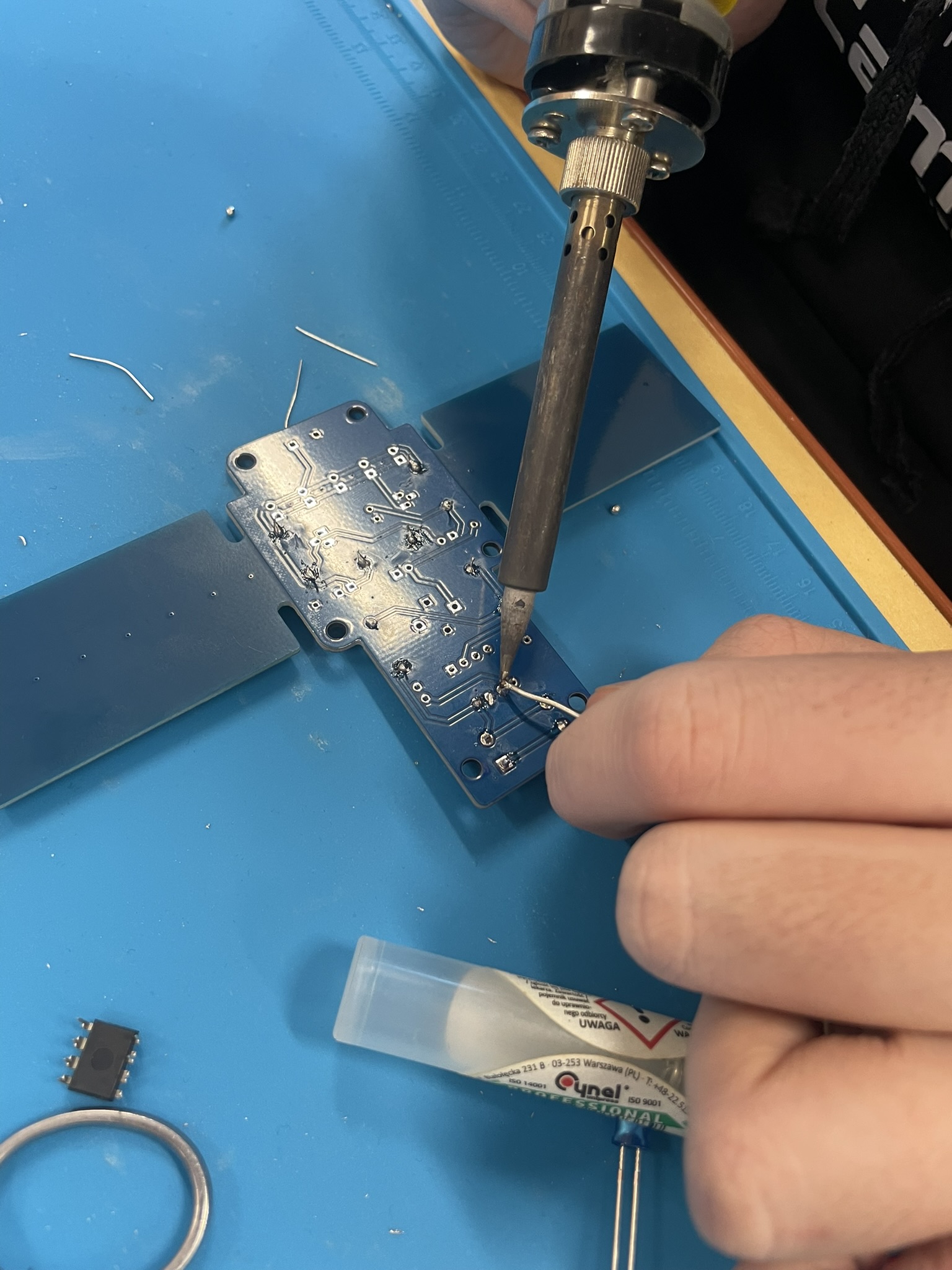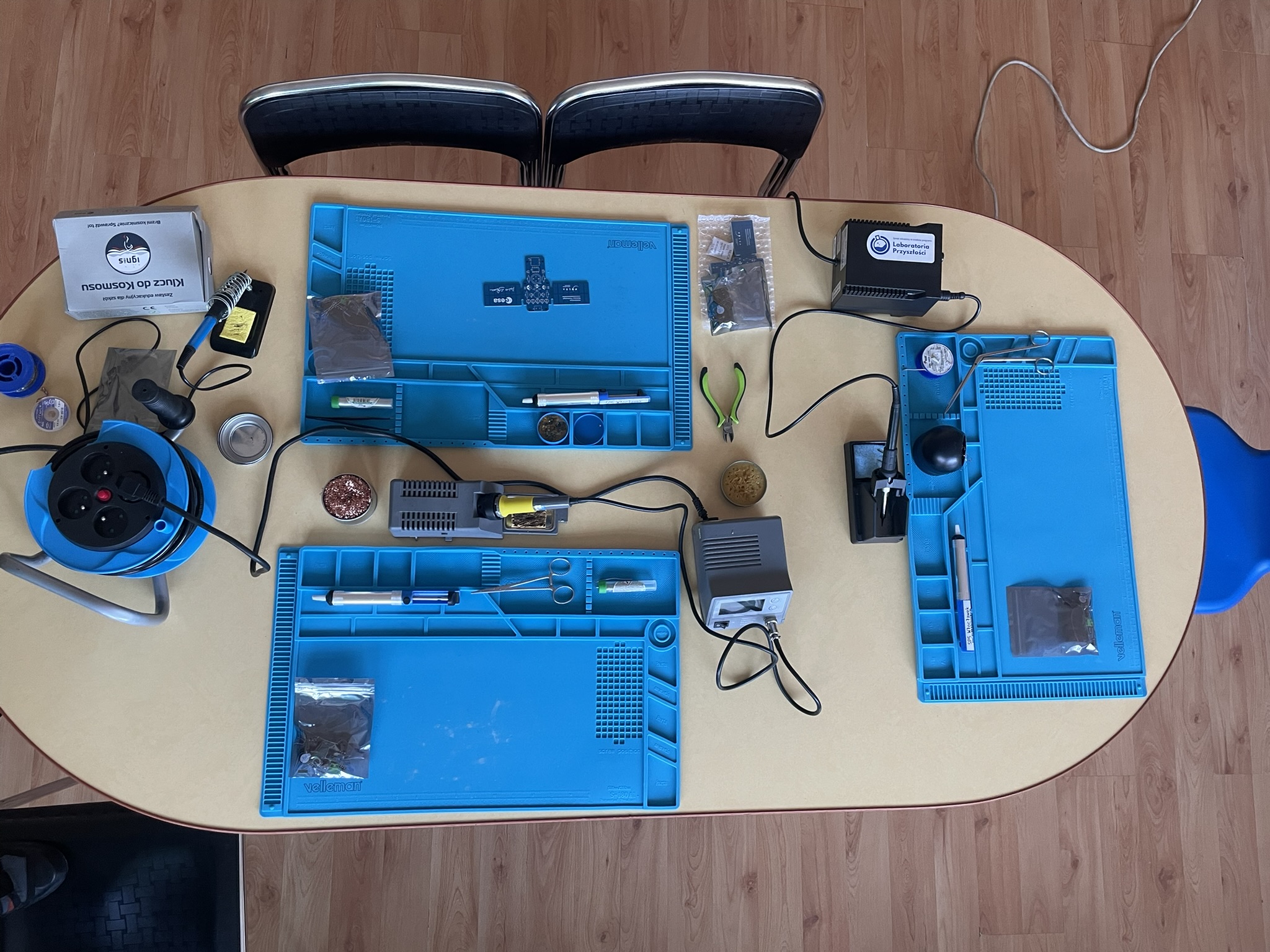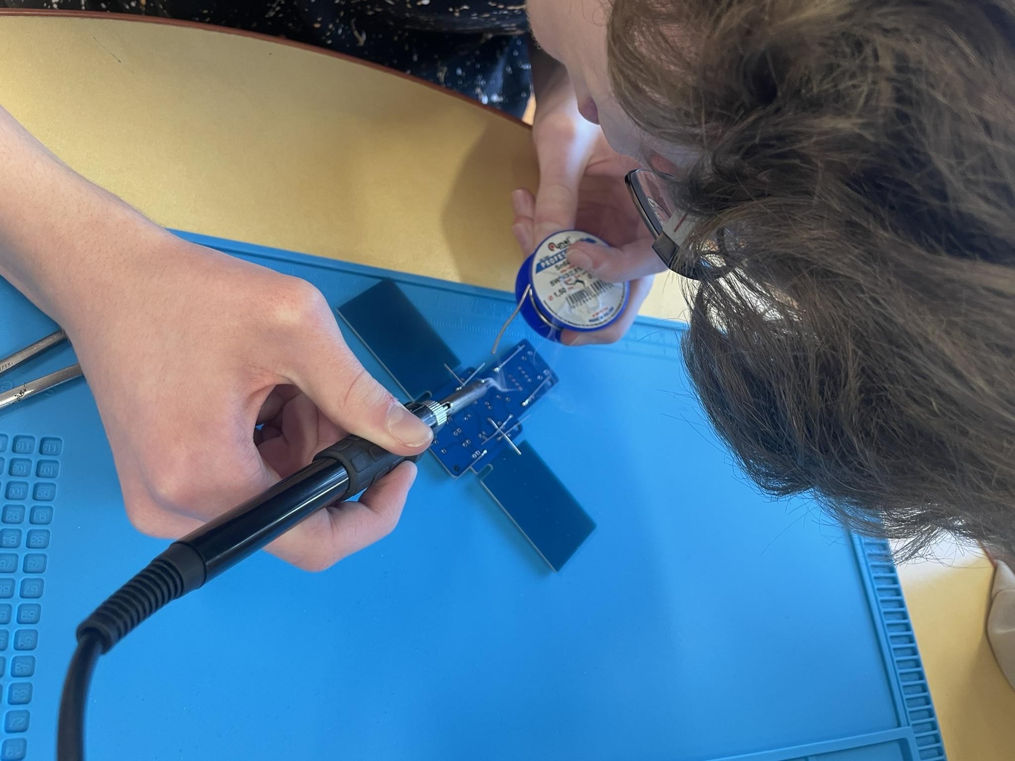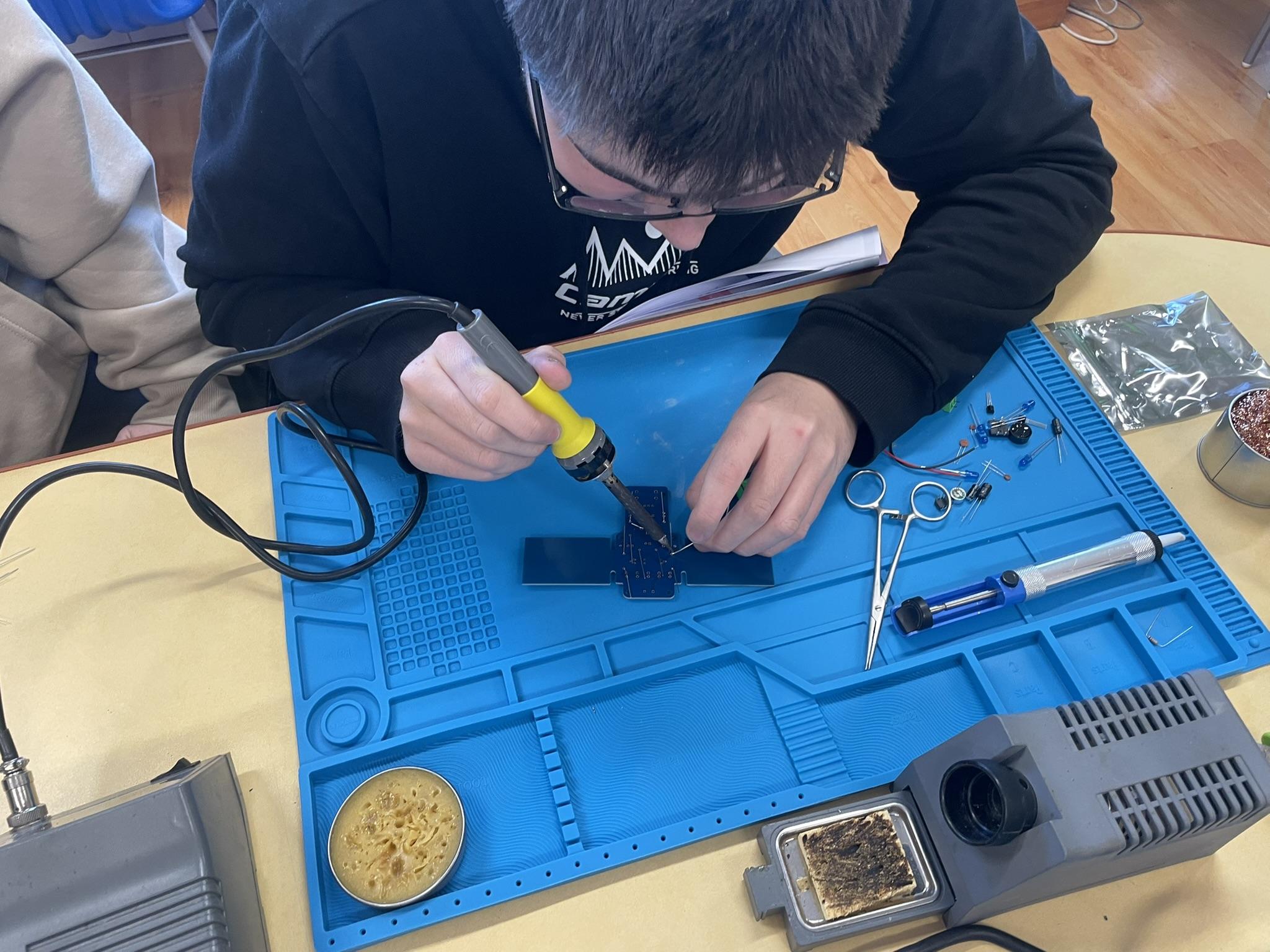 Uczniowie podczas realizacji ogólnopolskiego projektu, budowy klucza telegraficznego i montażu elementów elektronicznych w płytce PCB. Doświadczenie użycia lutownic na zajęciach zapewne wpisze się na długo w pamięci uczniów.