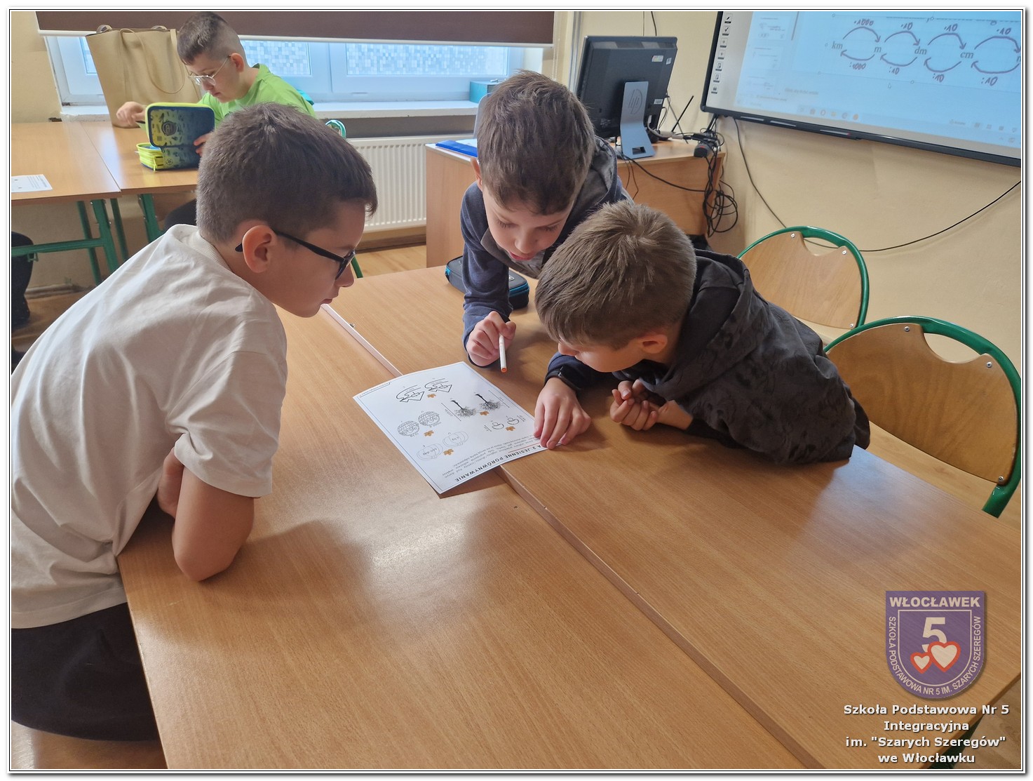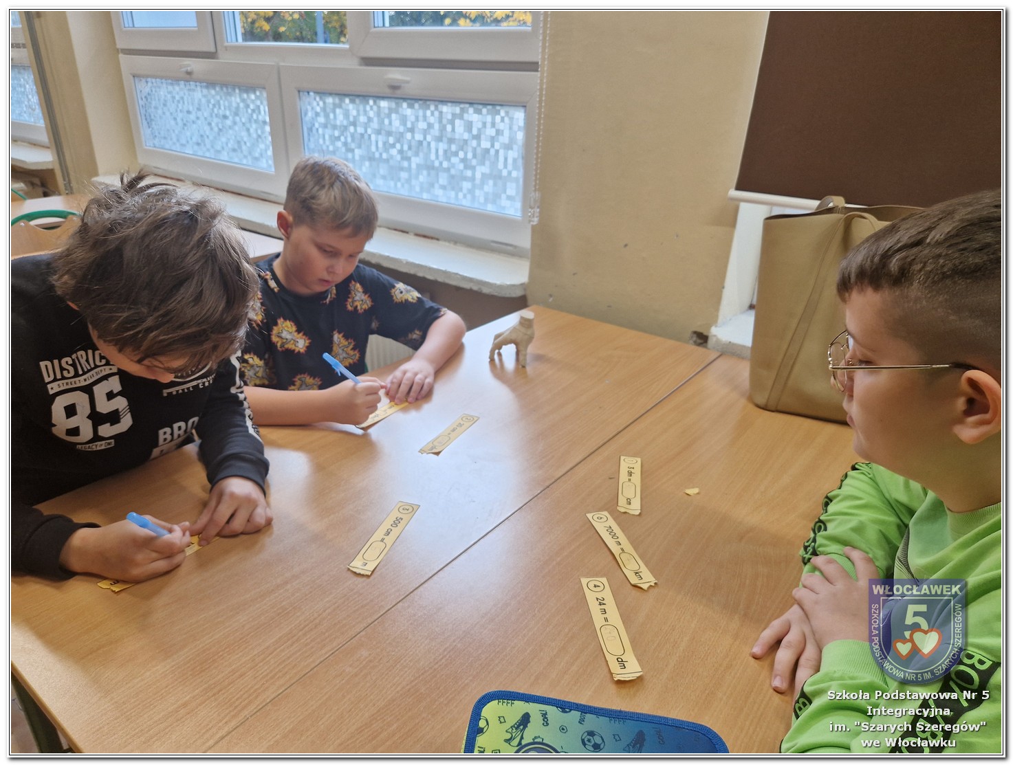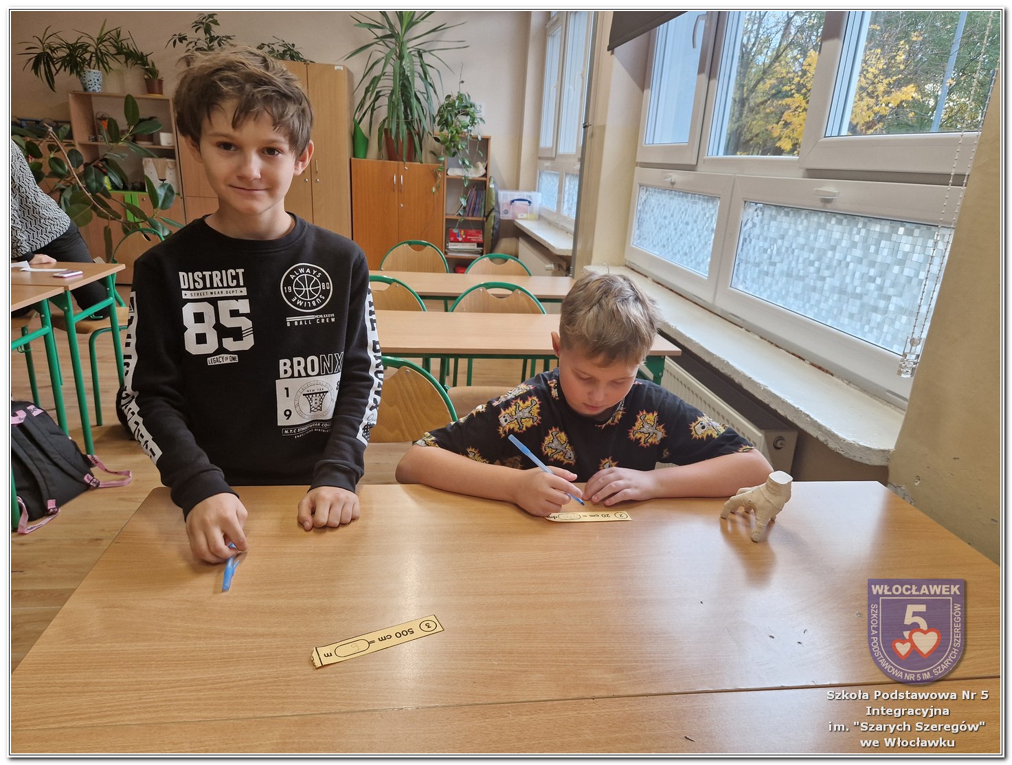 Uczniowie klas IV – V brali udział w warsztatach pt. „Przeliczanie jednostek długości i masy”, zrealizowanych w ramach projektu „Mierzymy świat – matematyka w naturze”, sfinansowanego przez Fundację mBanku w programie mSilnia. W zajęciach uczestniczyli uczniowie klas IV–V, którzy mieli okazję połączyć naukę z zabawą i praktycznymi doświadczeniami. Podczas warsztatów uczniowie poznawali zasady zamiany jednostek długości i masy, a następnie wykorzystywali tę wiedzę w atrakcyjnych ćwiczeniach. Układali domino matematyczne, porównywali wielkości przedmiotów związanych z jesienią, a także brali udział w sztafecie zadaniowej, która dostarczyła wiele emocji – element rywalizacji sprawił, że przeliczanie jednostek było nie tylko pożyteczne, ale i pełne wrażeń. Nie zabrakło również elementów interaktywnych – uczniowie wzięli udział w zabawie online Kahoot, utrwalając poznane jednostki. Następnie wcielili się w rolę „poszukiwaczy”, uzupełniając specjalną kartę i znajdując w klasie przedmioty o określonej wielkości. Wszystkie zadania rozwijały logiczne myślenie, spostrzegawczość i pracę zespołową, wprowadzając przy tym element rywalizacji i zabawy. Warsztaty były doskonałą okazją do praktycznego wykorzystania matematyki w codziennych sytuacjach i pokazania, że nauka może być wciągająca oraz pełna ruchu. Kolejne spotkania projektowe zapowiadają nowe wyzwania i ciekawe zadania dla uczniów, które będą kontynuacją zdobywanych umiejętności.