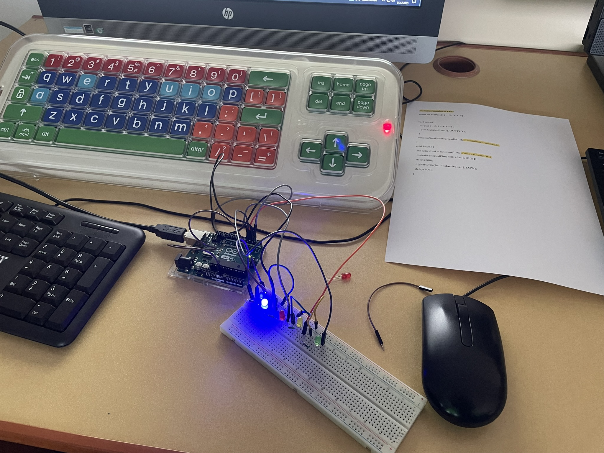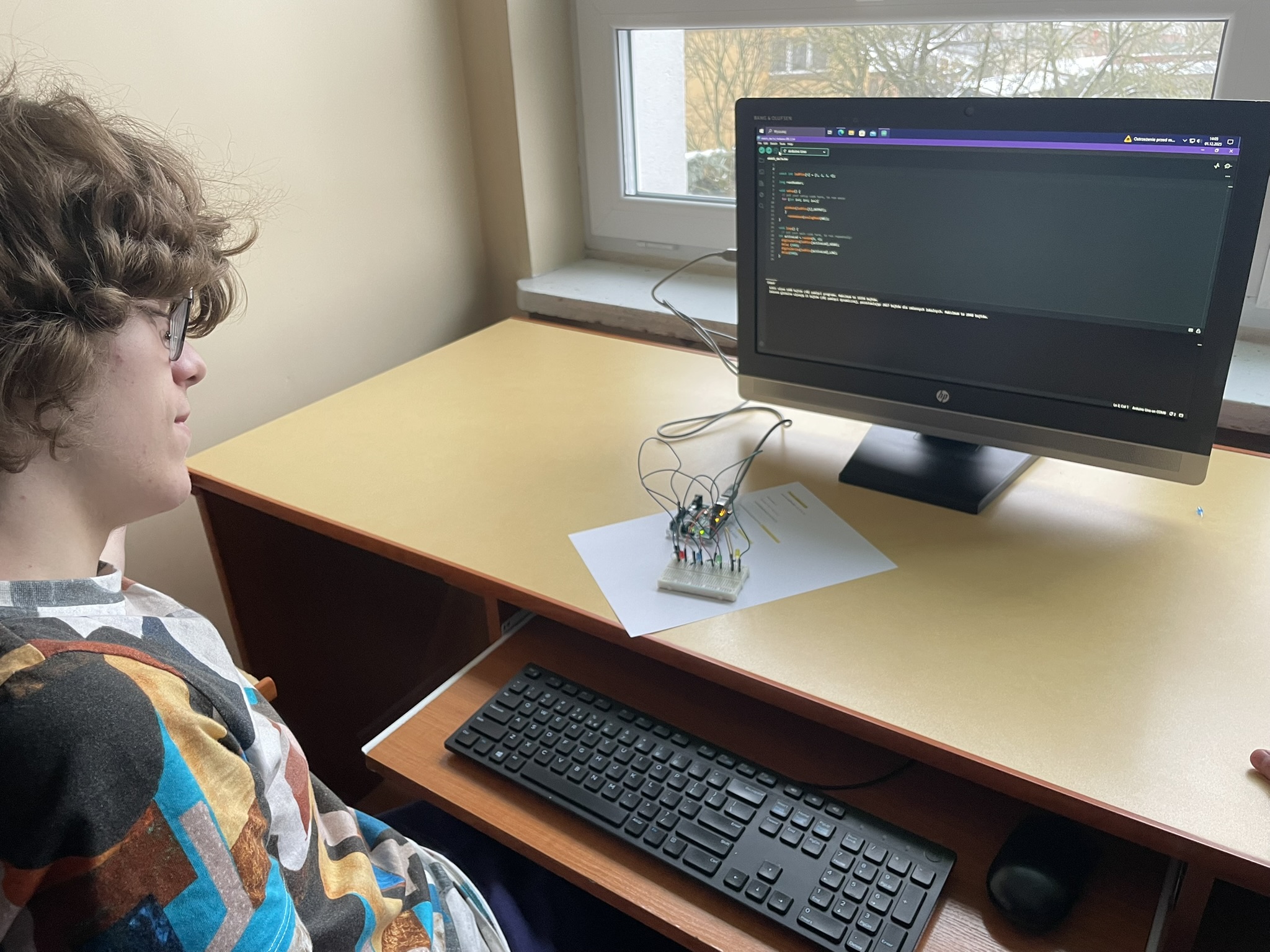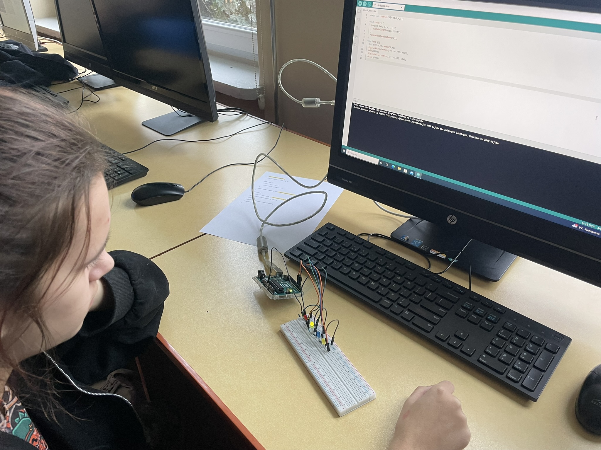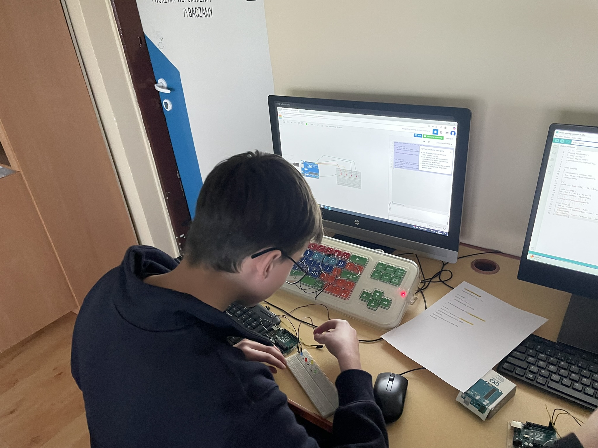 Podczas zajęć uczniowie pracowali z płytką Arduino Uno, przygotowując program sterujący czterema diodami LED. Zbudowali prosty układ elektroniczny na płytce stykowej oraz zaprogramowali sekwencje zapalania diod. W szkielecie programu wykorzystano funkcję randomSeed(), dzięki czemu diody zapalały się w sposób losowy. Ćwiczenie pozwoliło uczniom przećwiczyć podstawy programowania mikrokontrolerów, losowania liczb oraz łączenia elementów elektronicznych w praktyce.