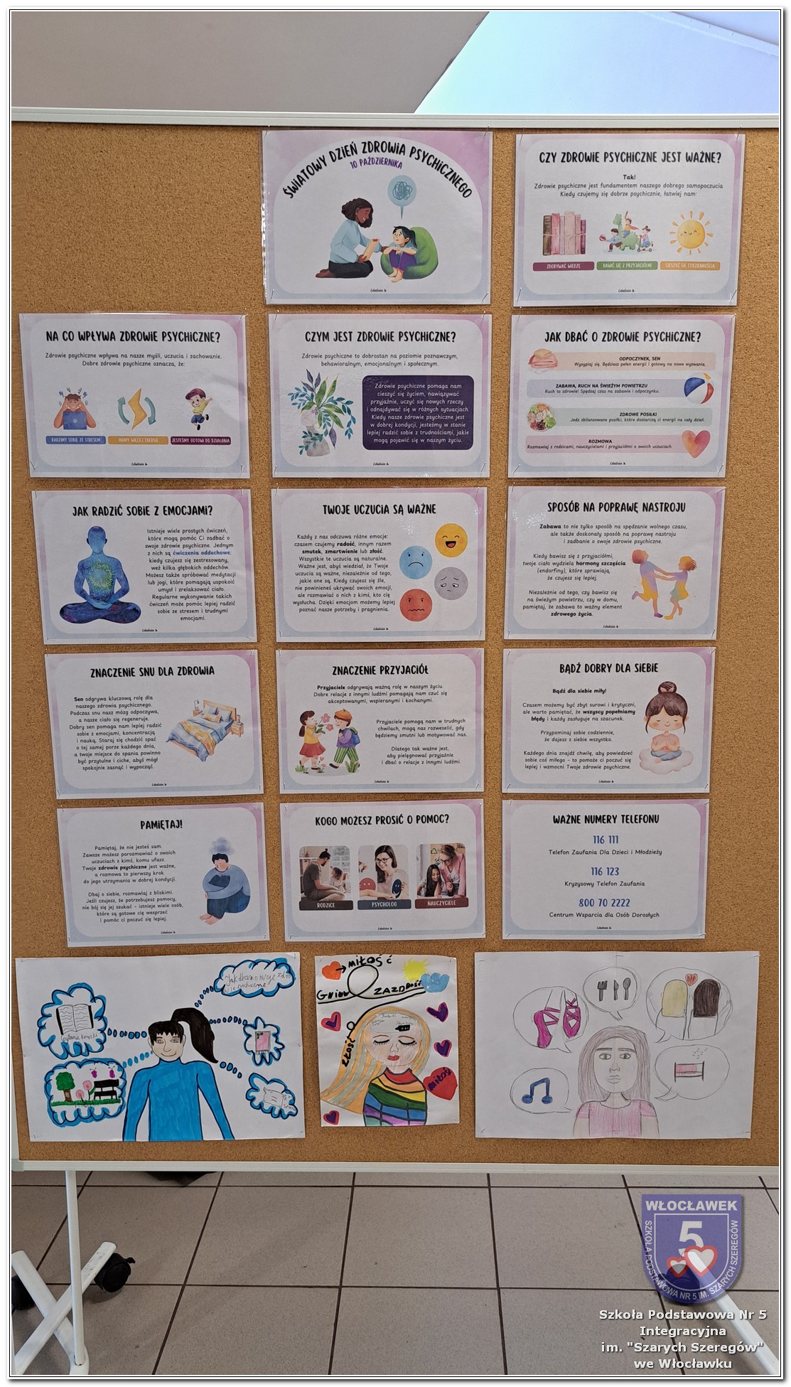 W dniach 06.10 – 13.10.2025 psycholog szkolny p. Joanna Giergielewicz przeprowadziła pogadanki z uczniami wszystkich klas I - VIII na temat zdrowia psychicznego. Młodsi uczniowie rozmawiali z psychologiem szkolnym o tym czym jest zdrowie, jak radzić sobie z trudnymi emocjami i gdzie szukać pomocy, kiedy nie radzimy sobie z emocjami lub mamy jakiś problem. Starsi uczniowie dyskutowali z psychologiem szkolnym o tym, jak ważne jest zdrowie psychiczne, jak o nie dbać, jakie sygnały w zachowaniu naszym lub innych osób powinny nas zaniepokoić oraz gdzie szukać pomocy w sytuacjach trudnych. W ramach Światowego Dnia Zdrowia Psychicznego został zorganizowany również konkurs pn. „Moje zdrowie psychiczne” dla klas IV - VIII.