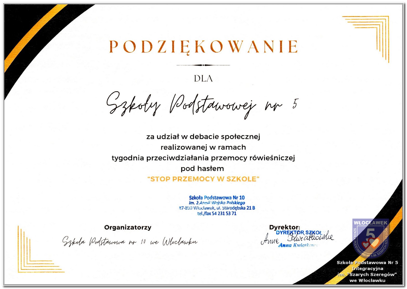 W dniu 29.09.2025r. grupa uczniów z klas VII wzięła udział w debacie społecznej STOP PRZEMOCY W SZKOLE zorganizowanej przez Szkołę Podstawową nr 10 we Włocławku w ramach Tygodnia o Przeciwdziałaniu Przemocy Rówieśniczej. Podczas spotkania uczniowie zastanawiali się nad przyczynami i skutkami agresji w szkole, sposobami radzenia sobie z przemocą rówieśniczą i wsparciu dla osób, które takich sytuacji doświadczają. Wysłuchali również zaproszonych Gości i Ekspertów, którzy podzielili się swoją wiedzą i doświadczeniem w zakresie zapobiegania przemocy rówieśniczej.