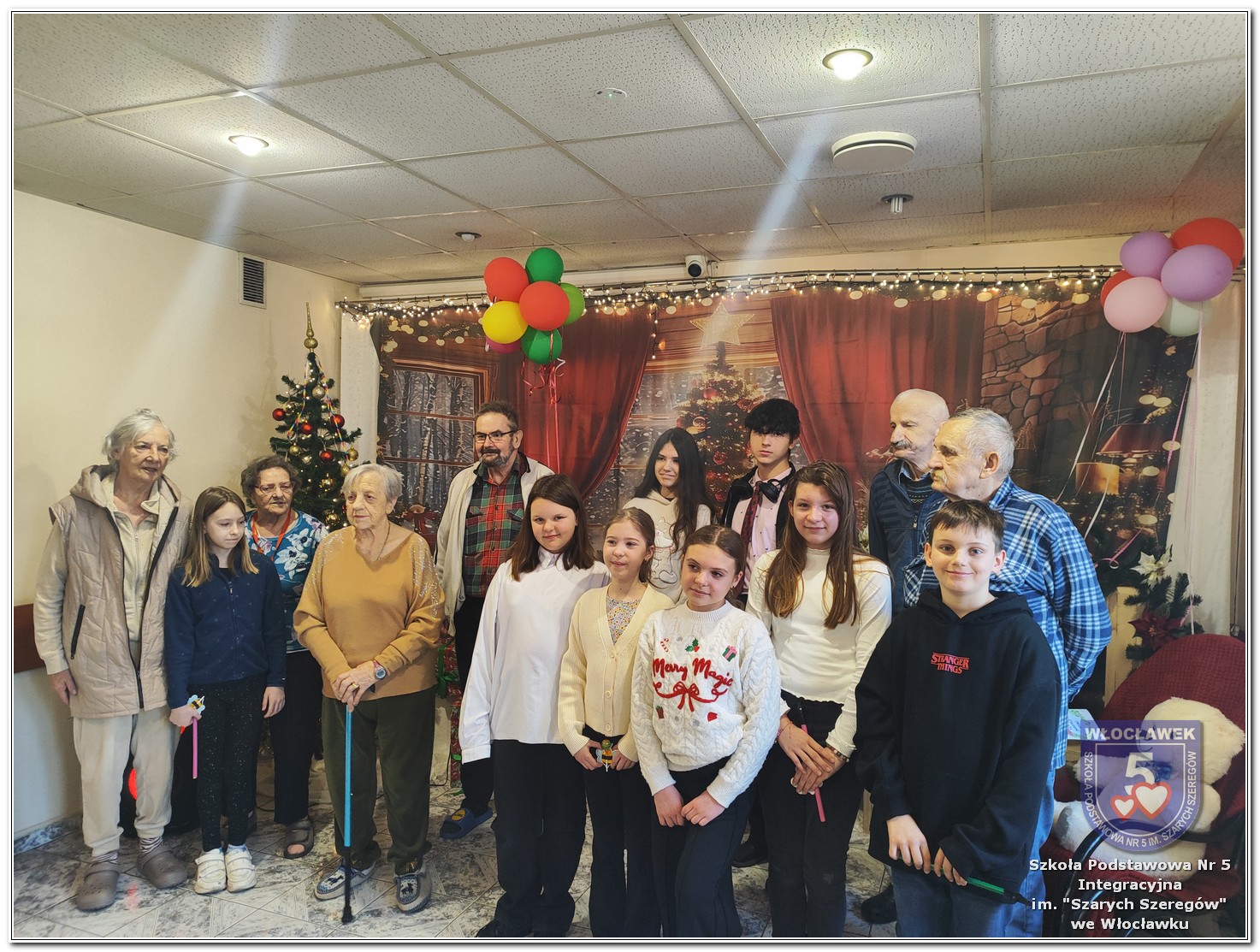 W dniu 22 stycznia 2026 r wolontariusze ze Szkolnego Koła Wolontariatu "Razem SP5" wraz z opiekunami p. Moniką Witek-Czachorowska i p. Kamilą Szkołudą udali się do Domu Pomocy Społecznej przy ulicy Nowomiejskiej 19 we Włocławku z okazji Dnia Babci i Dziadka. Celem wyjścia było kształtowanie postaw szacunku wobec osób starszych, uwrażliwienie dzieci na potrzeby seniorów oraz integracja międzypokoleniowa. Uczniowie naszej szkoły przygotowali krótki występ artystyczny - zagrali na flażoletach i zaśpiewali polskie kolędy wspólnie z seniorami. Własnoręcznie przygotowane kartki zostały wręczone mieszkańcom Domu. Seniorzy z radością i wzruszeniem przyjęli występ dzieci nagradzając je gromkimi brawami. Spotkanie przebiegało w miłej i serdecznej atmosferze. Bardzo dziękujemy za ciepłe przyjęcie p. Dyrektor Agnieszce Chmielewskiej oraz pracownikom i mieszkańcom Domu.